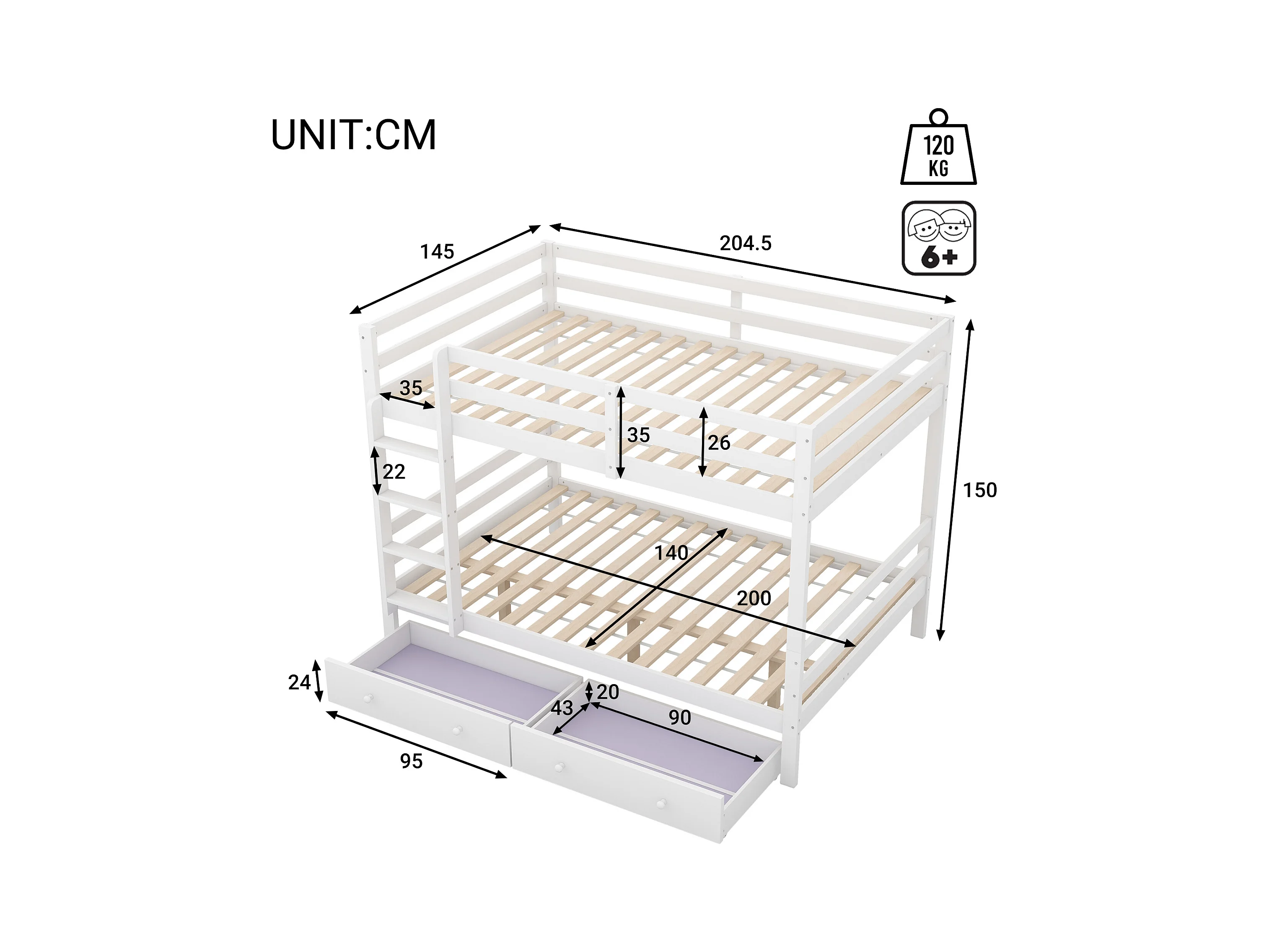 Blanc 140 * 200cm lits superposés pour enfants avec tiroirs, espace de rangement, barre de barre haute