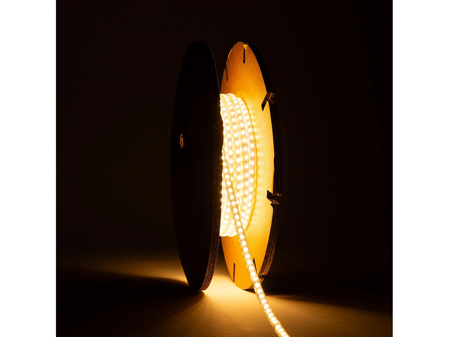 Ruban LED Dimmable 220V SMD Auto-redressement 120 LED/m BOBINE 20m 12W/m 1080lm/m Super Étroite Largeur 6.5mm Coupe 10cm IP65 2700K Blanc chaud