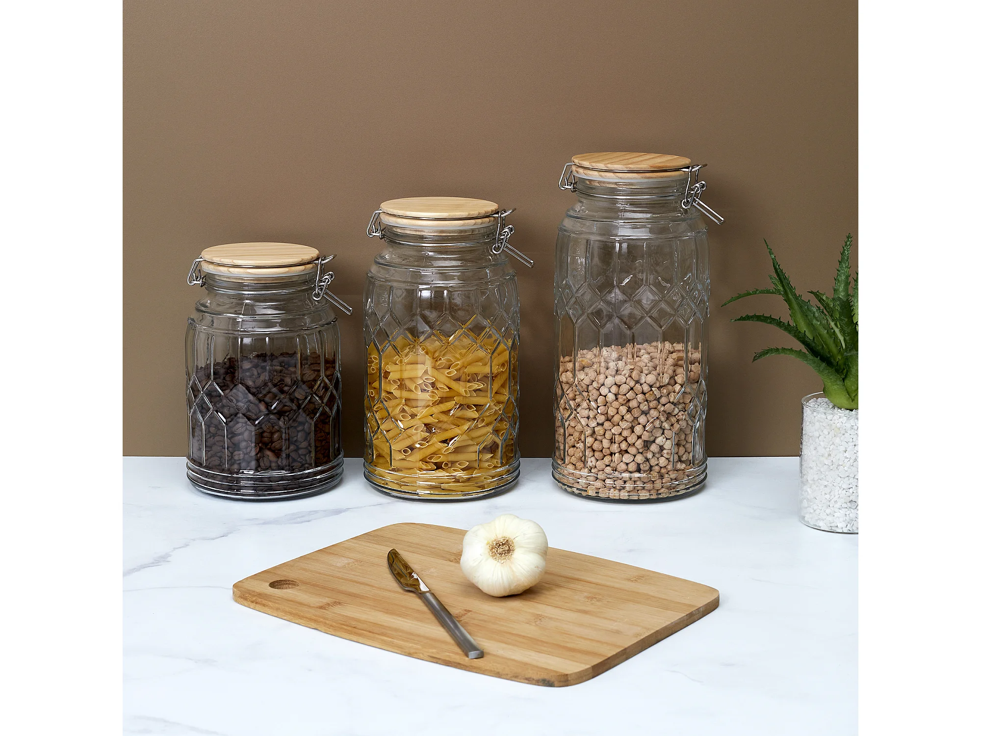 Lot de 3 Bocaux de Conservation Rond Incliné 1,3L en Verre Couvercle Bois - PLAUZ