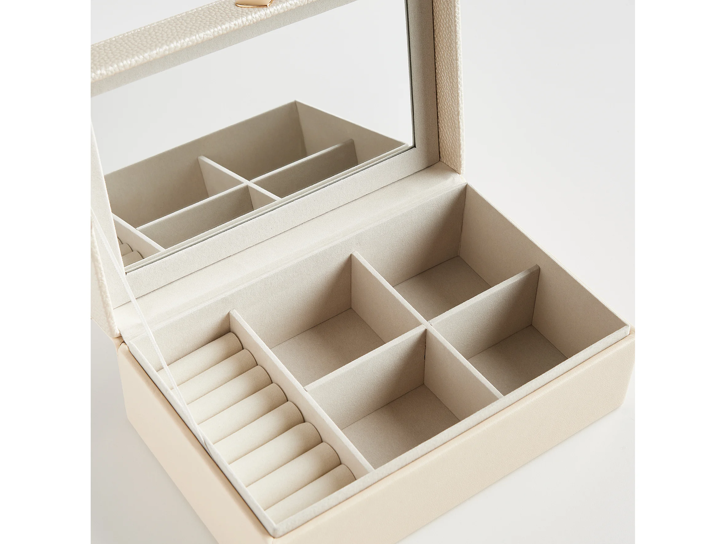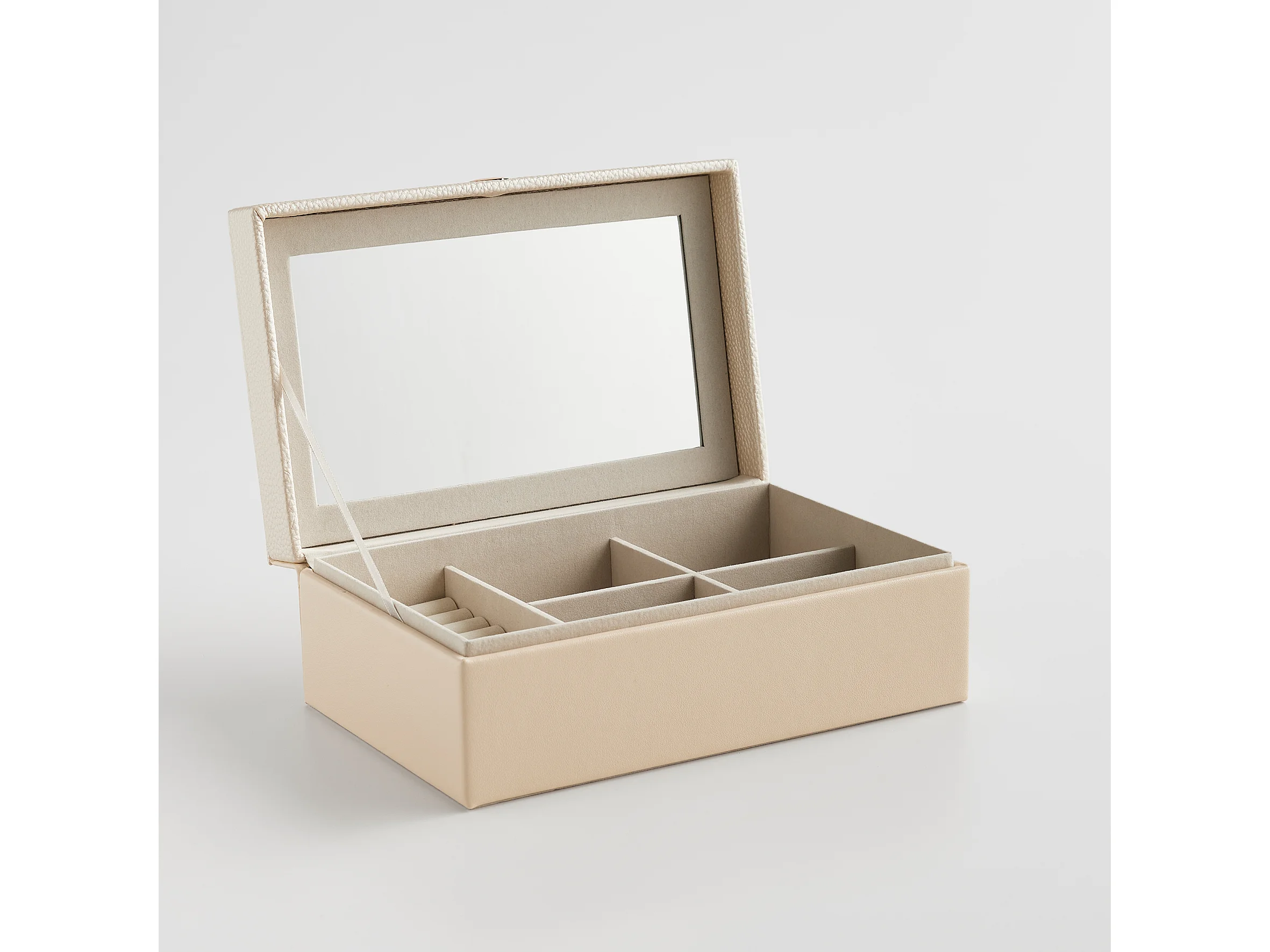 Boîte à bijoux beige avec miroir et 6 compartiments