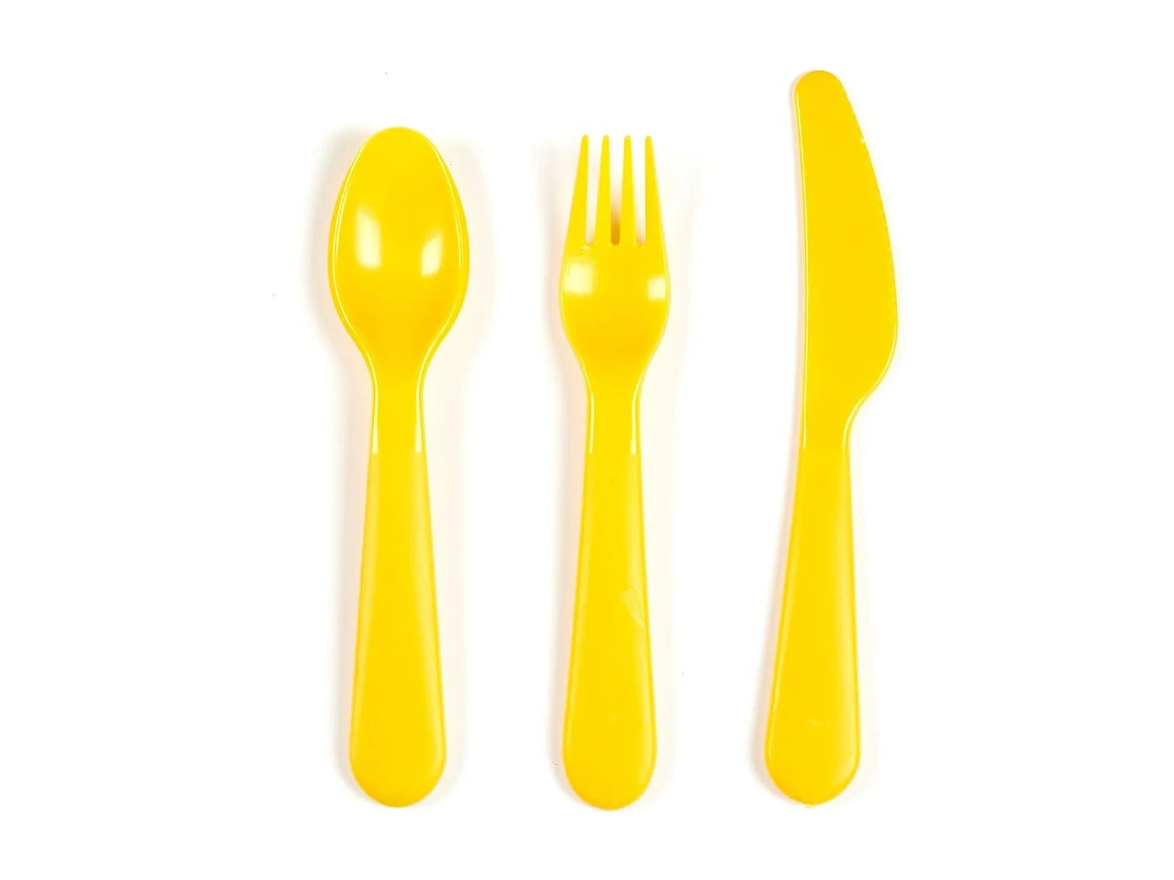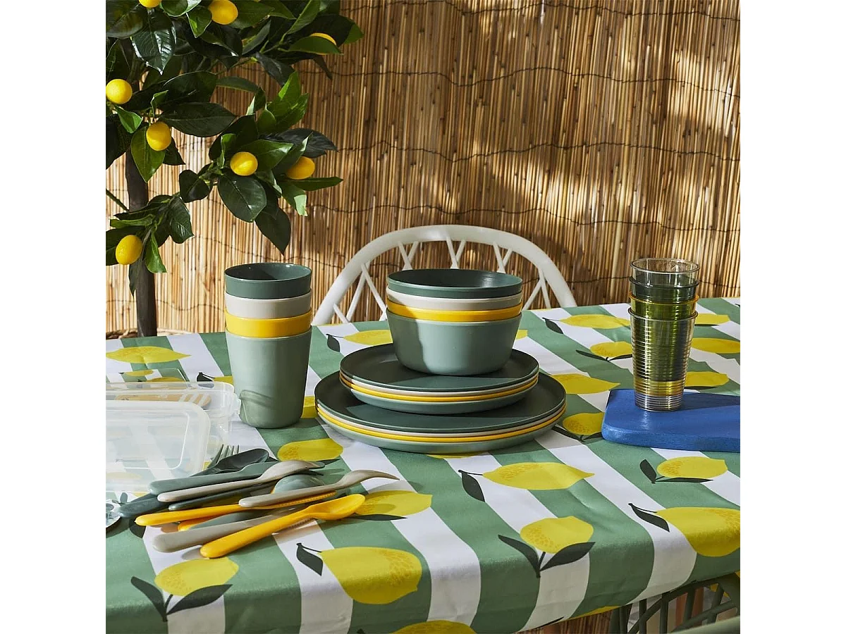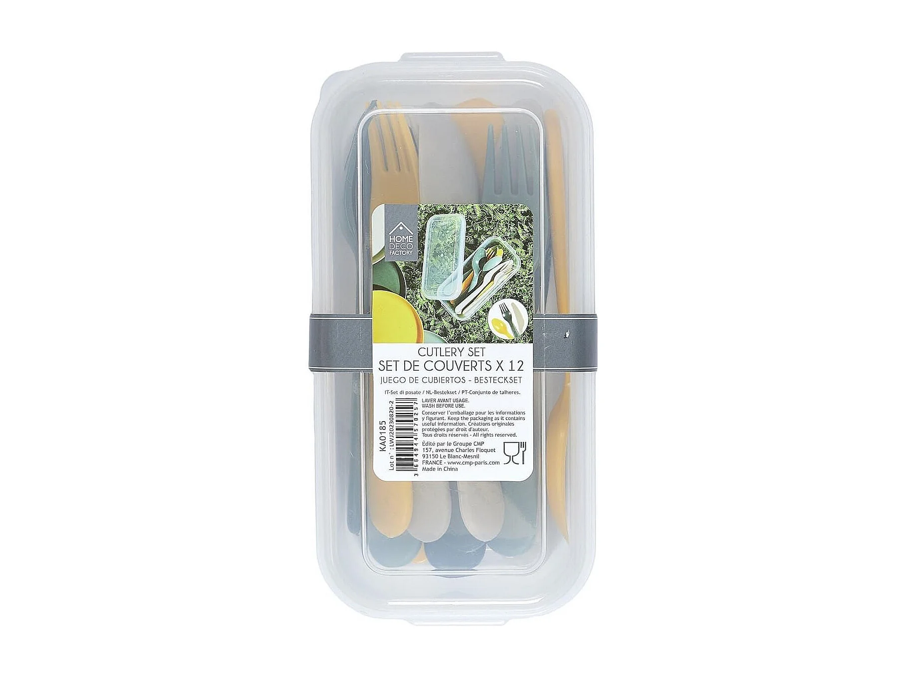 Boite de 12 couverts en plastique réutilisable au coloris vert, jaune et beige