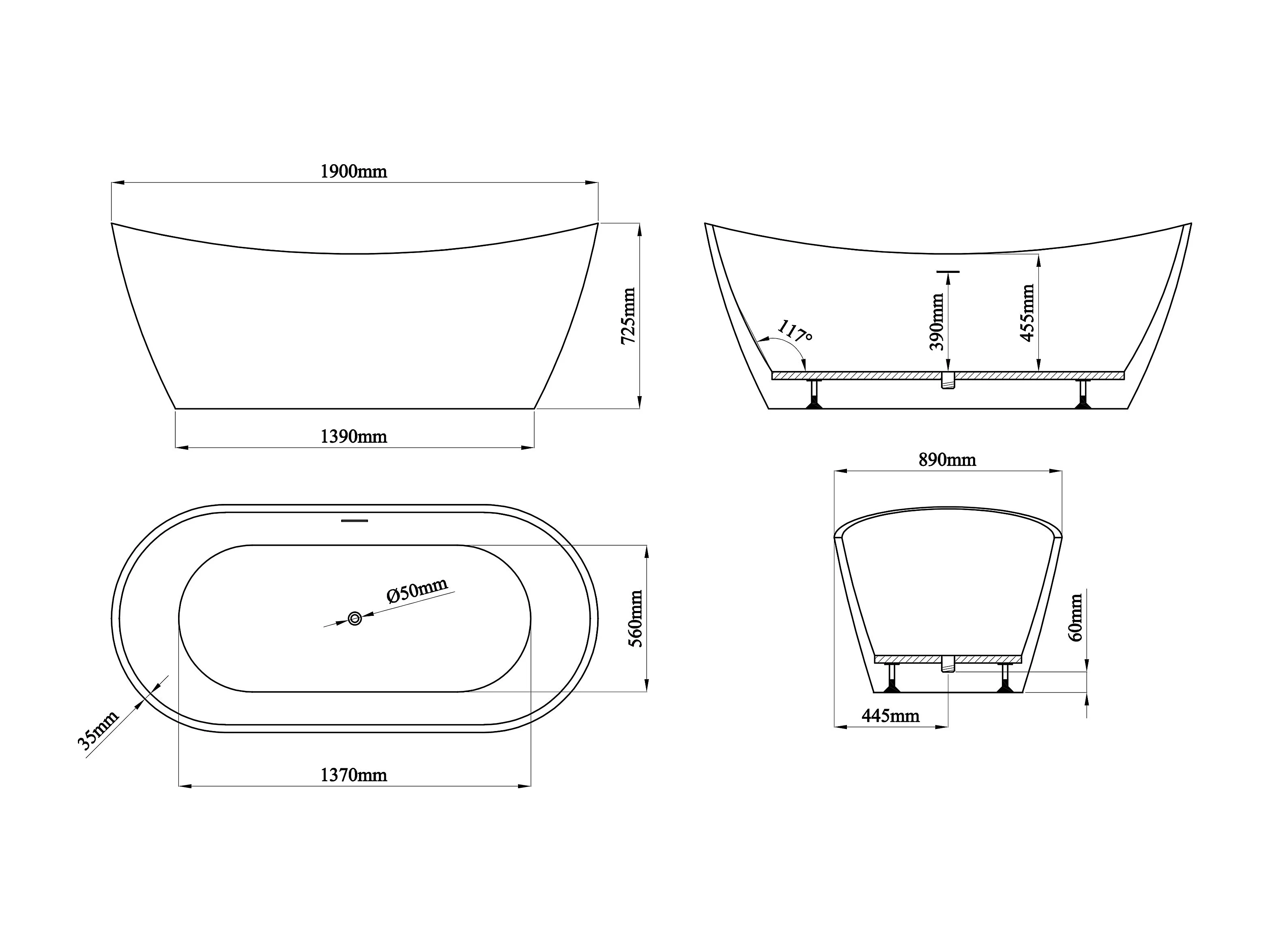 Baignoire îlot blanche - 360 L - Acrylique - 190 x 89 x 72 cm - BORAZA