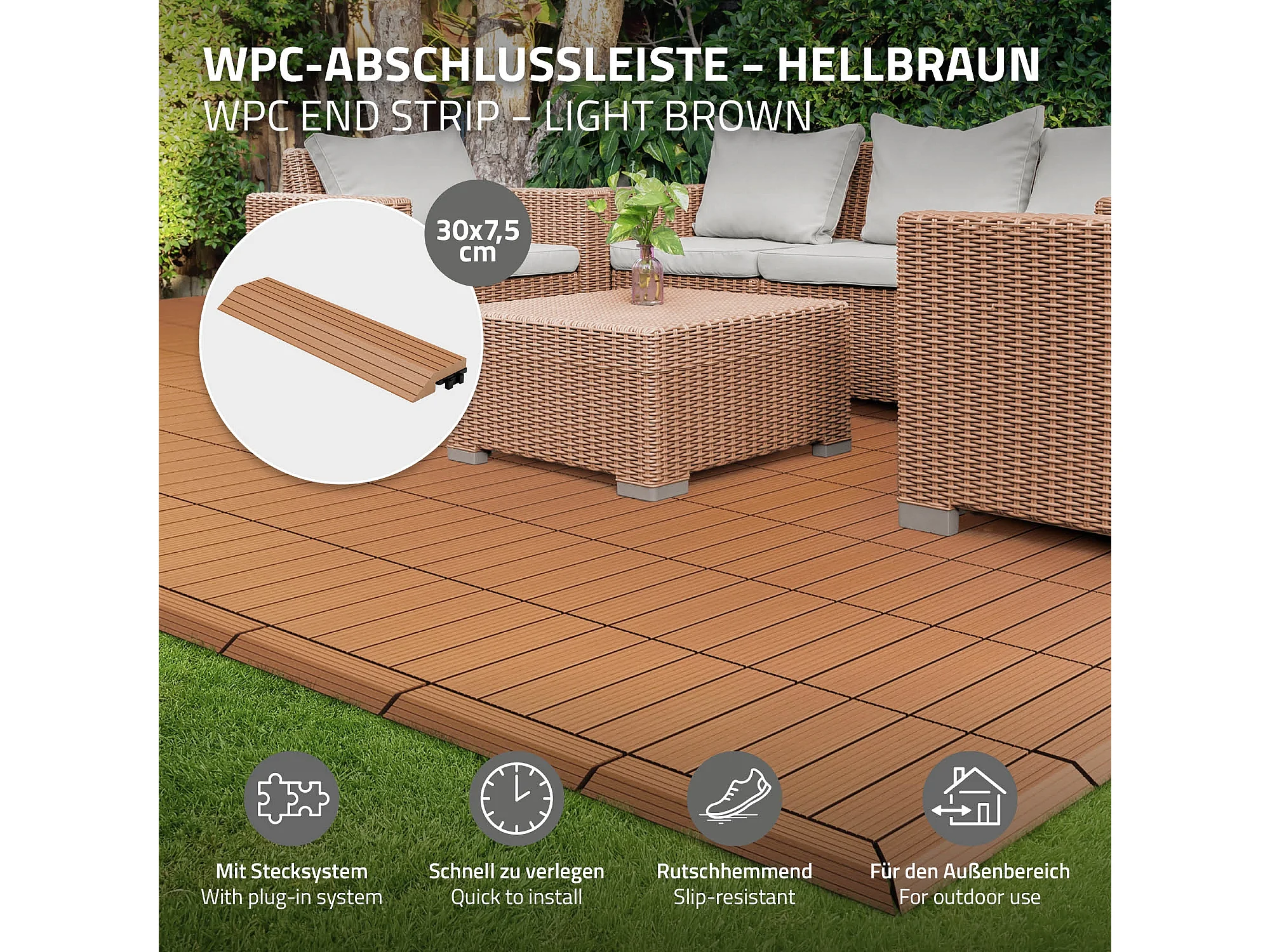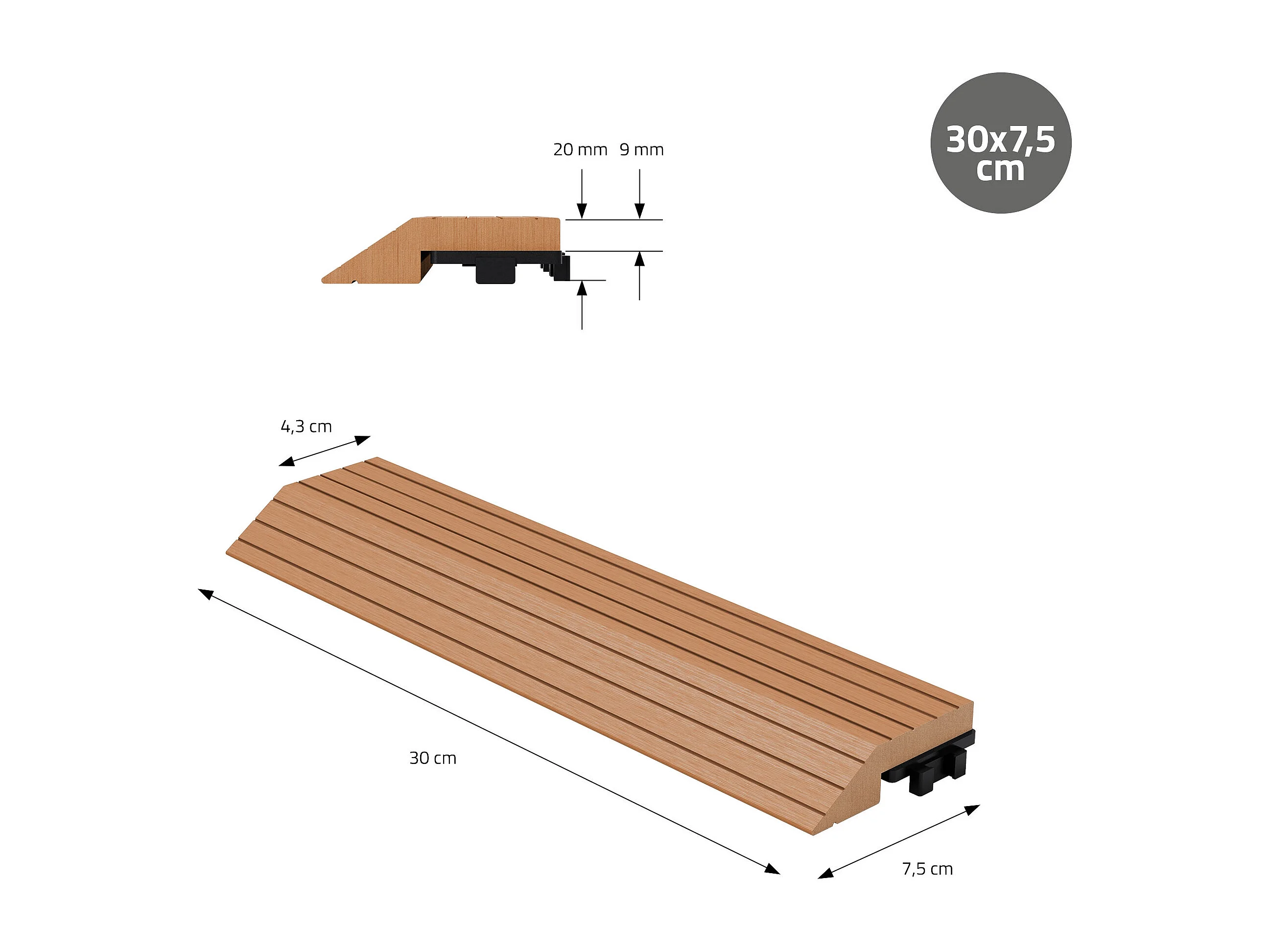 Bordure de finition coin gauche 38x2x7,5cm Brun clair Plinthe d'angle striée aspect de bois drainage et structure de support système d'encliquetage