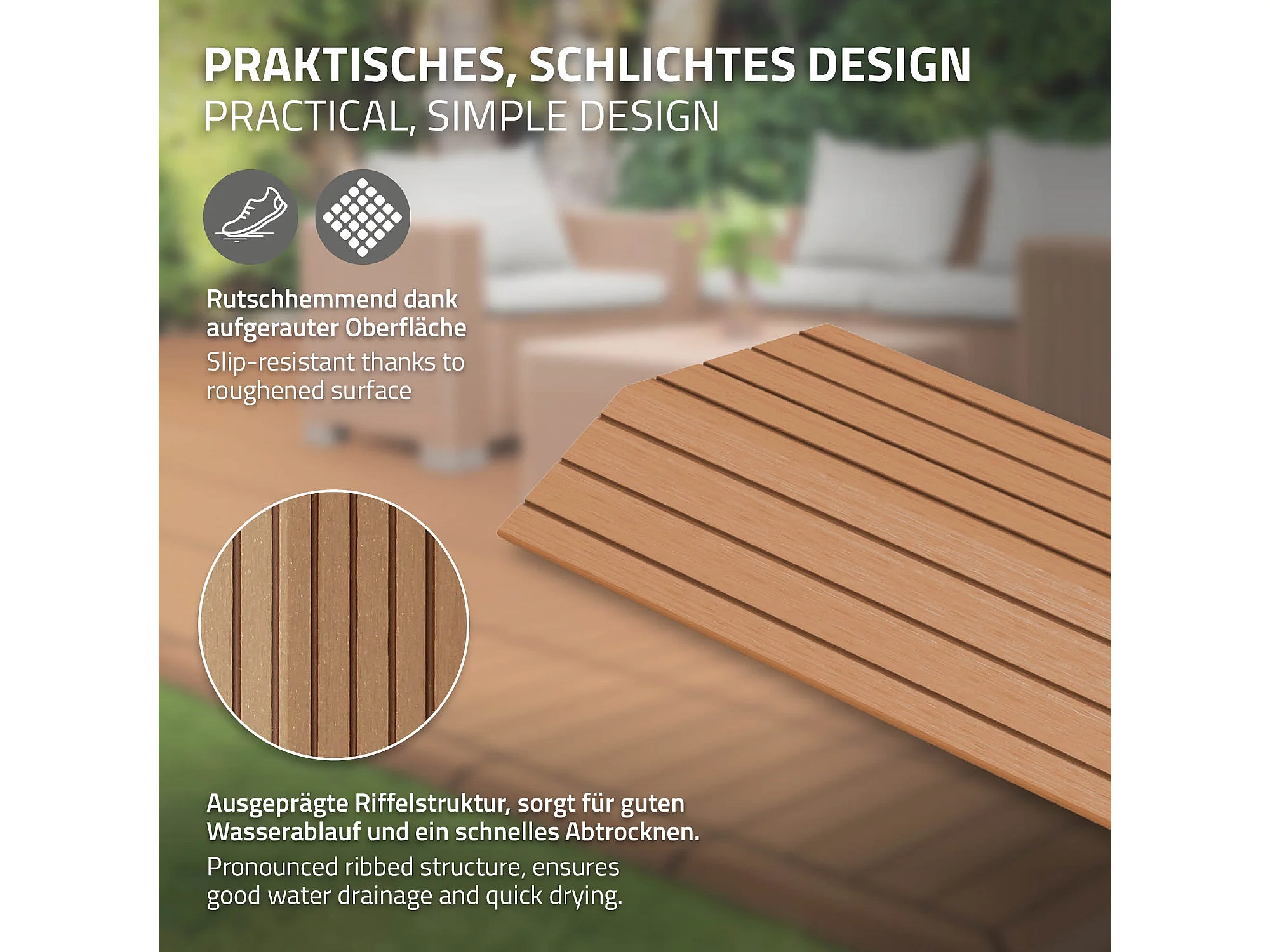 Bordure de finition angle droit 38x2x7,5cm teck Plinthe d'angle striée aspect de bois avec drainage et structure de support système d'encliquetage