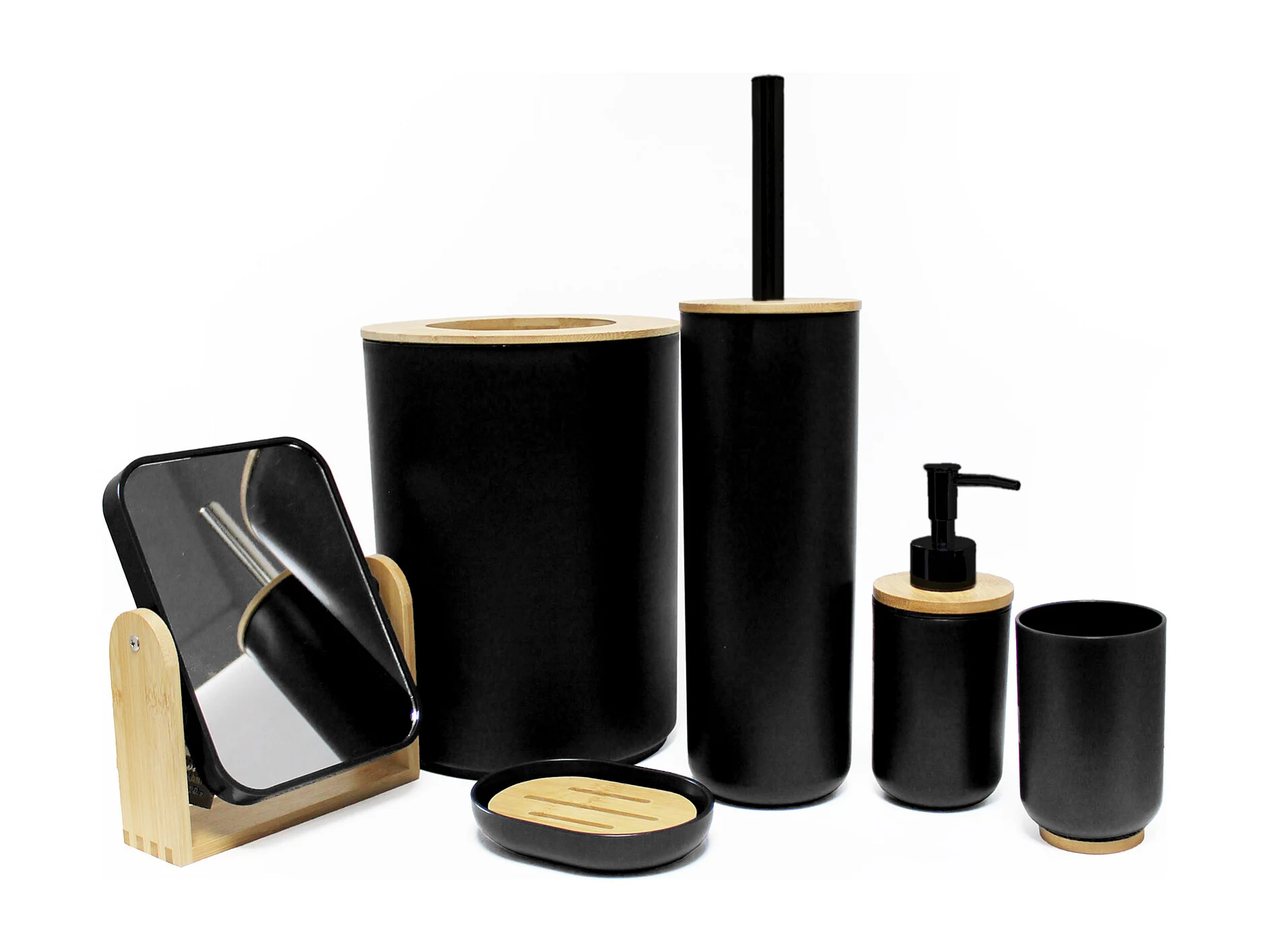 Brosse de toilette WC avec support, porte brosse WC en bambou/acier inoxydable coloris naturel/noir - Diamètre 9.5 x Hauteur 35 cm