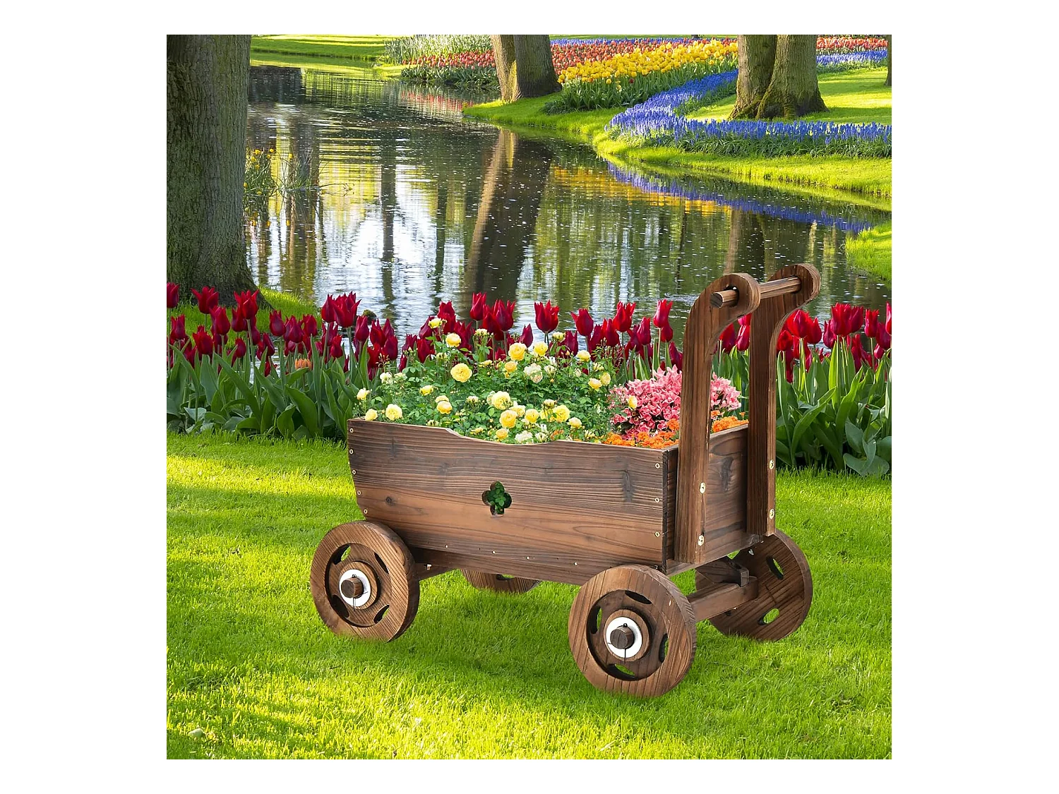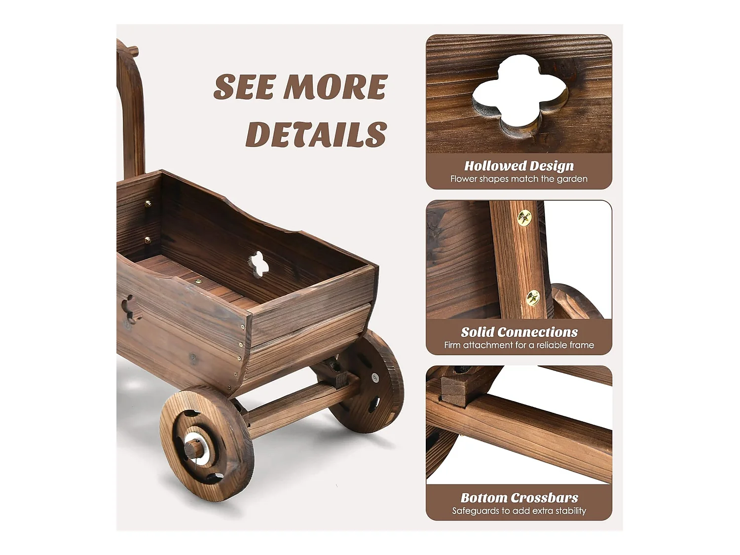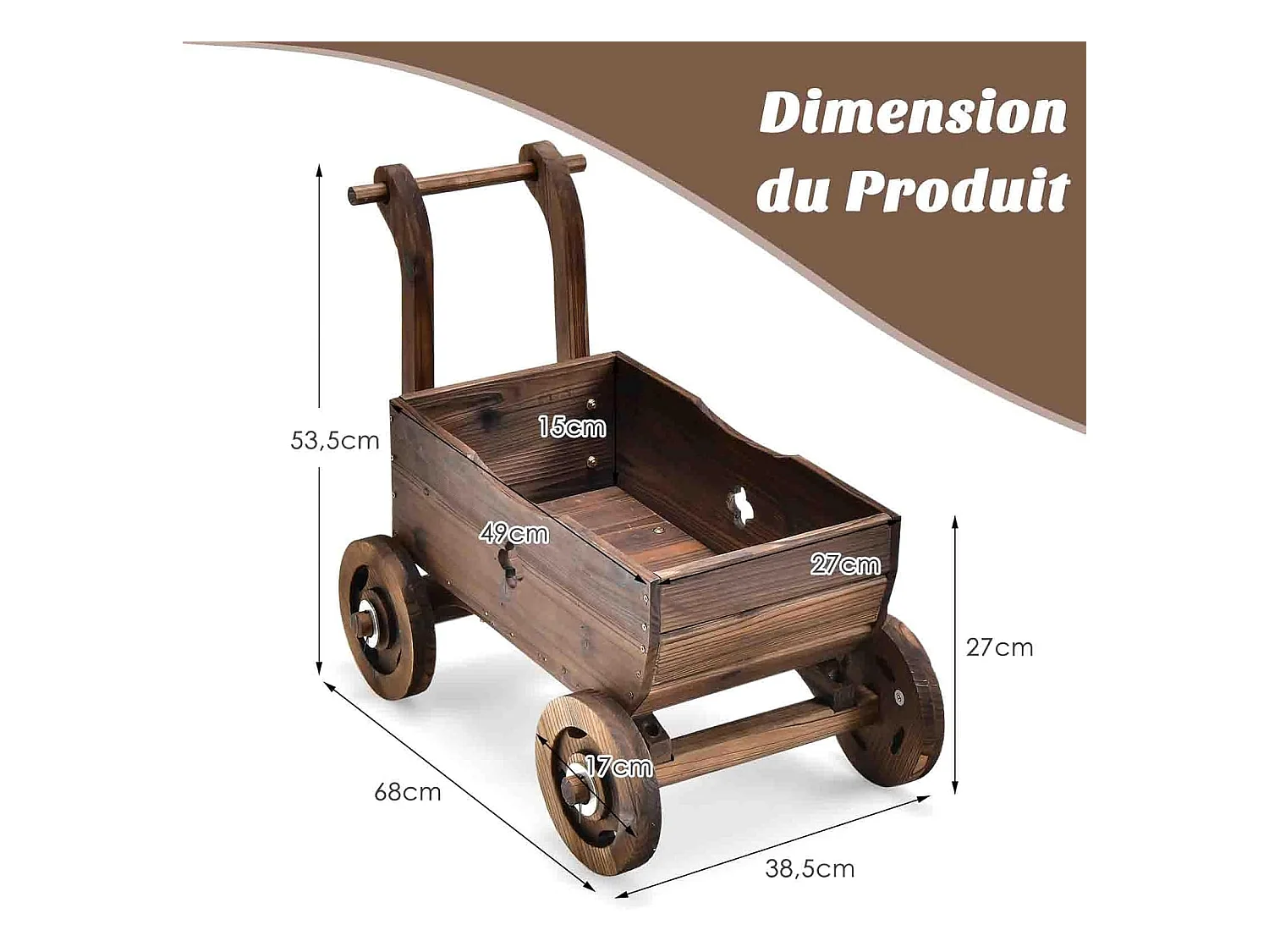 Brouette à Fleurs Jardinière en Bois de Sapin Carbonisé à Roues, Jardinière de Jardin avec Poignée et Trou de Drainage Charge 20KG, pour Patio Jardin Cour, 68 x 38,5 x 53,5 cm