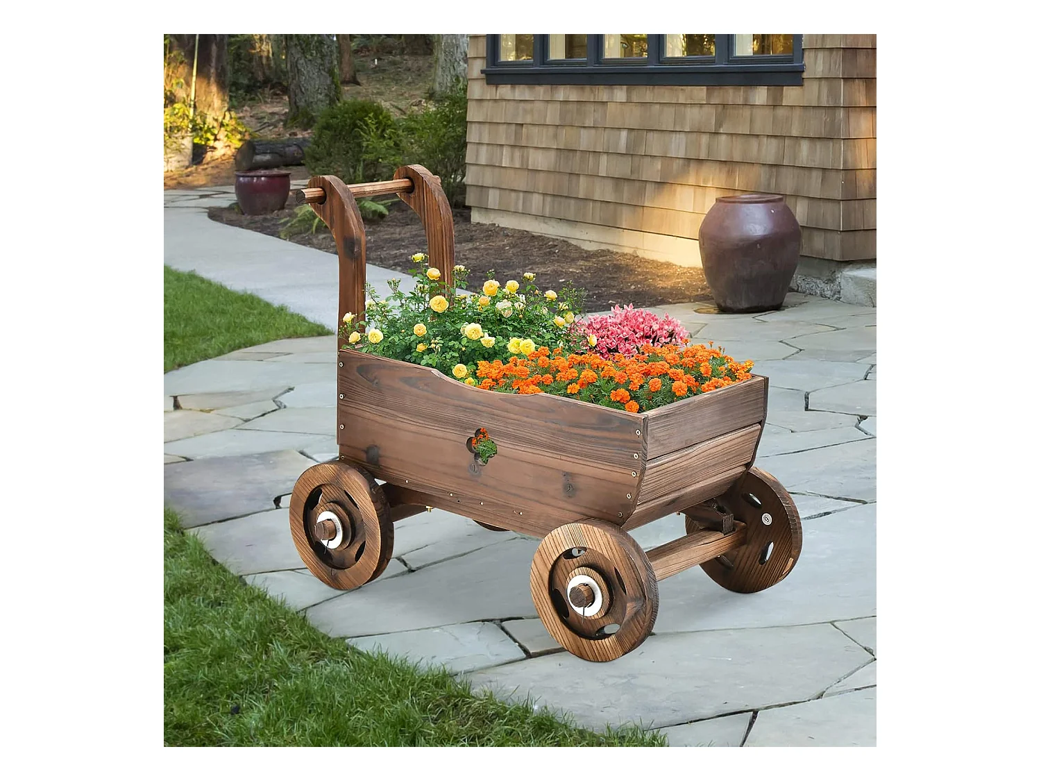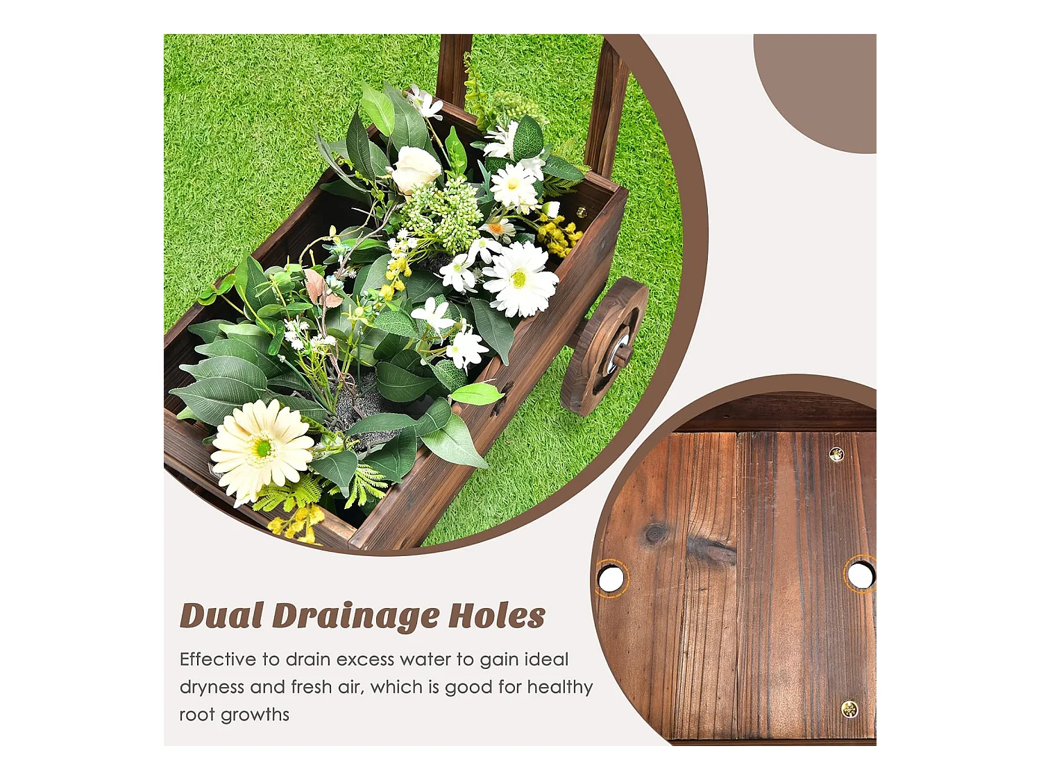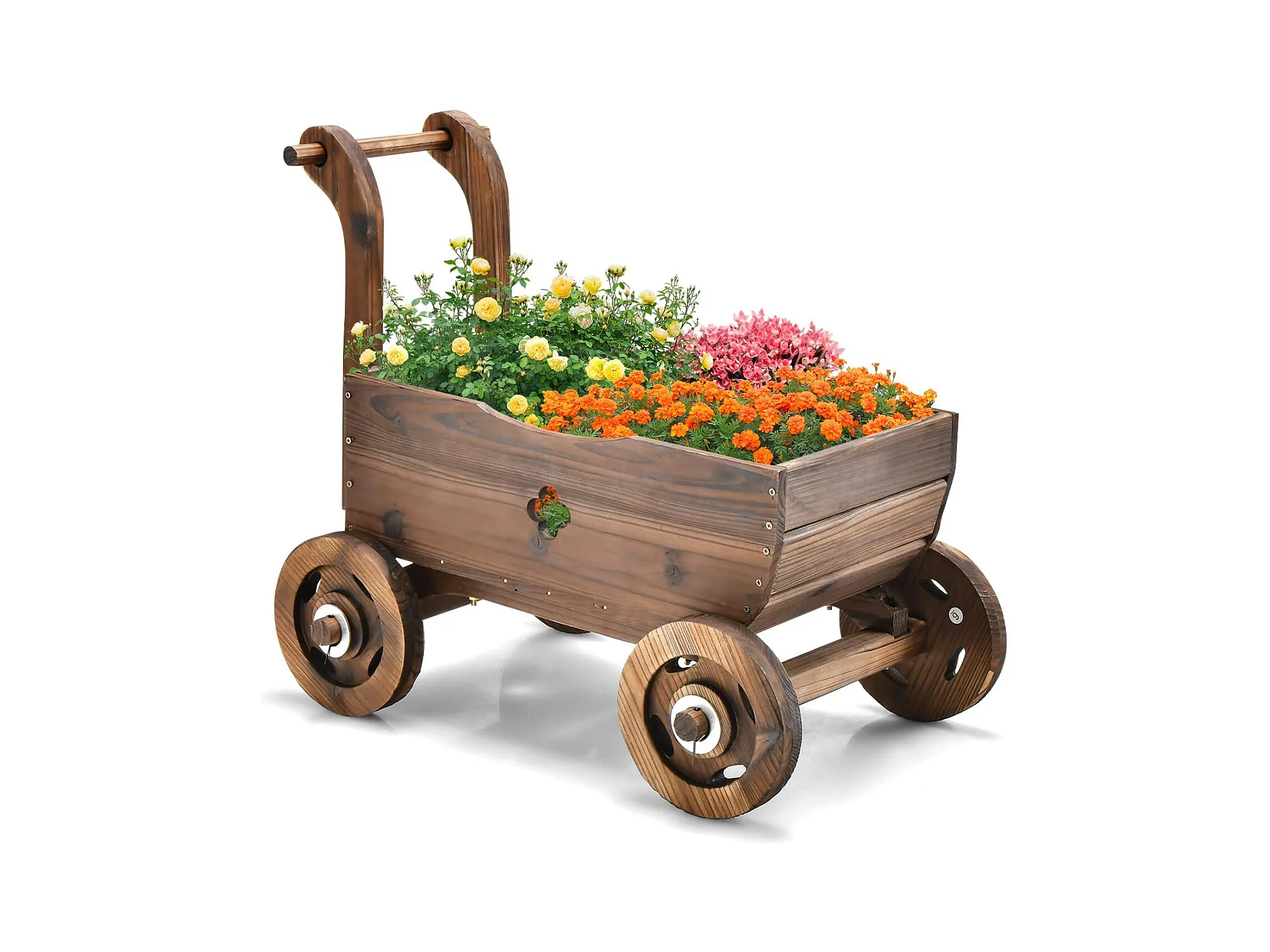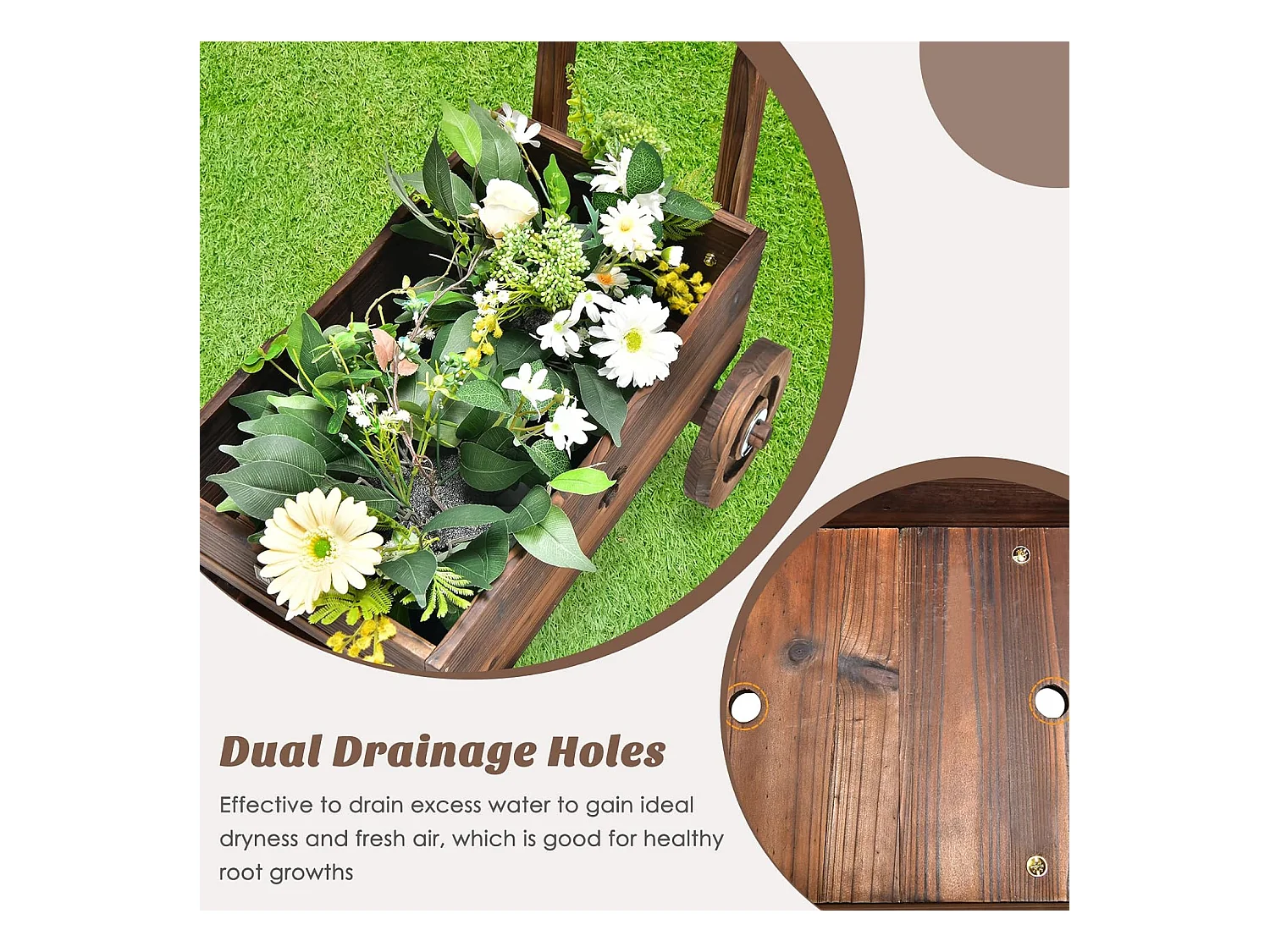 Brouette à Fleurs Jardinière en Bois de Sapin Carbonisé à Roues, Jardinière de Jardin avec Poignée et Trou de Drainage Charge 20KG, pour Patio Jardin Cour, 68 x 38,5 x 53,5 cm