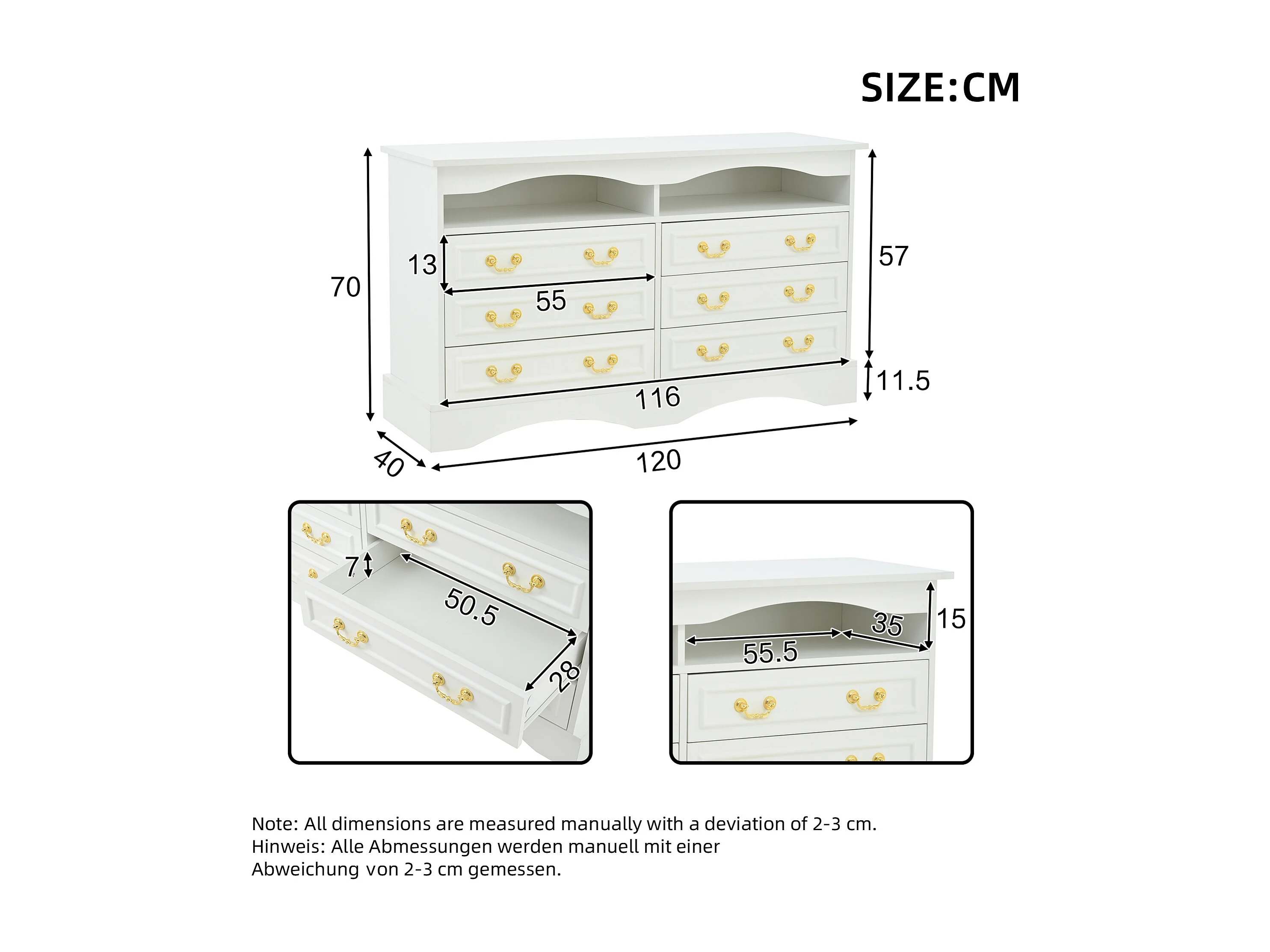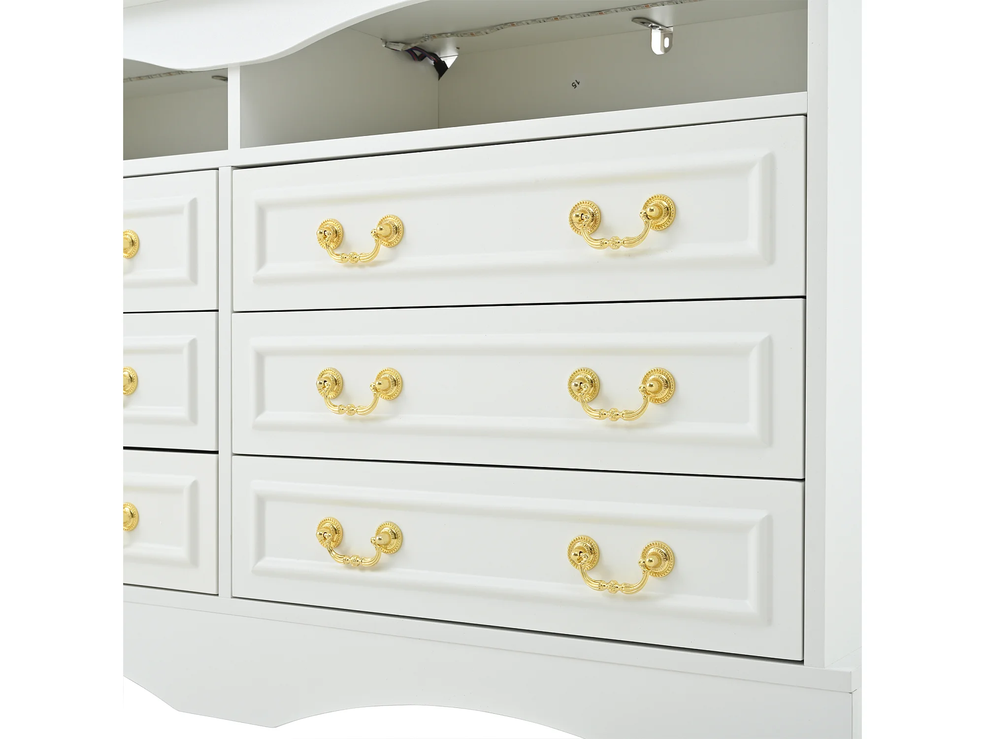 Buffet 120x40x70 cm - 6 tiroirs - avec bande lumineuse LED - rangement semi-ouvert - design rétro - blanc