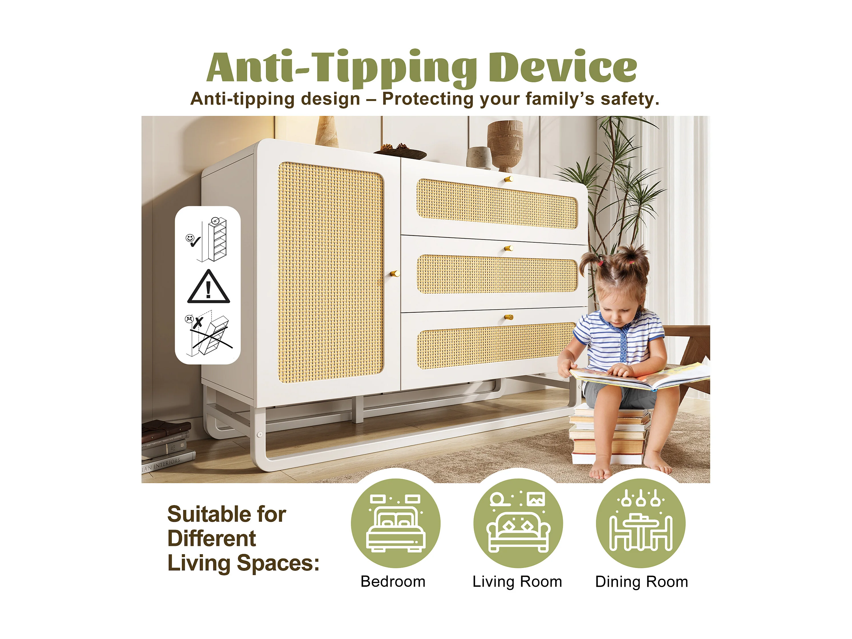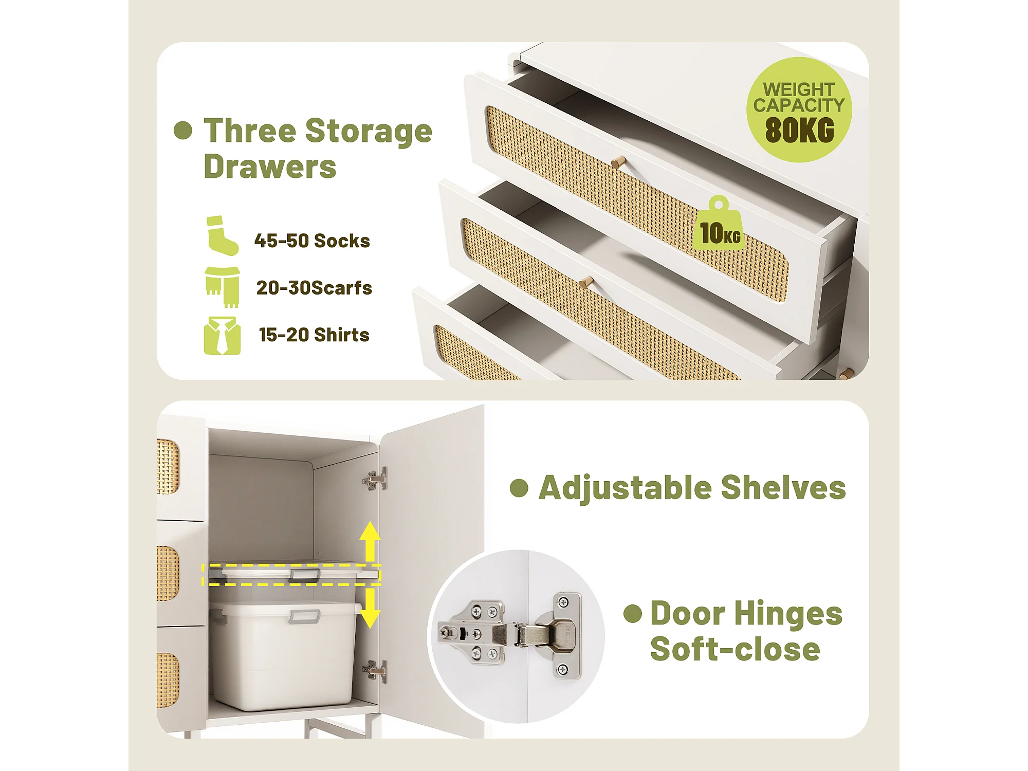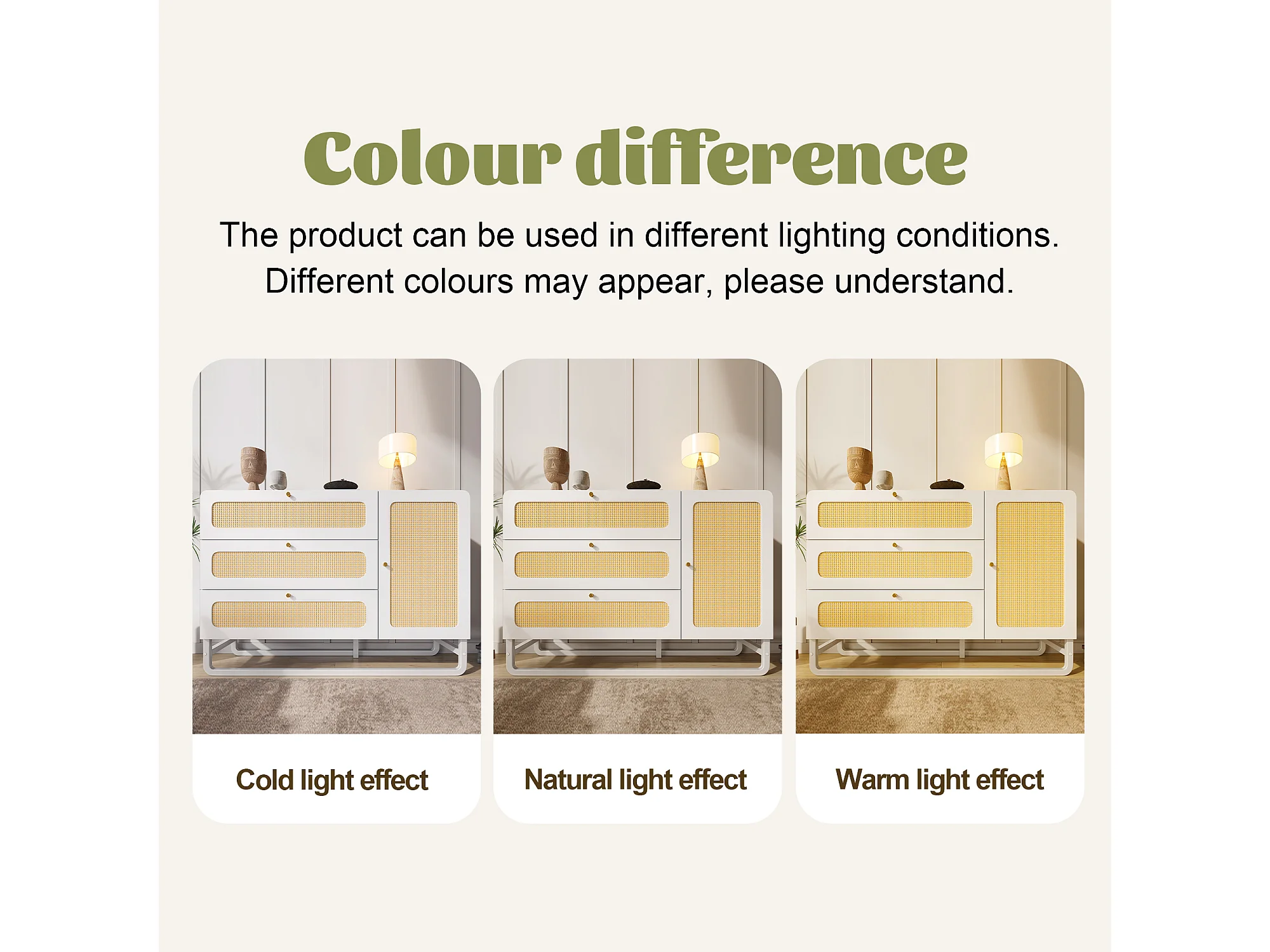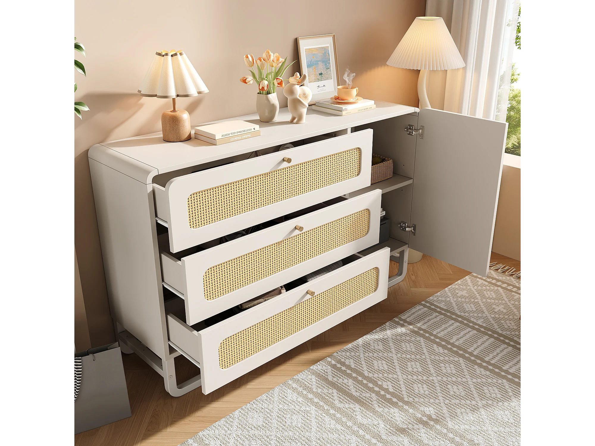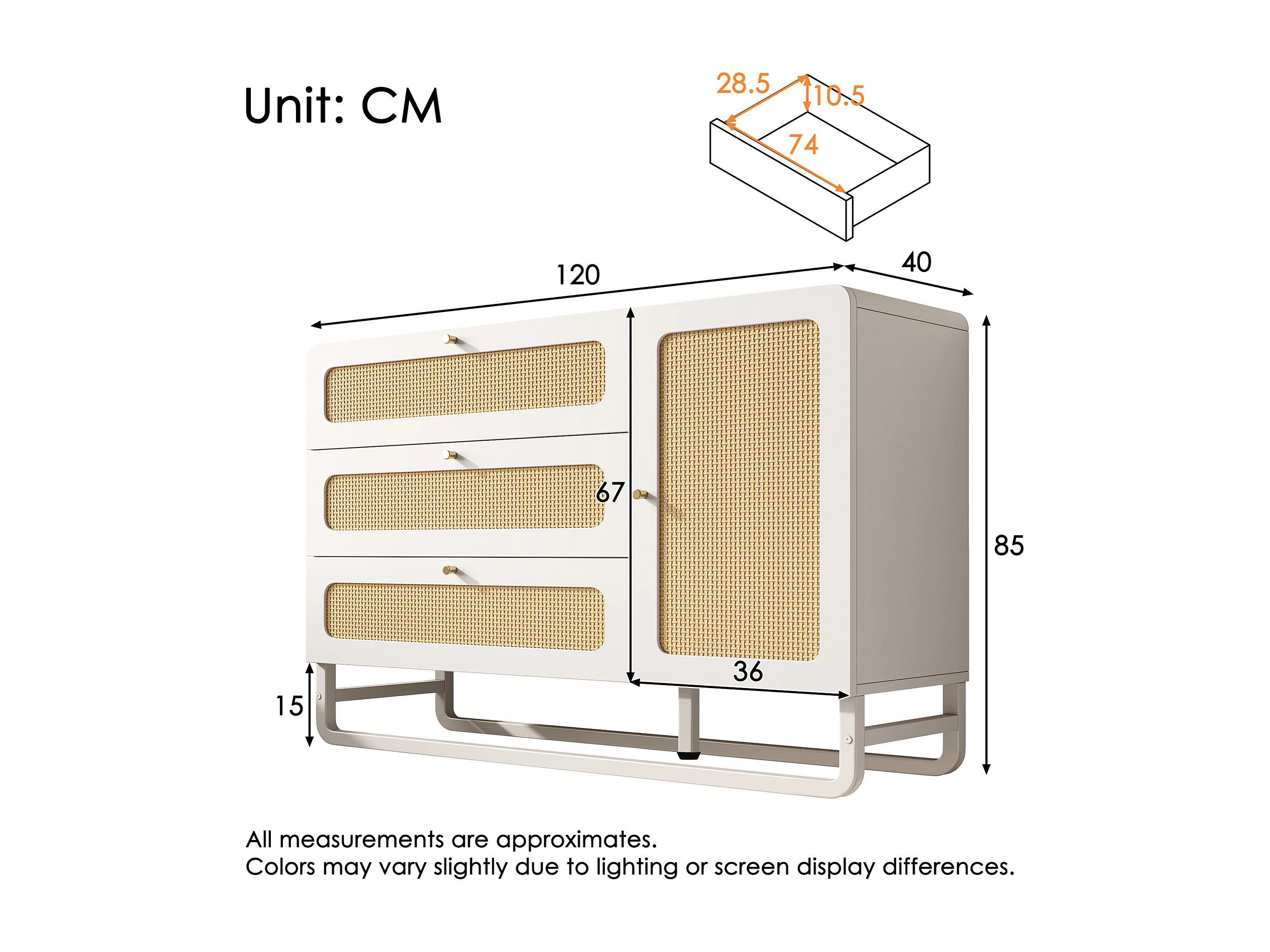 Buffet 120x40x85cm - avec 3 tiroirs en rotin et 1 porte en rotin - style campagnard - poignée en or - Blanc + Naturel