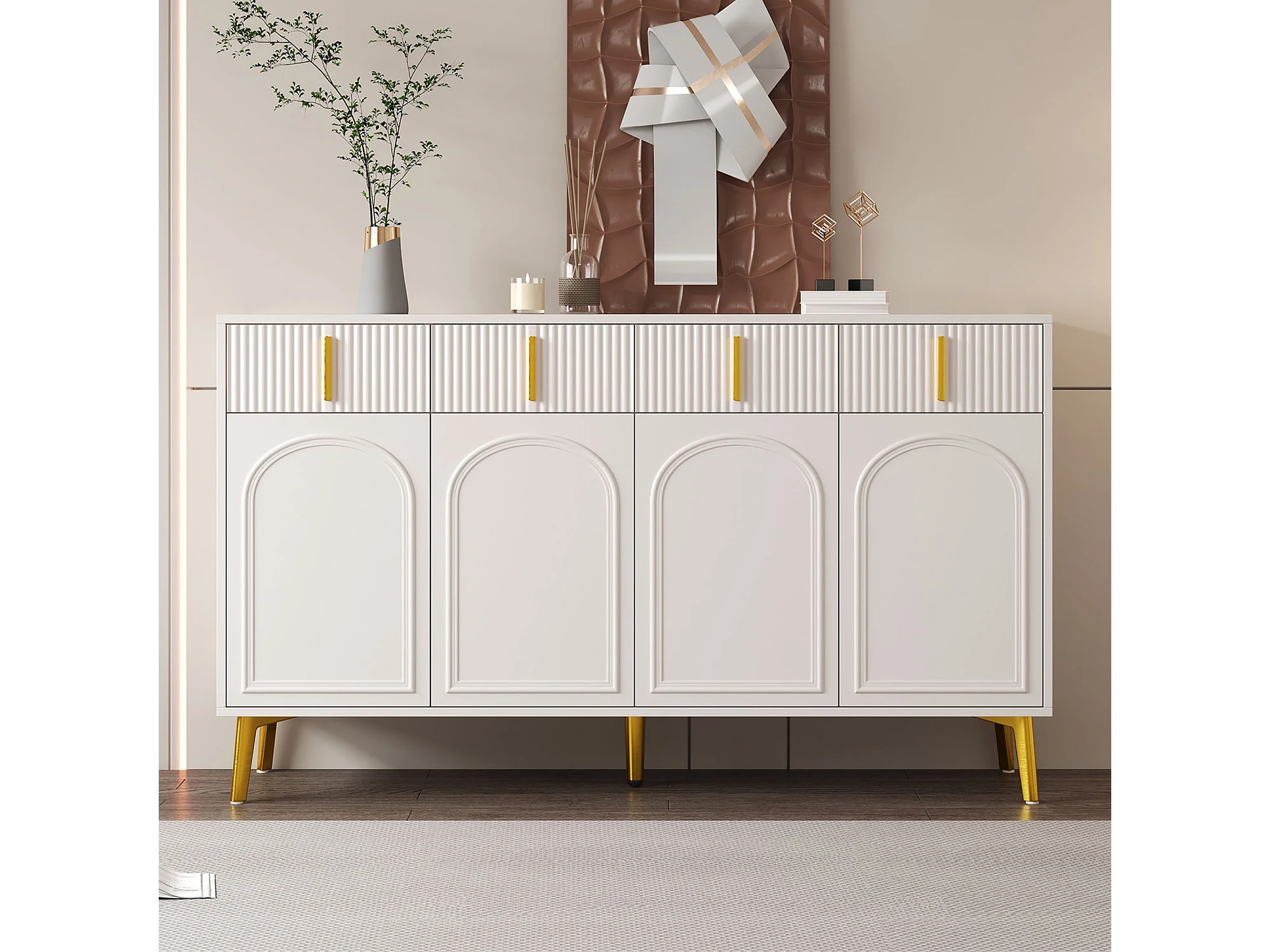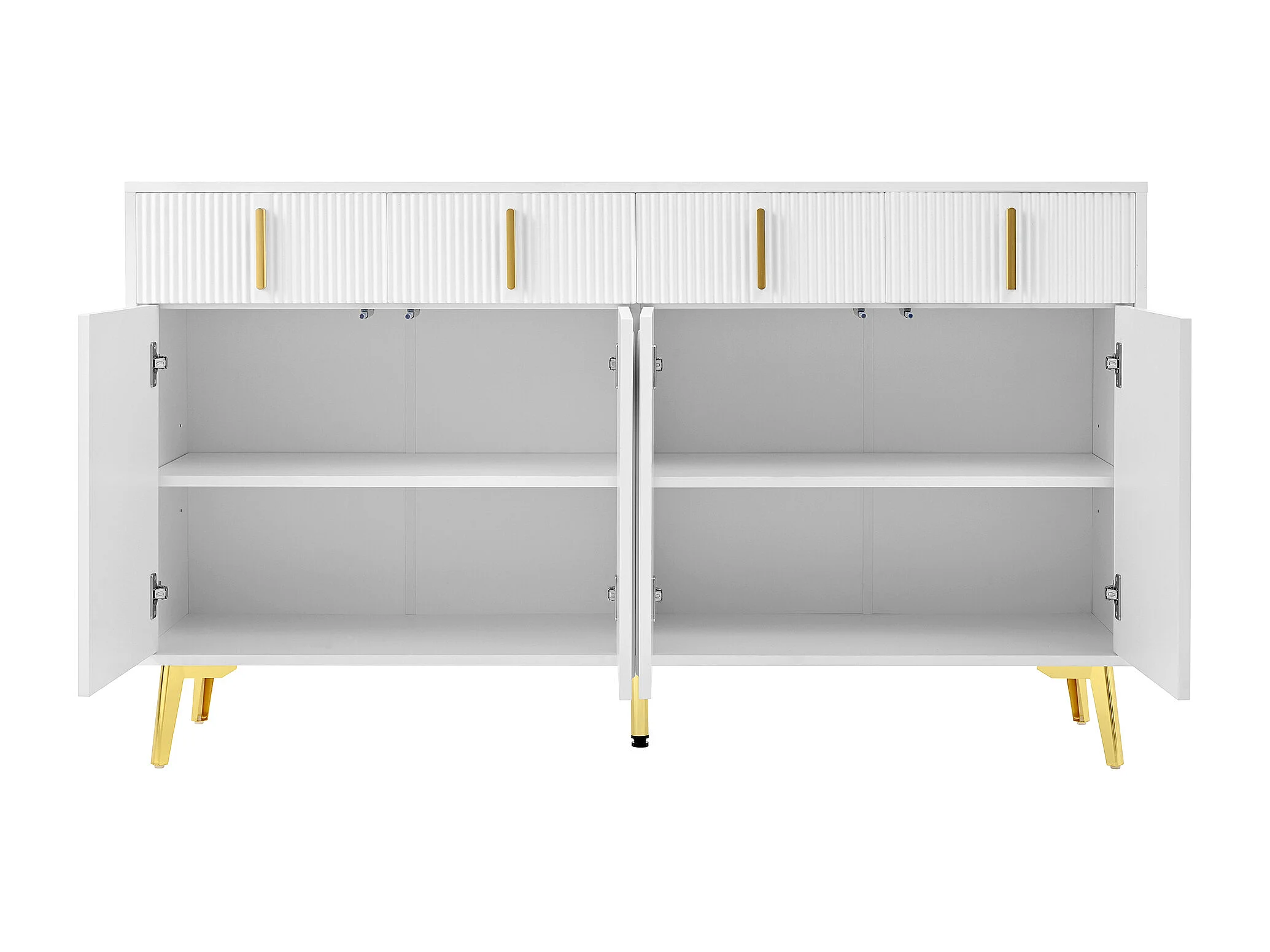 Buffet 140 x 37,8 x 82 cm – 4 portes, 4 tiroirs avec stratifié amovible – Poignées et pieds dorés – Meuble pour salon et salle à manger