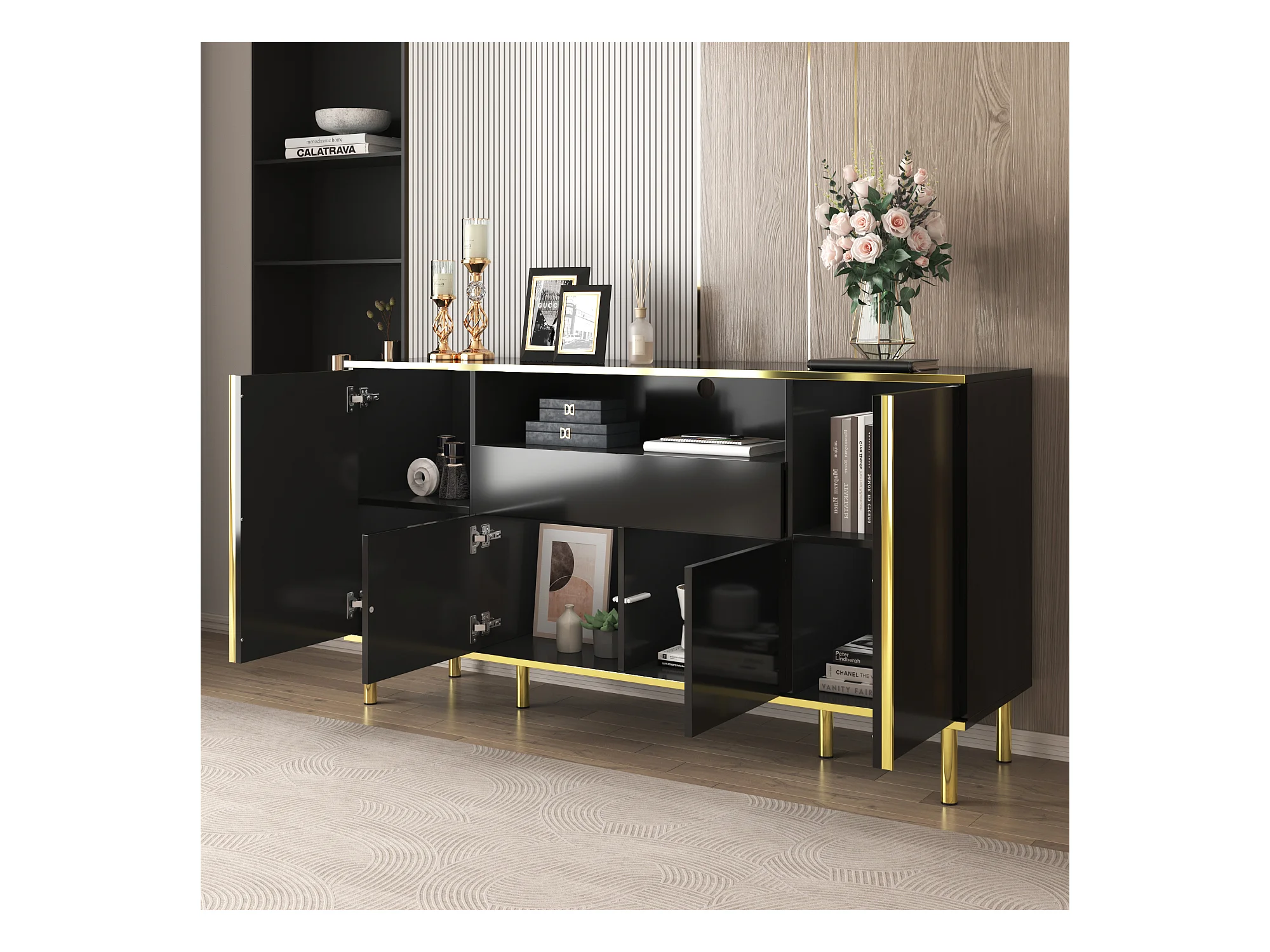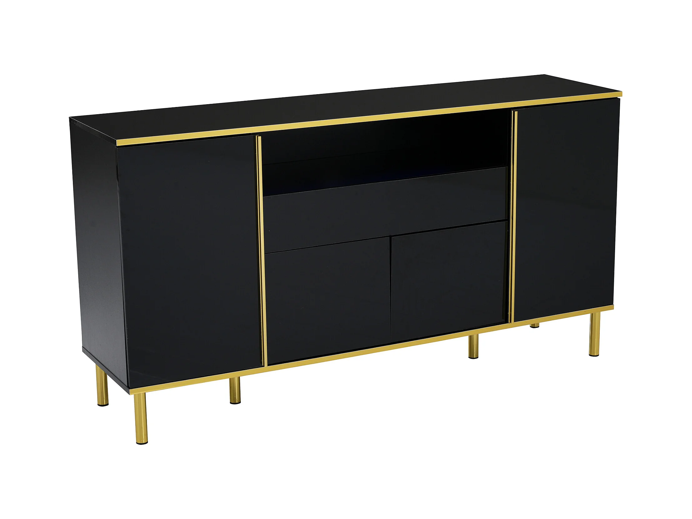 Buffet 150x40x80cm avec 4 portes, 1 tiroir et 1 niche avec LED, corps en noir laqué, bords et pieds dorés