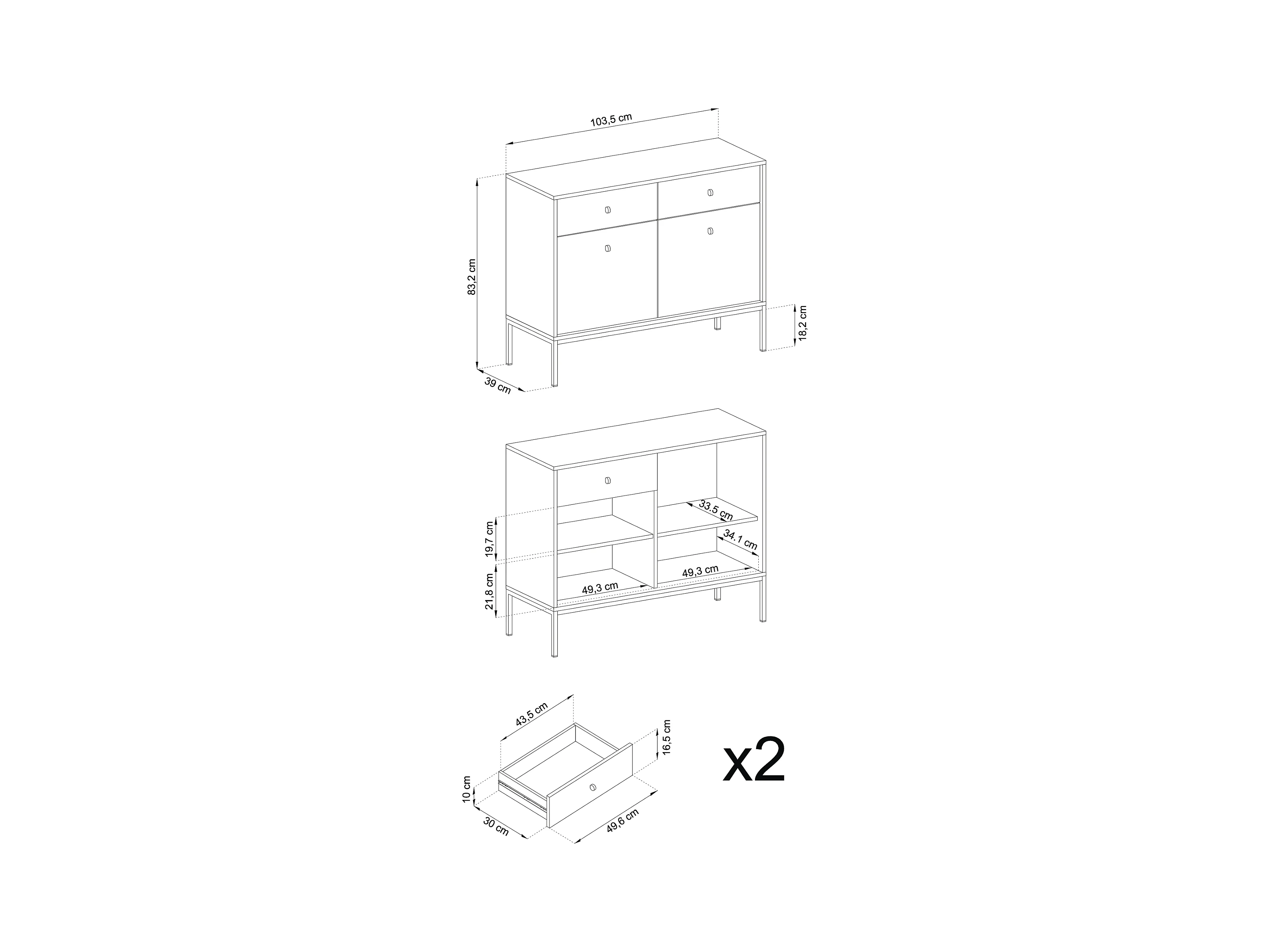 Buffet 2 portes, 2 tiroirs avec pieds en métal noir, 104x83 cm
