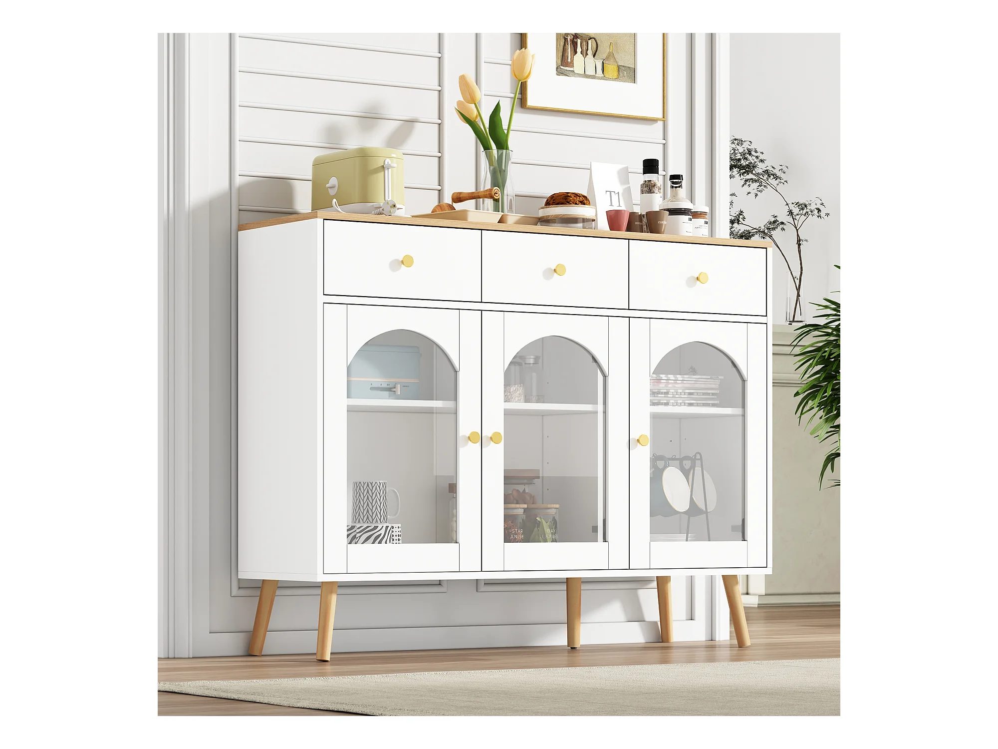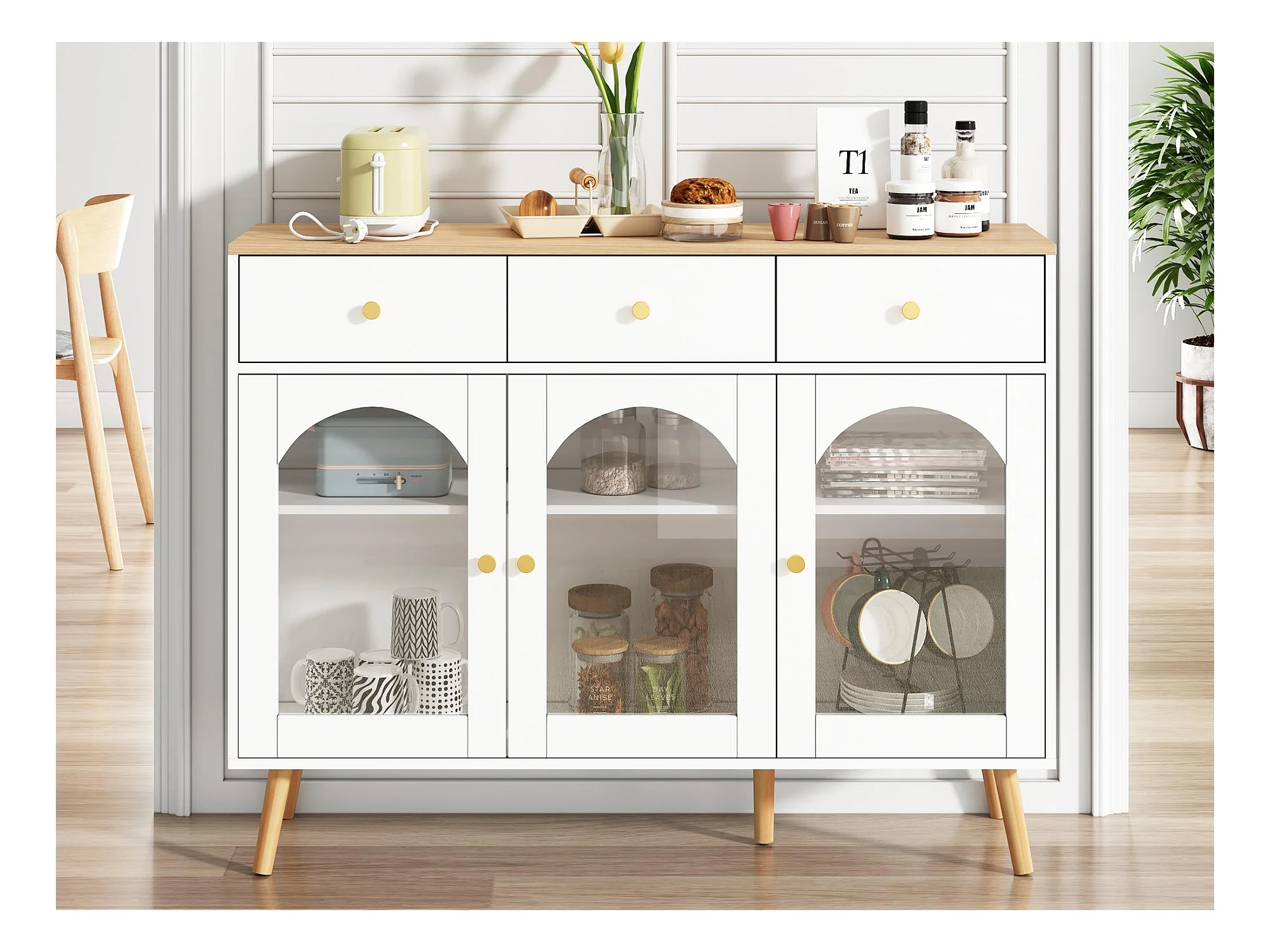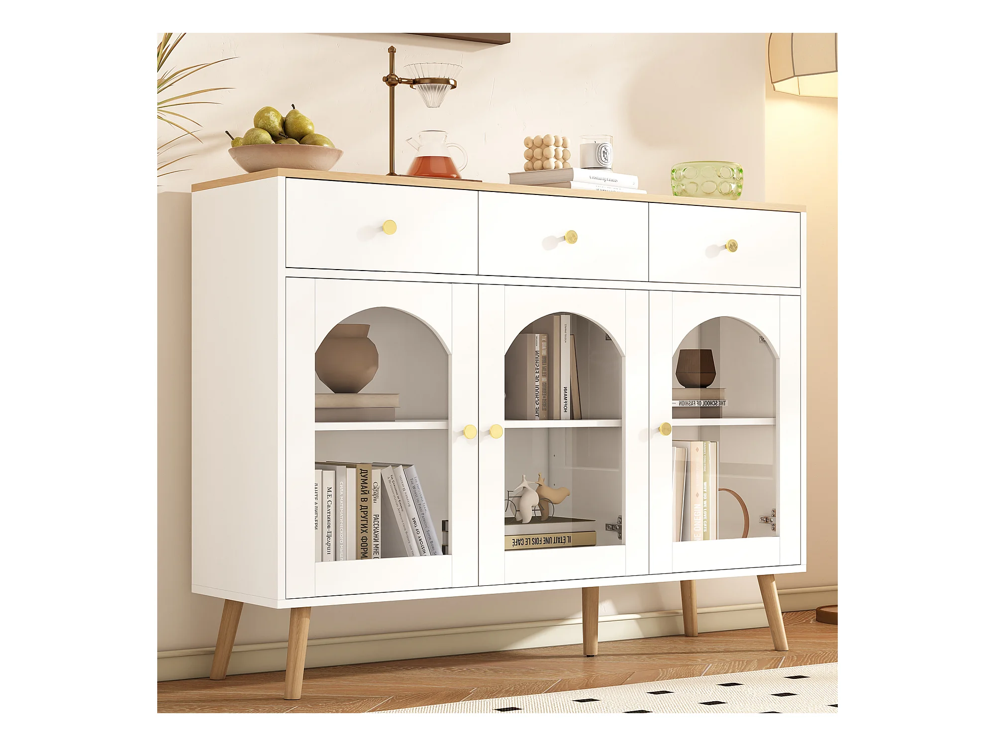 Buffet 34x120x94cm - avec 3 tiroirs - avec 3 portes galbées - avec verre trempé - blanc