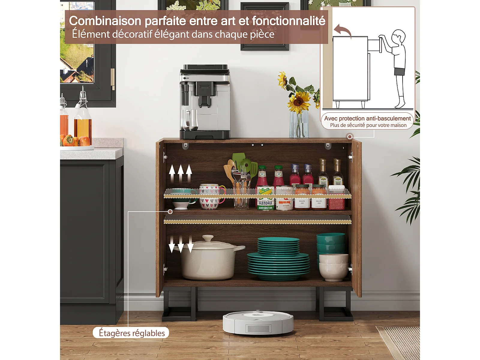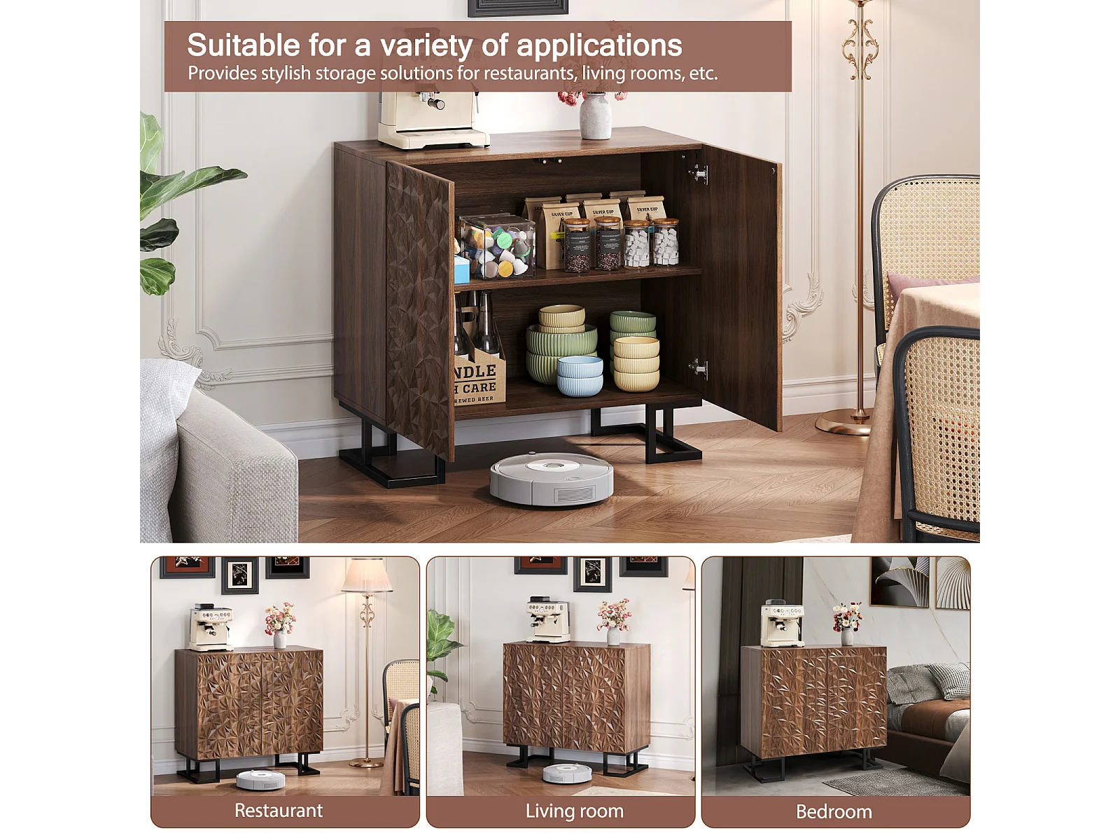 Buffet 80×40×78 cm série en noyer foncé avec relief feuilles, portes Push-to-Open et pieds en métal – Design moderne pour salon et couloir