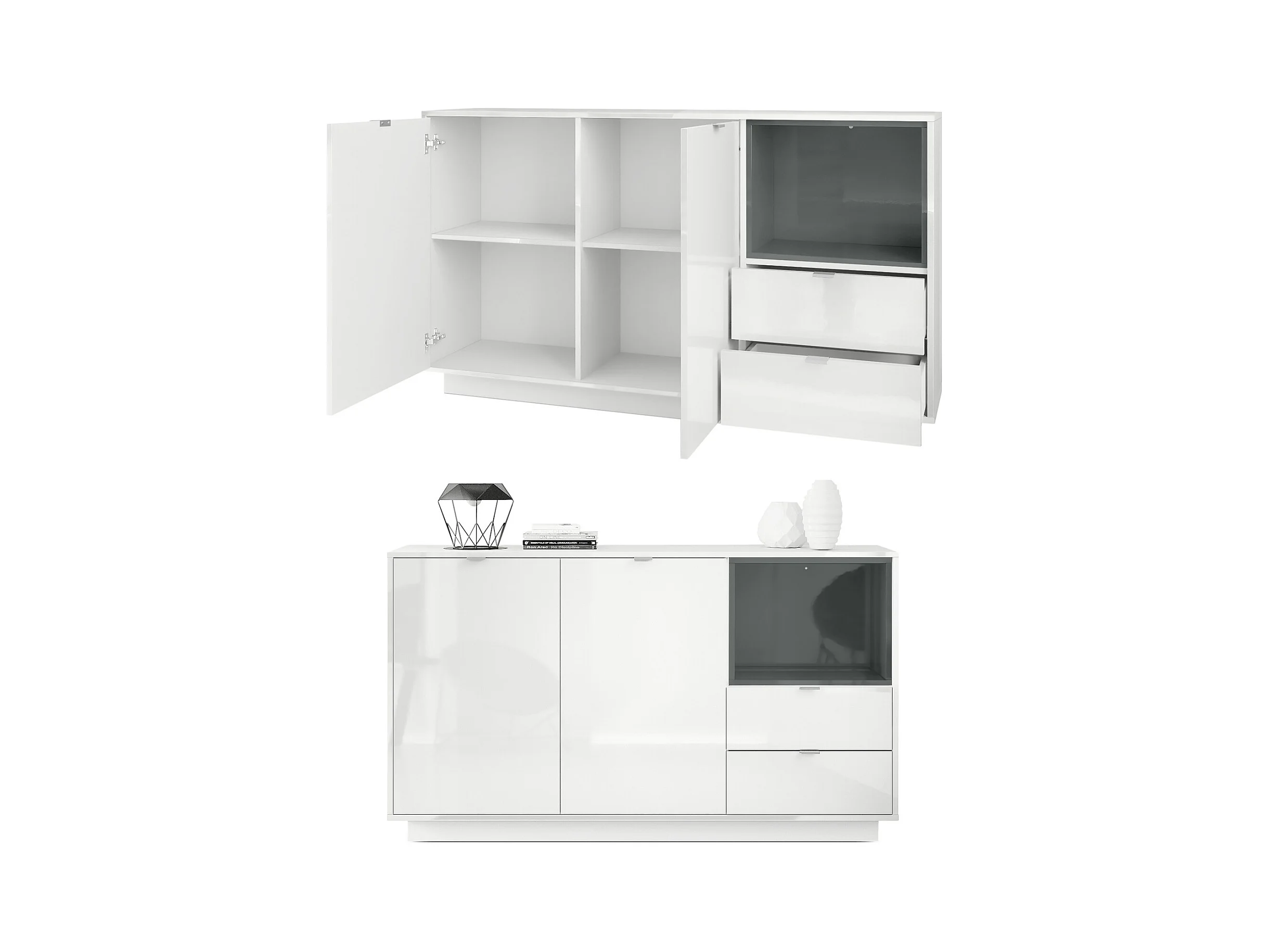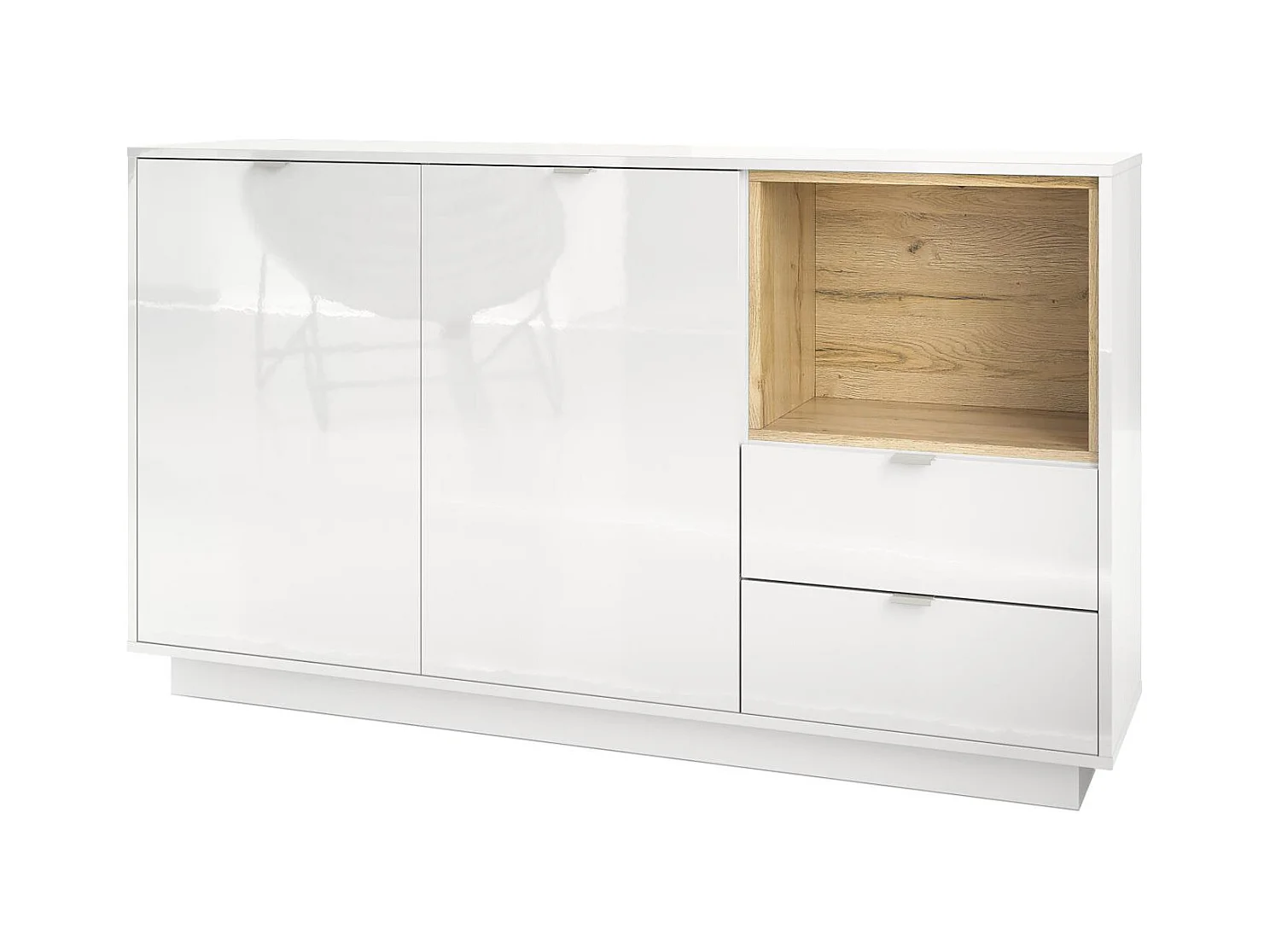 Buffet Armoire Metro, Corps en Blanc haute brillance / Façades en Blanc haute brillance avec une insertion en Chêne Nature