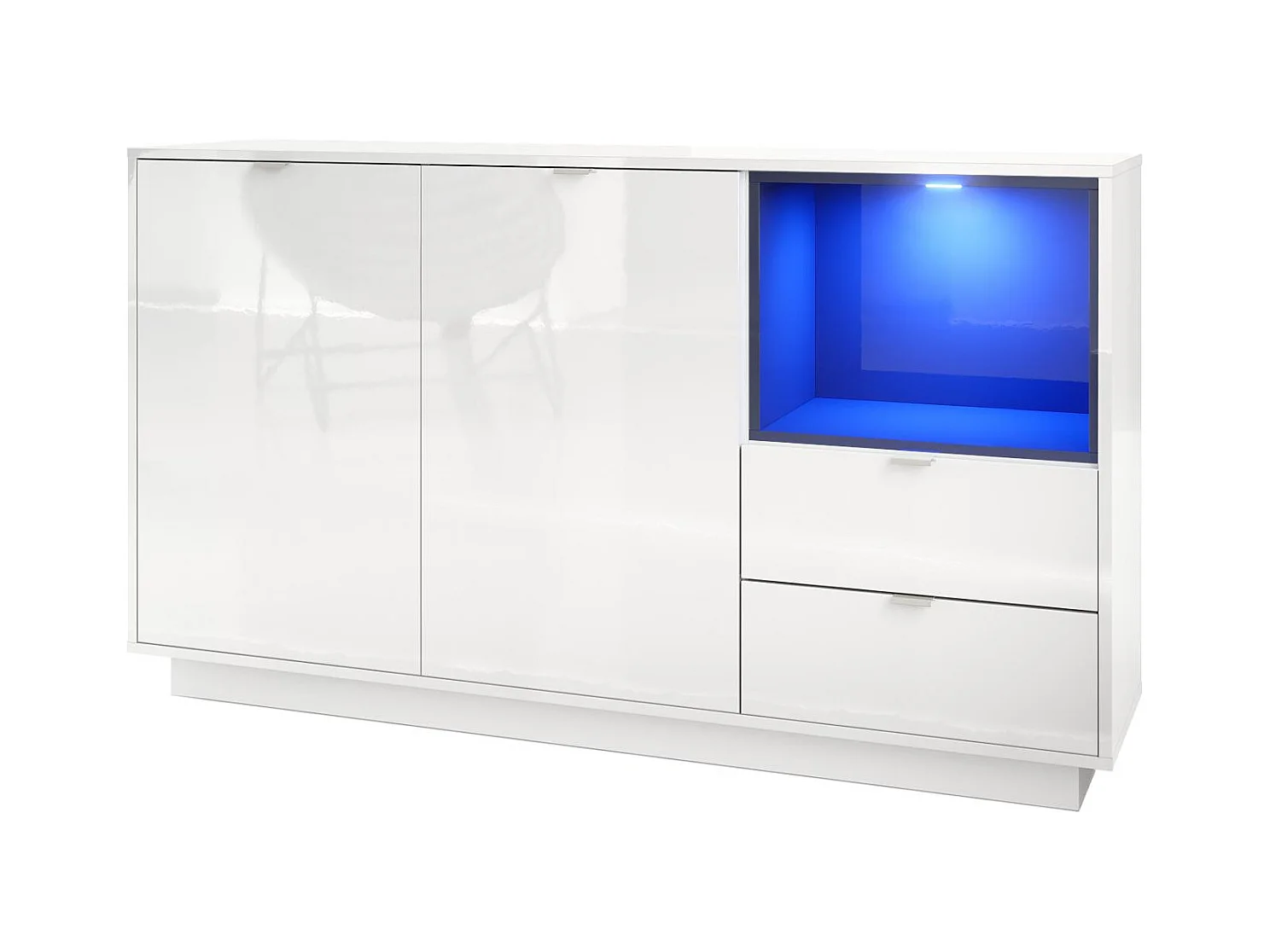 Buffet Armoire Metro, Corps en Blanc haute brillance / Façades en Blanc haute brillance avec une insertion en Noir haute brillance, incl. L'éclairage LED