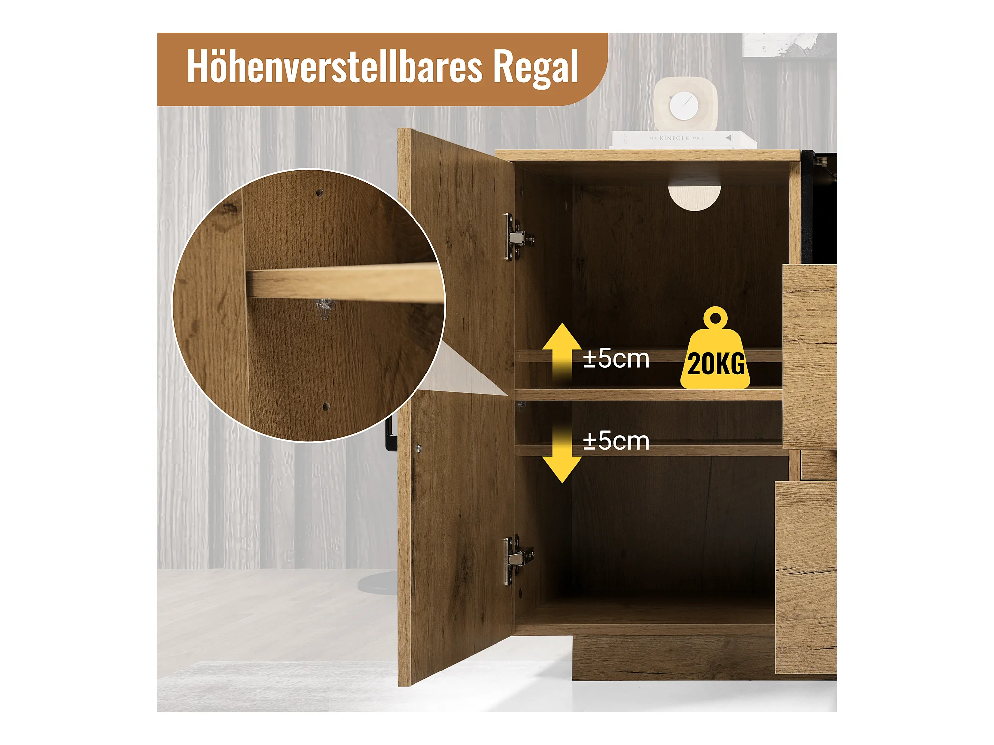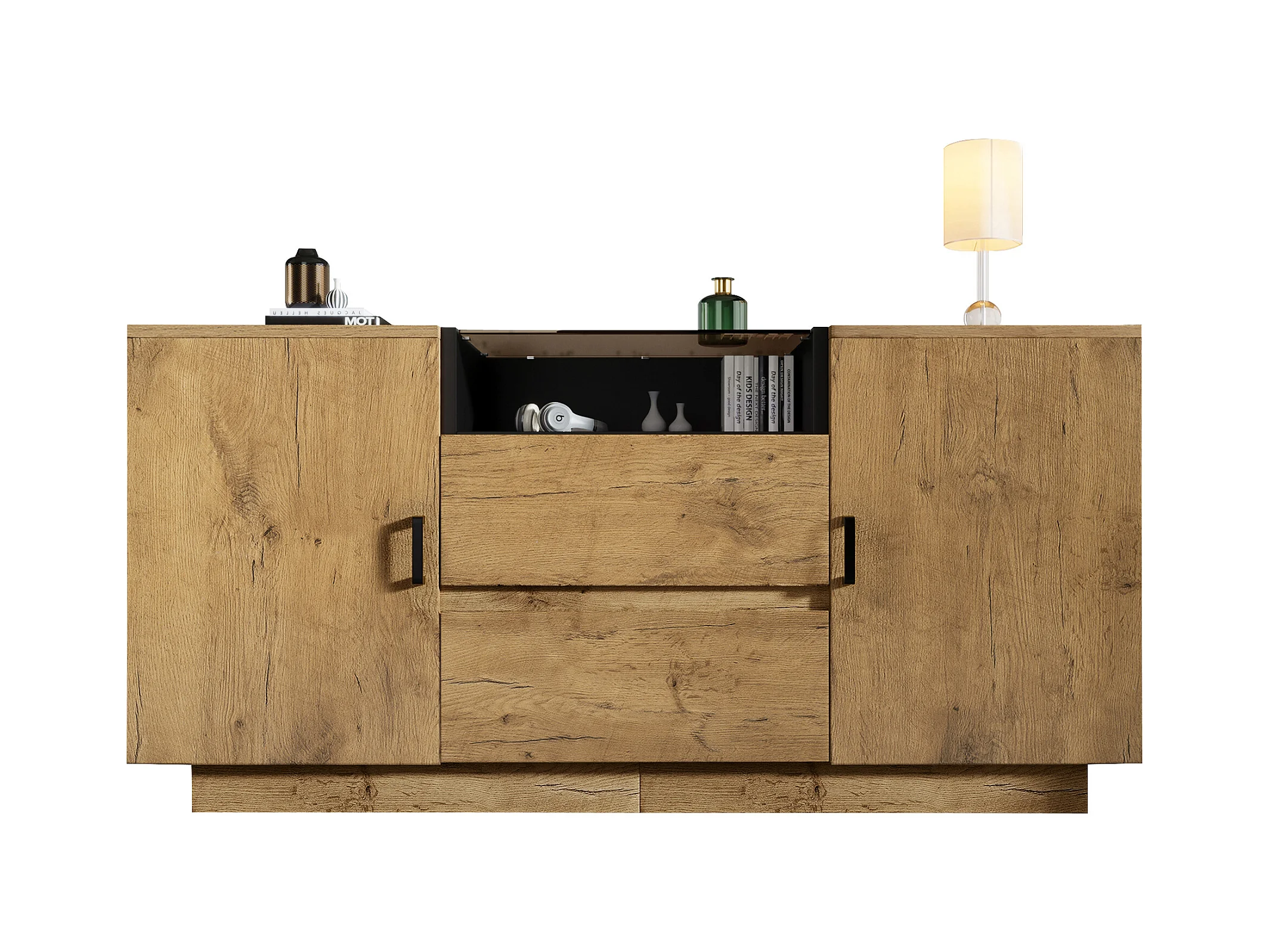 Buffet aspect chêne - 140 x 40 x 70 cm - avec 2 tiroirs + 2 portes + étagère - bois + métal - naturel