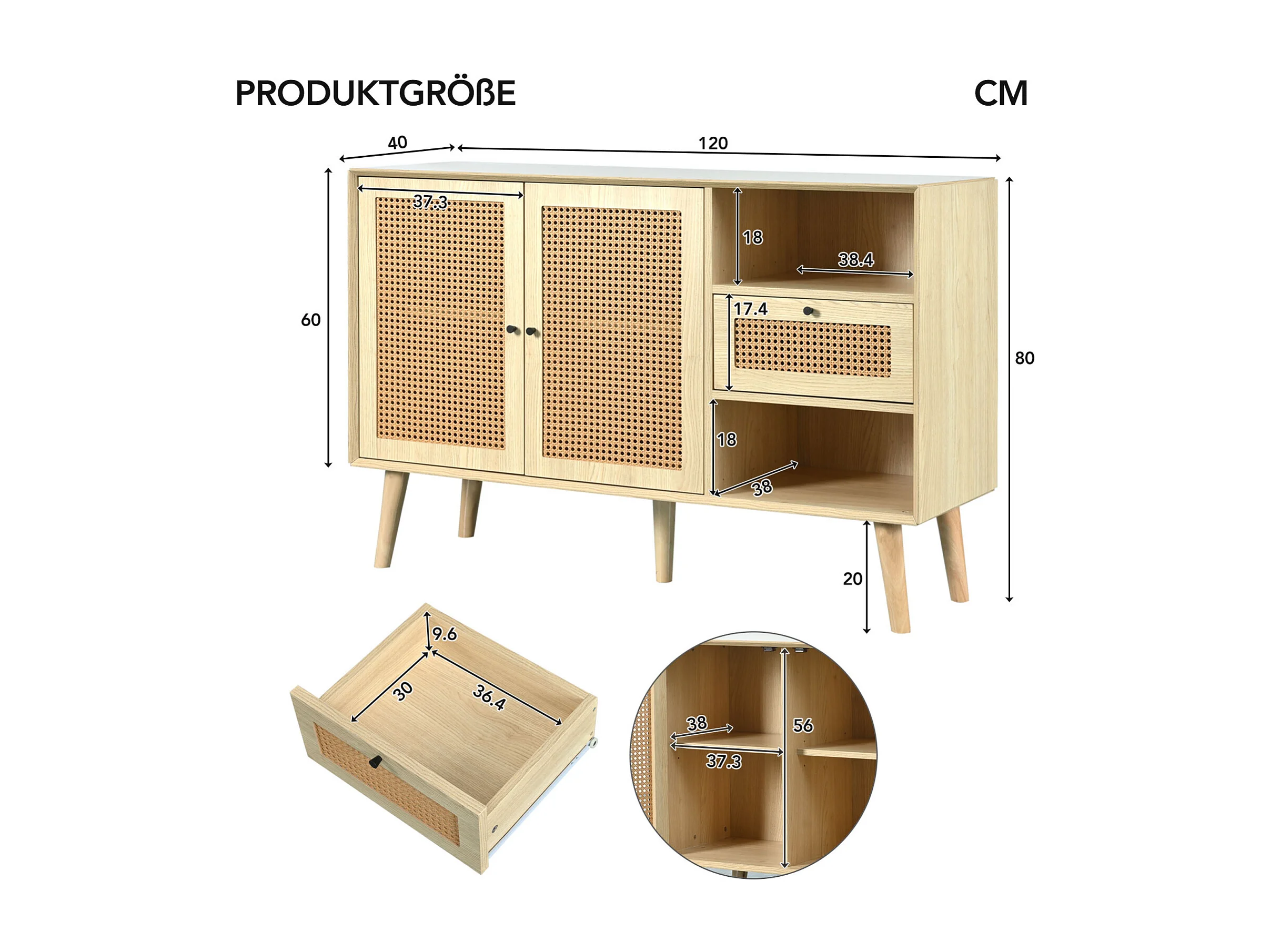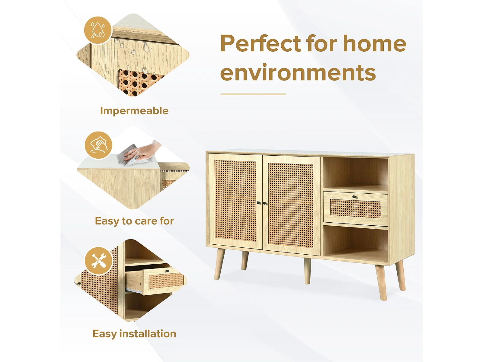 Buffet avec 1 tiroir et 2 portes magnétiques en rotin, pieds en bois massif, noir et étagères réglables, Meuble élégant en chêne