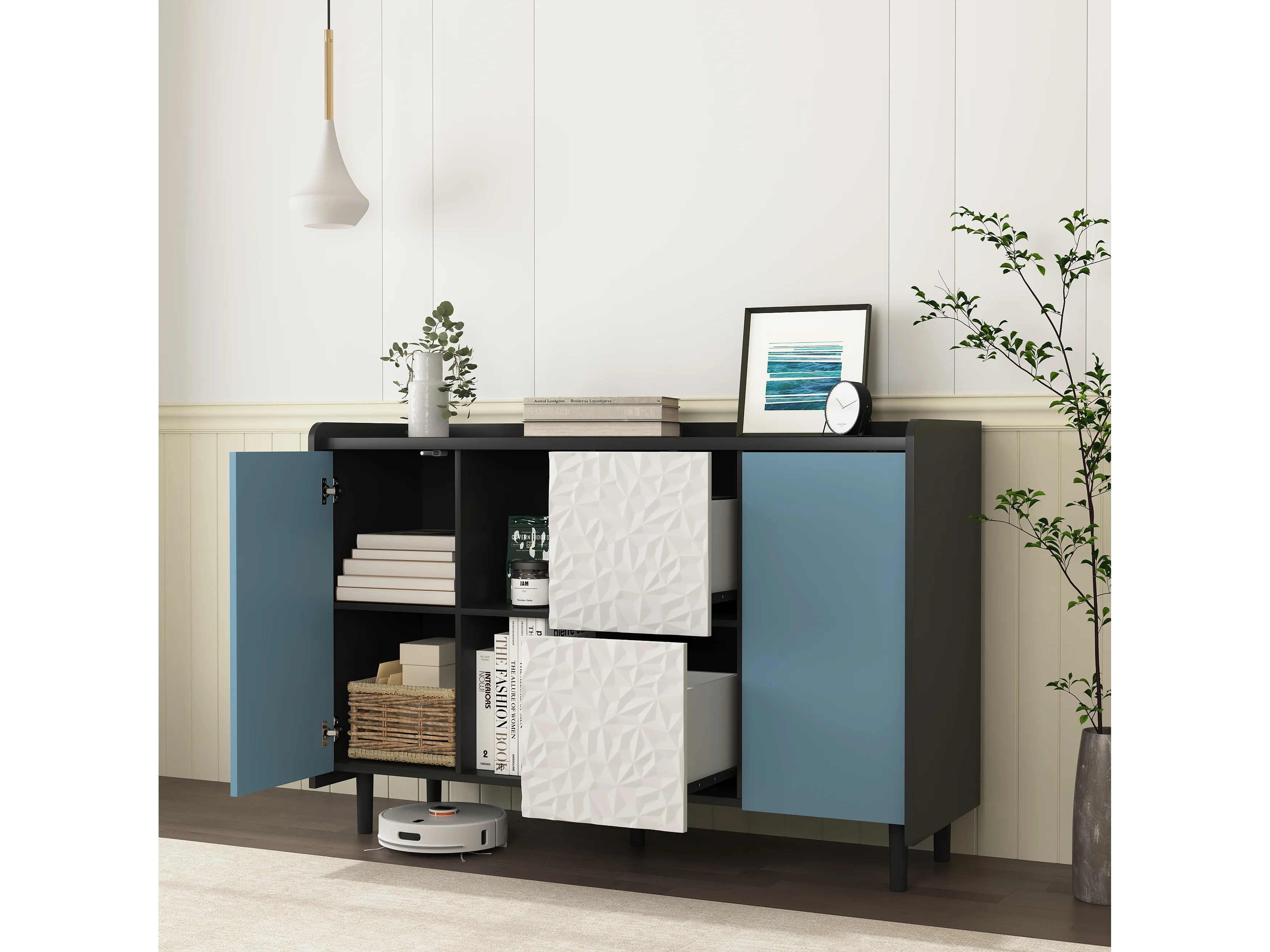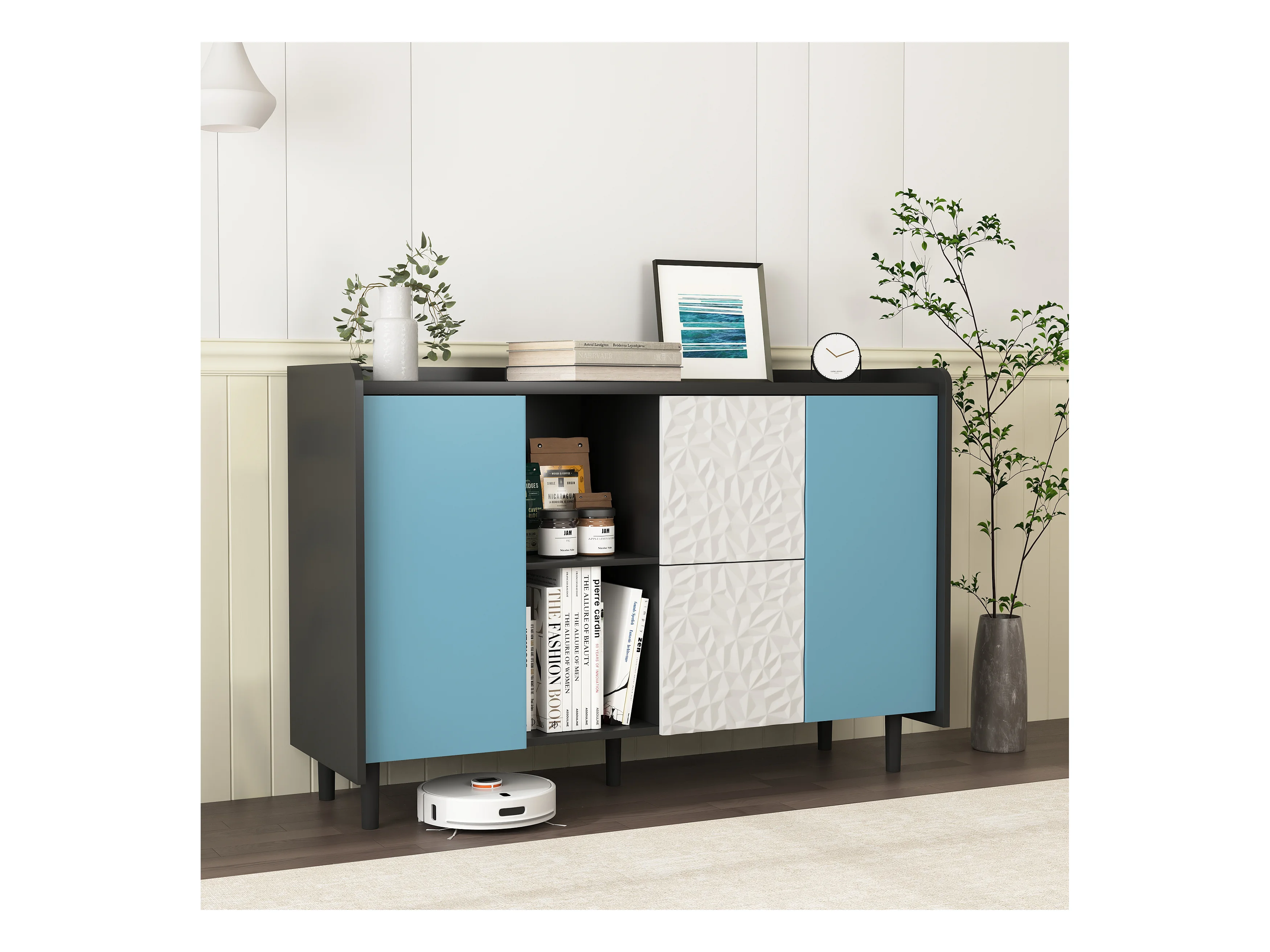Buffet avec 2 tiroirs, 2 étagères ouvertes et portes bleues, meuble de rangement moderne en MDF noir et bleu (120x40x80 cm)