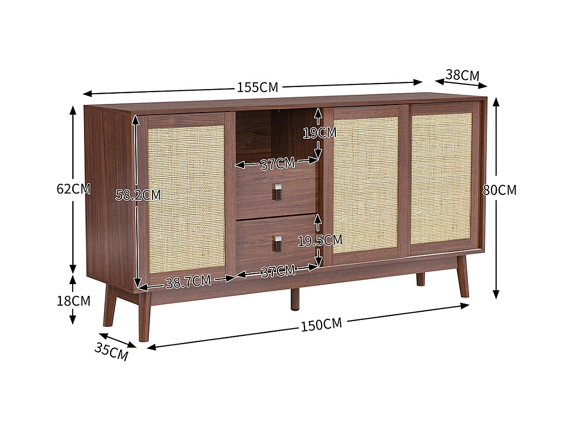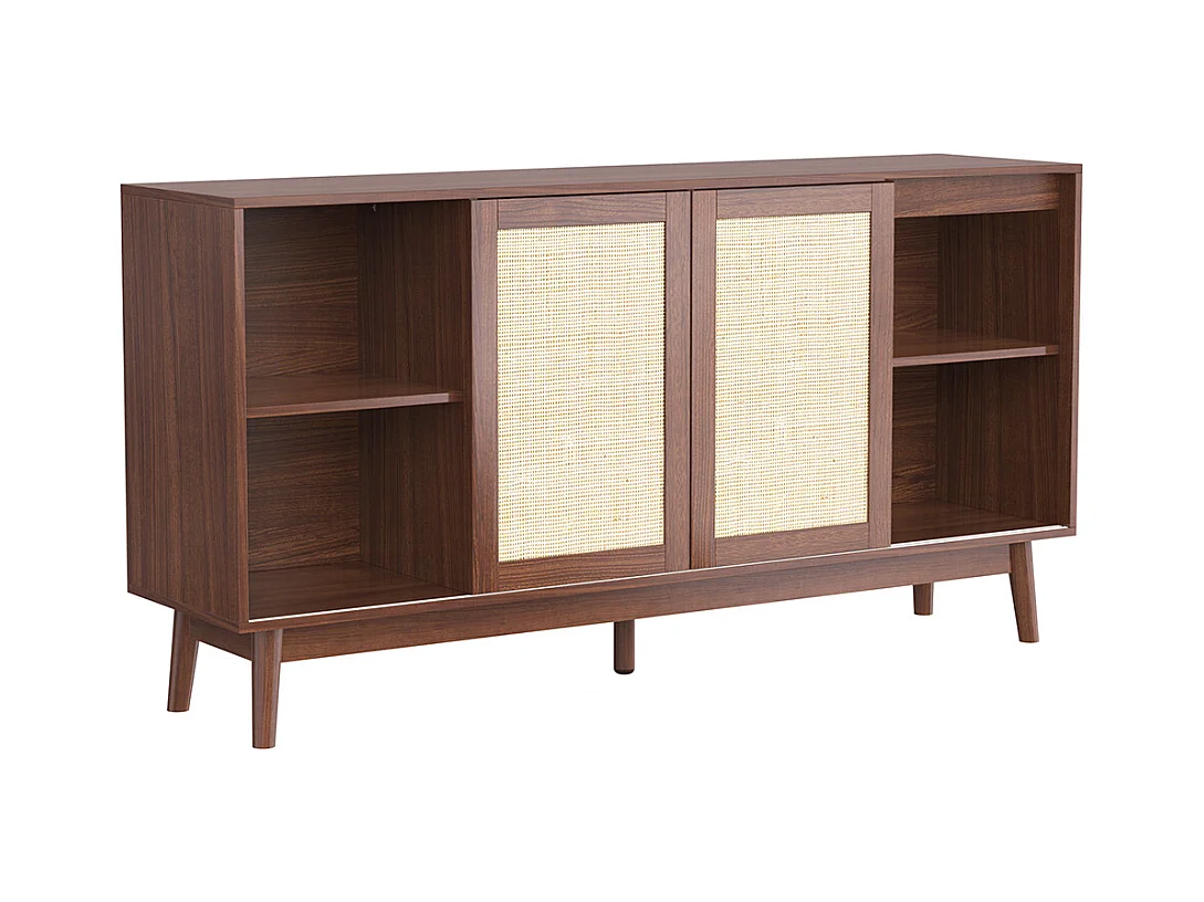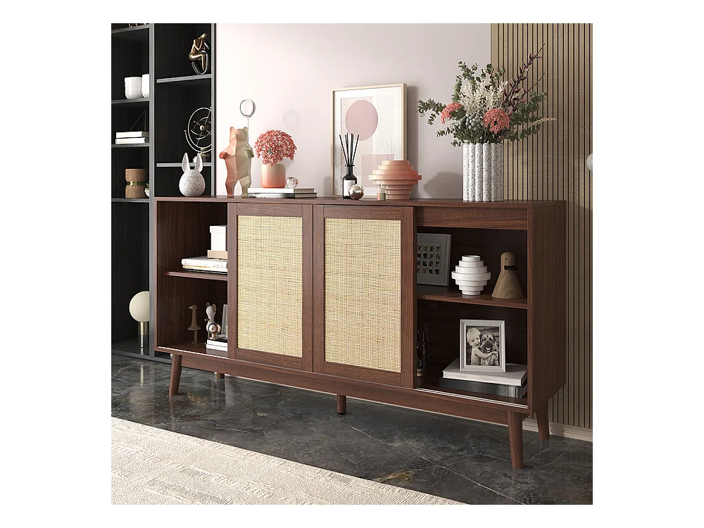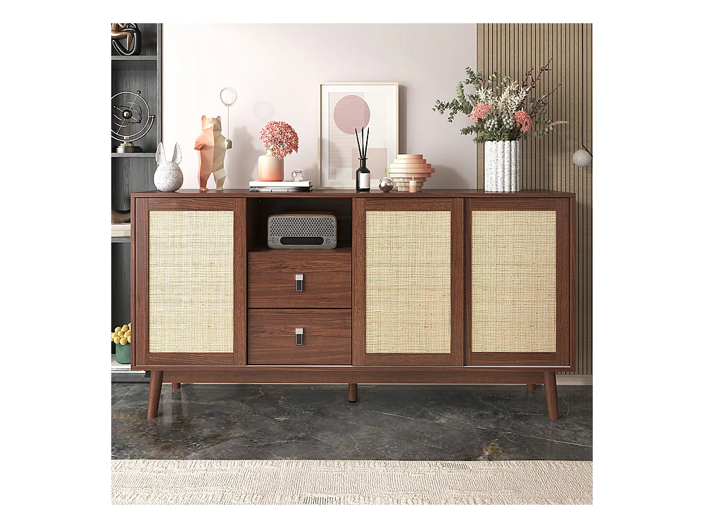 Buffet avec 3 portes coulissantes en rotin véritable et 2 tiroirs respirant stable Bois