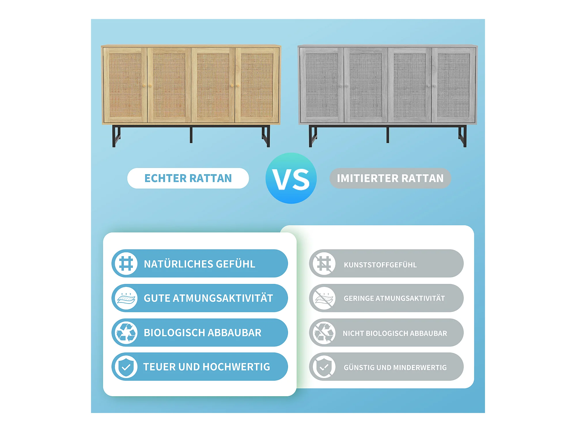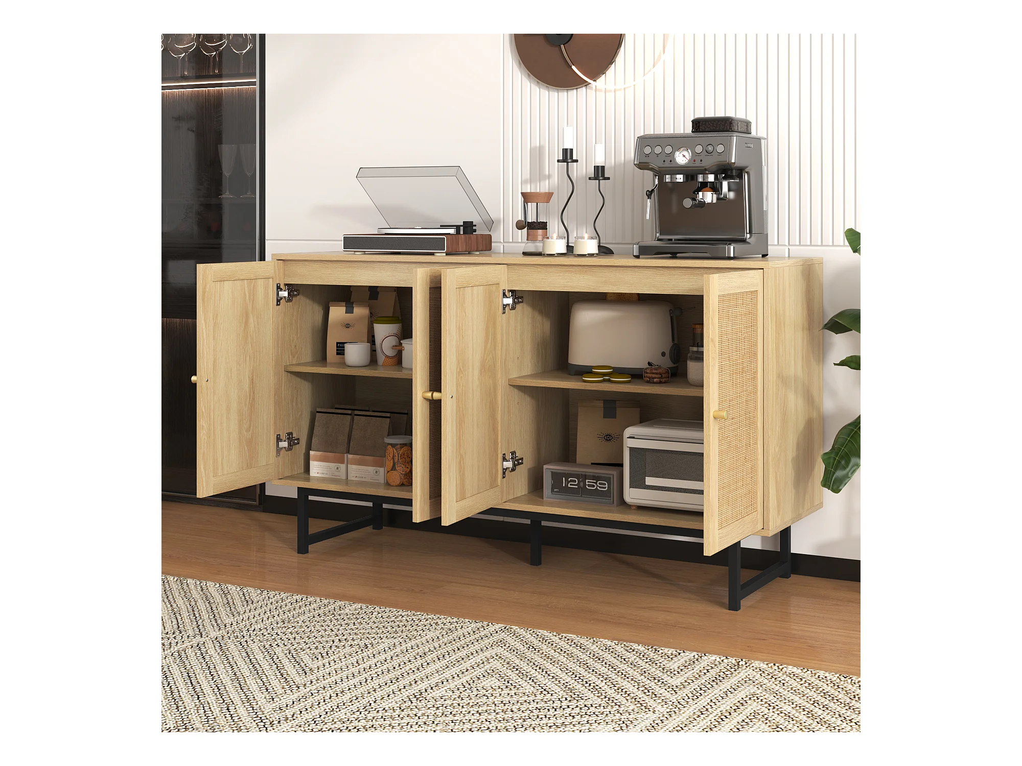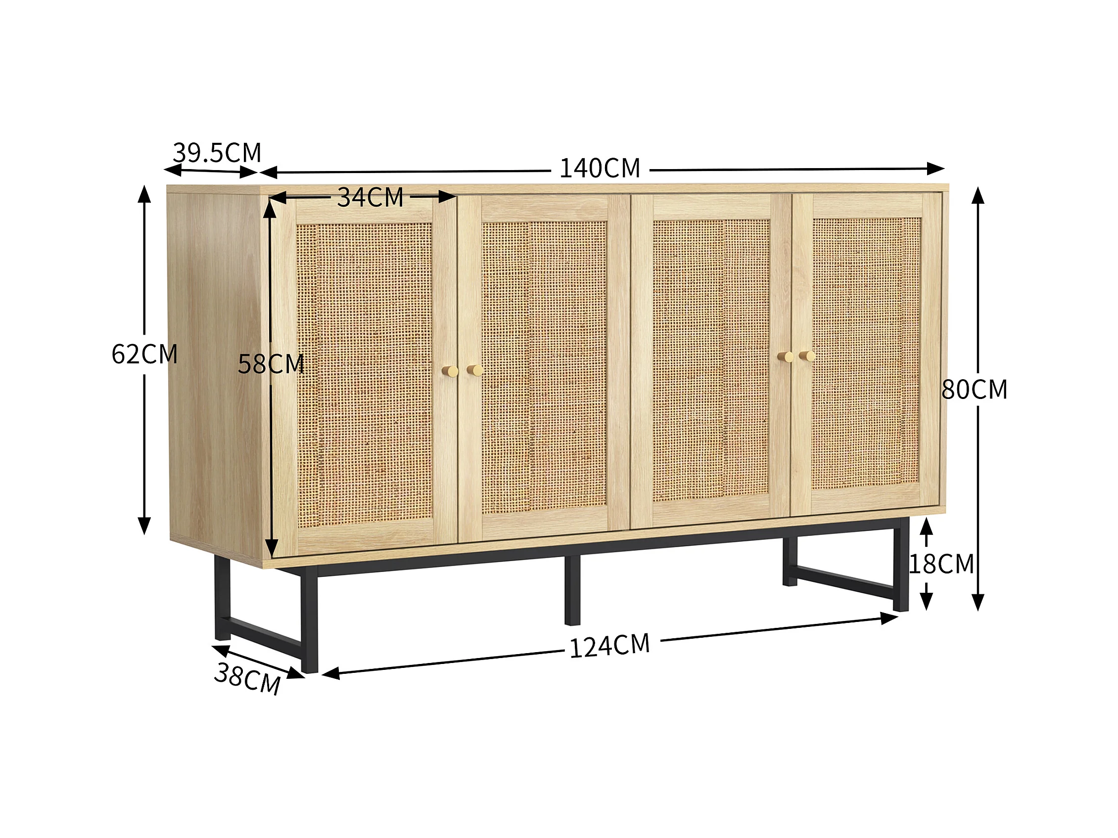 Buffet avec 4 portes en rotin - 140 x 39,5 x 80 cm - Panneau de particules - Coloris bois