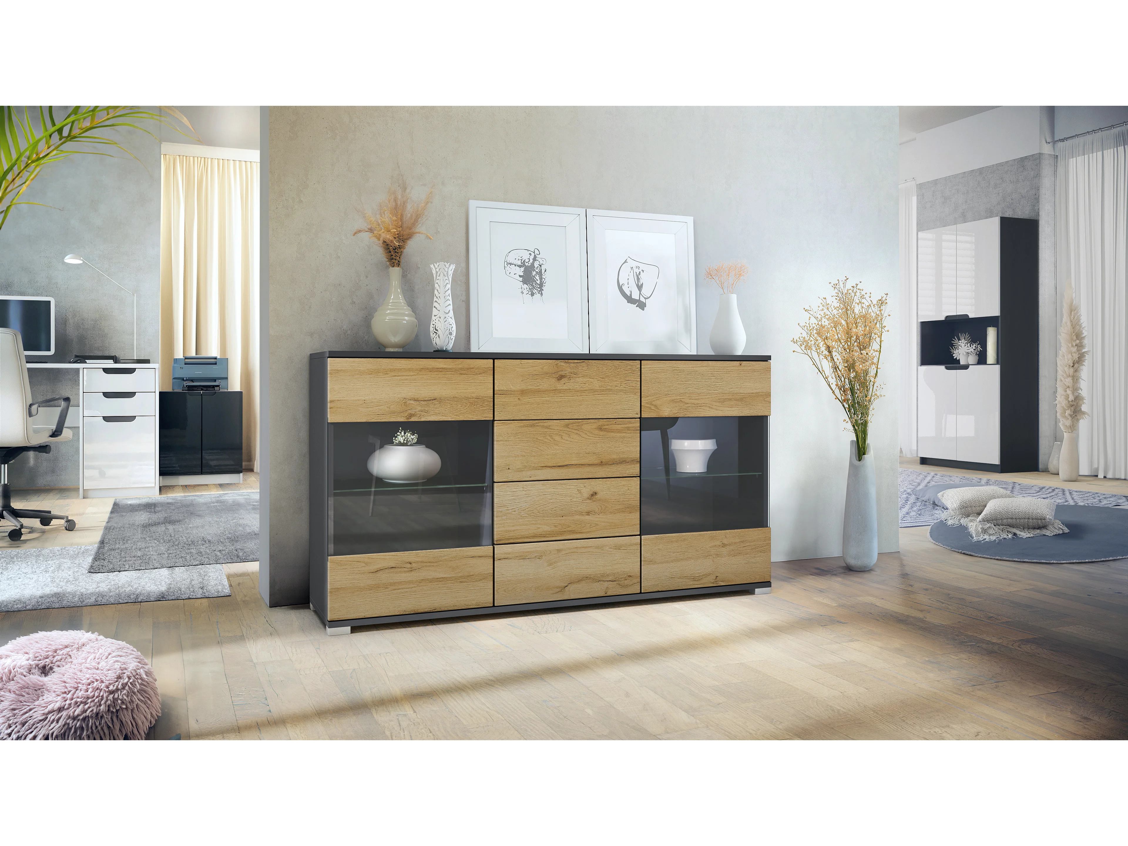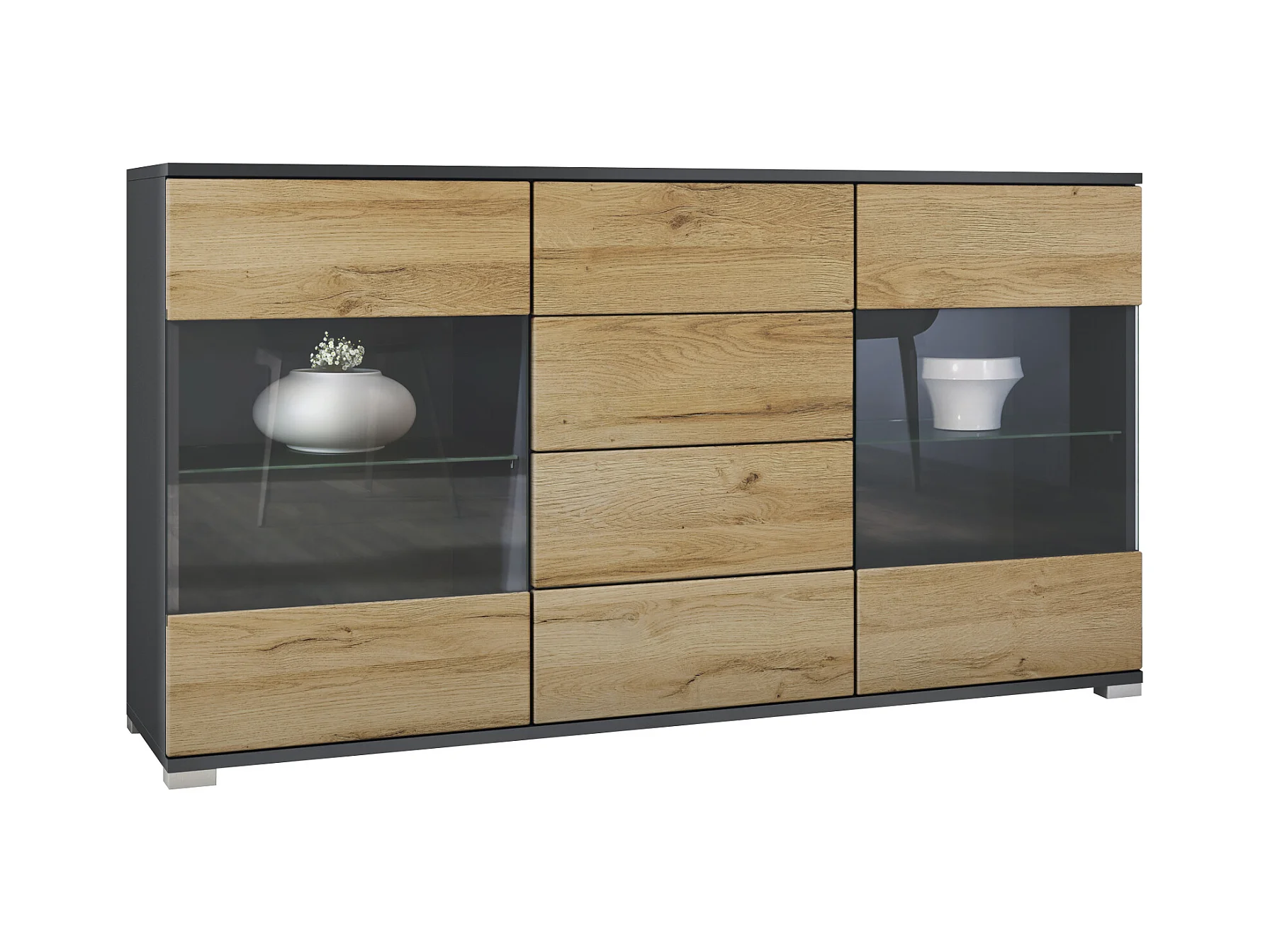 Buffet Bari V1 – Meuble avec 2 Grandes Portes et 4 Tiroirs, anthracite mat/chêne nature (138,5 x 75,5 x 35)