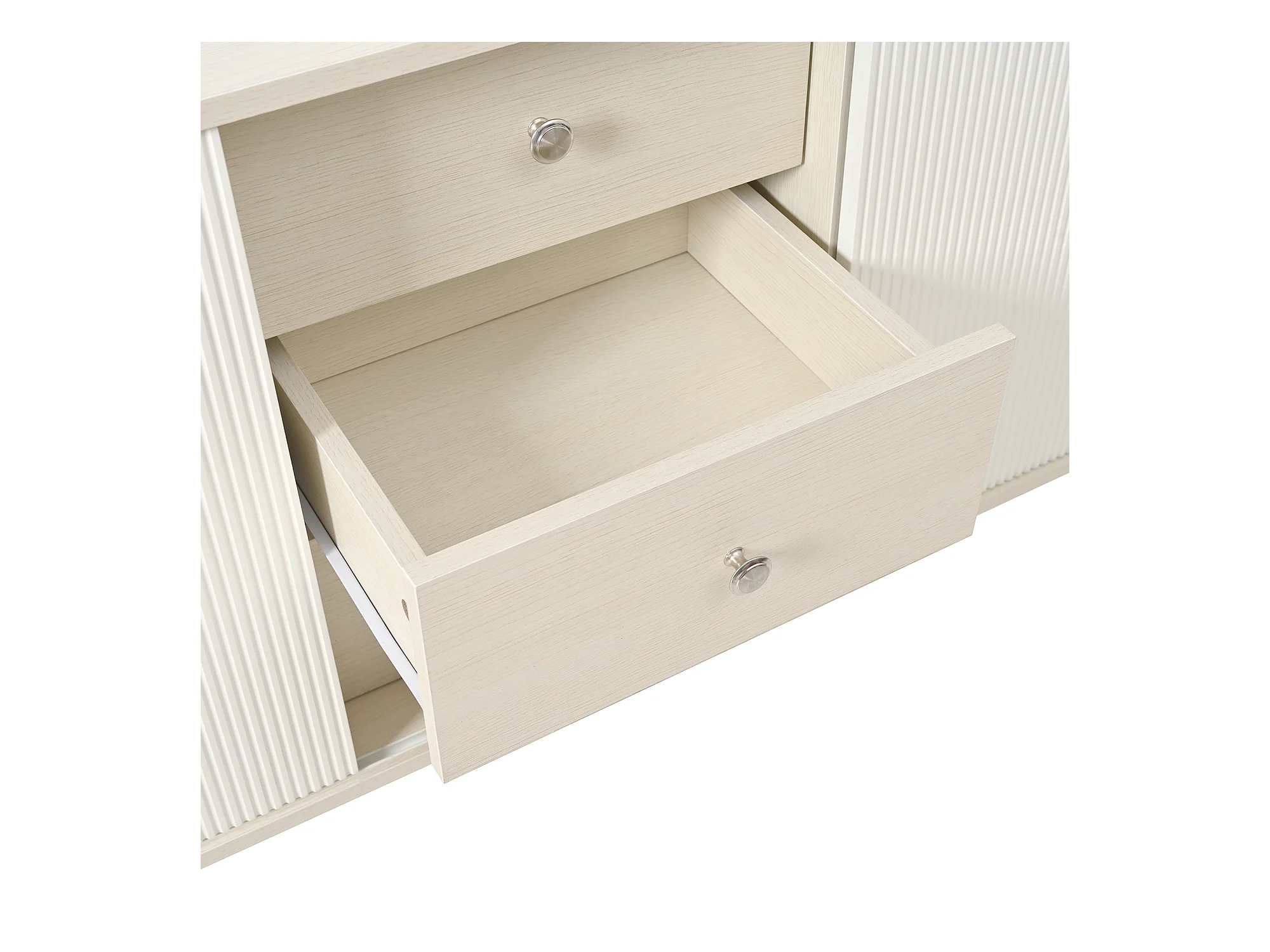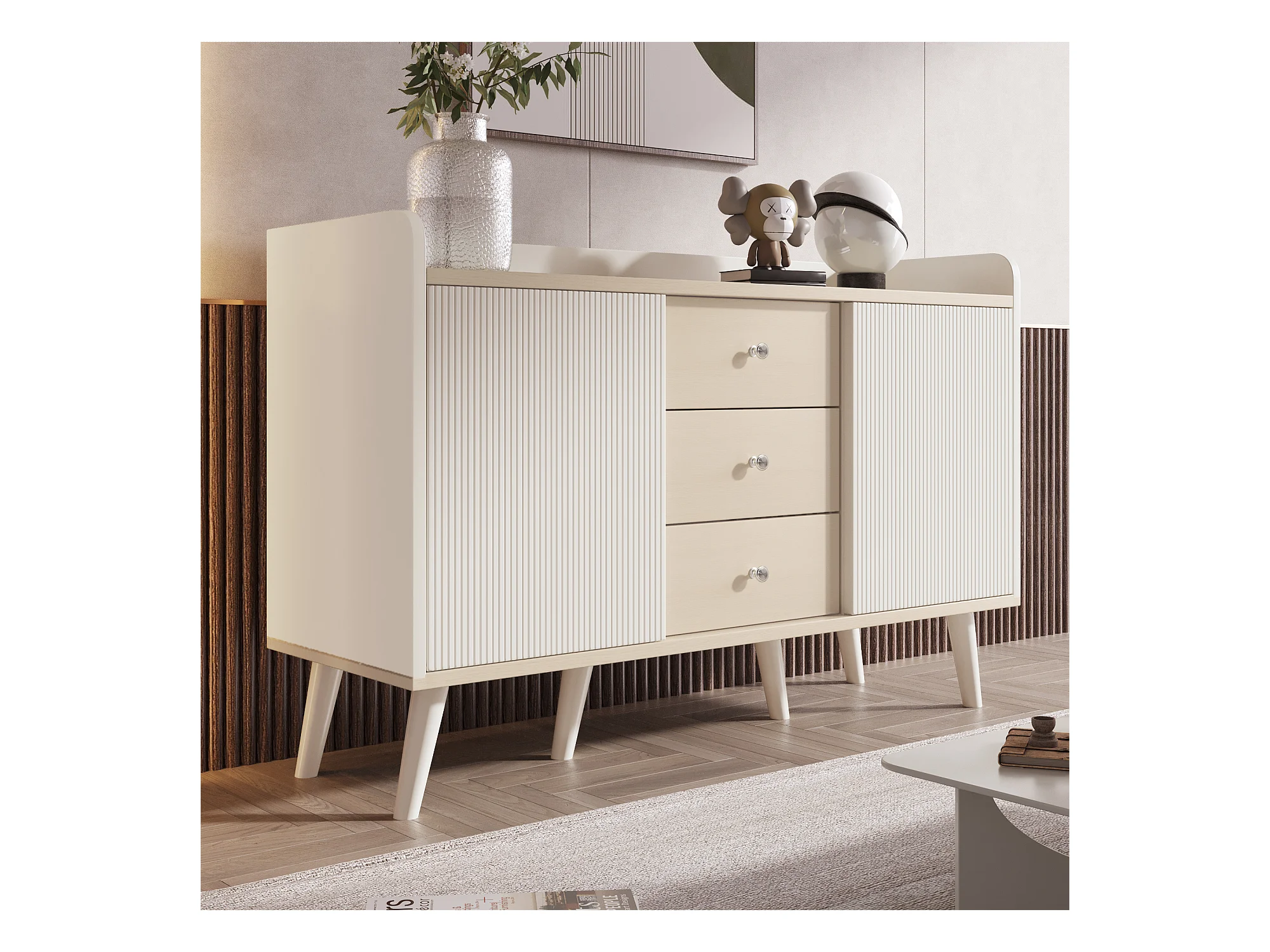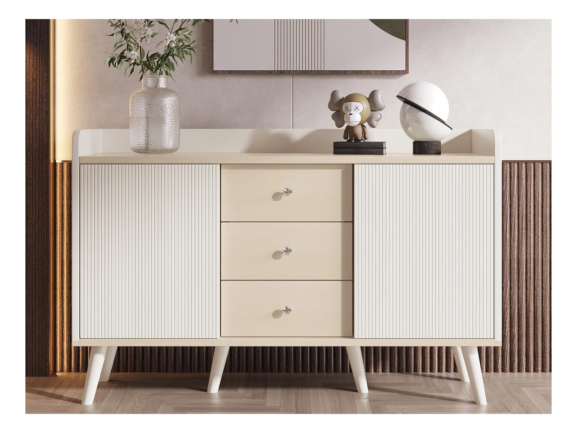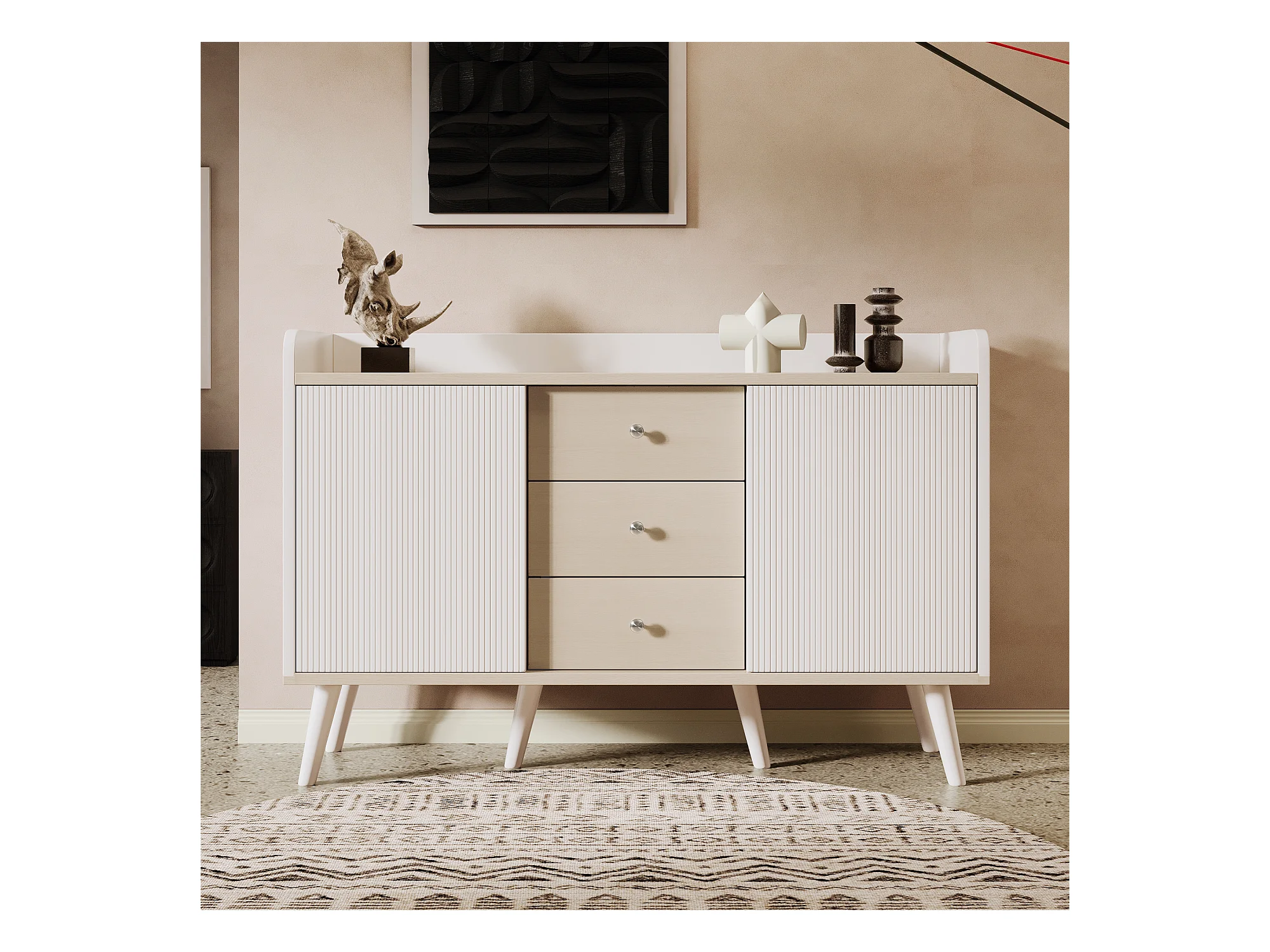 Buffet bas avec 3 tiroirs et 2 portes - style contemporain - Blanc & Naturel