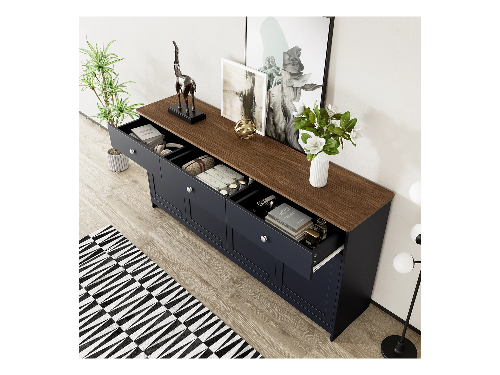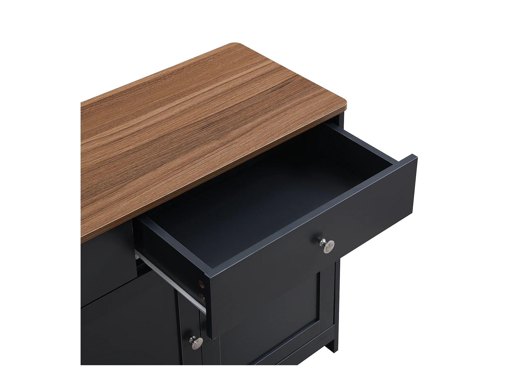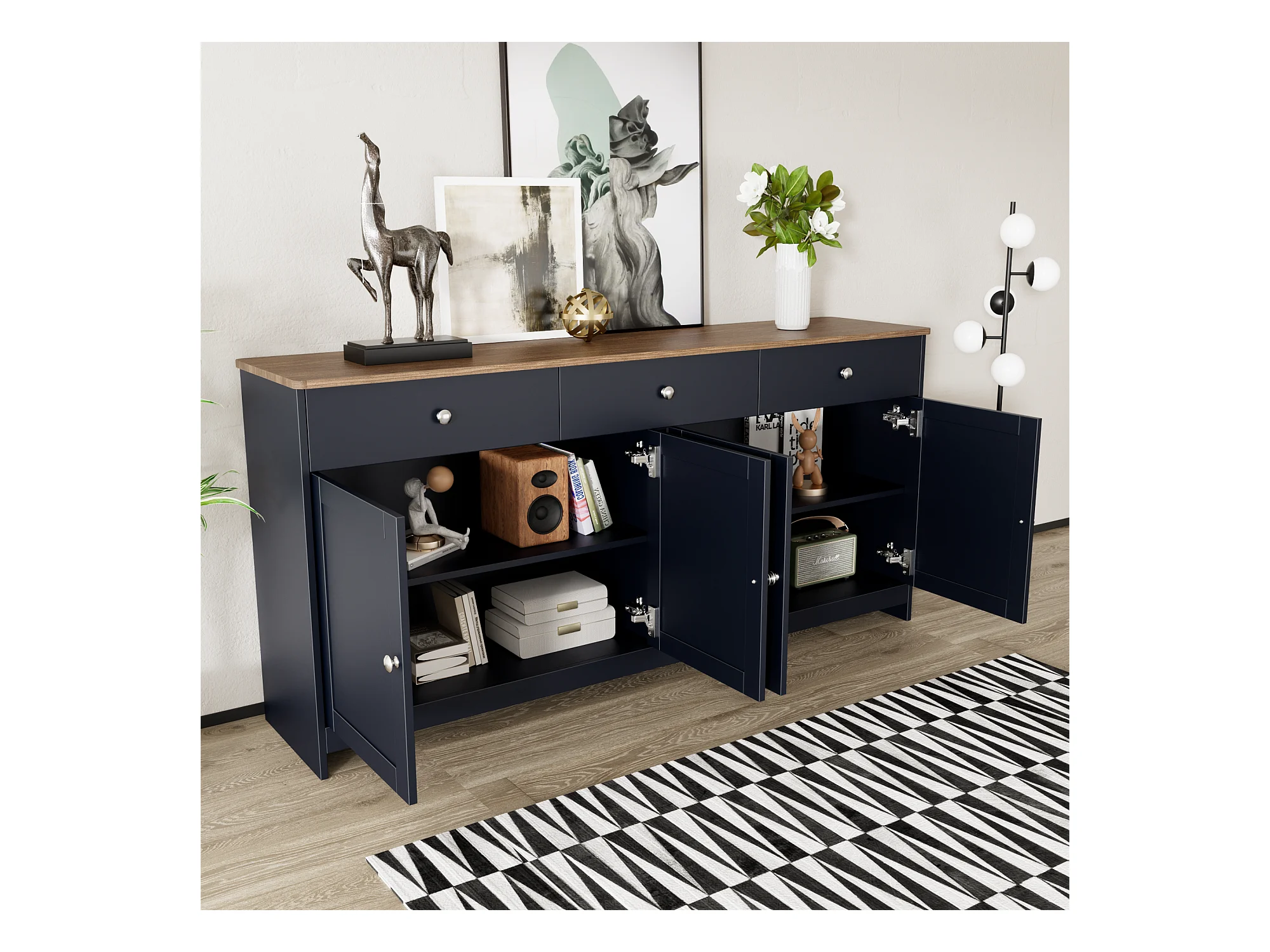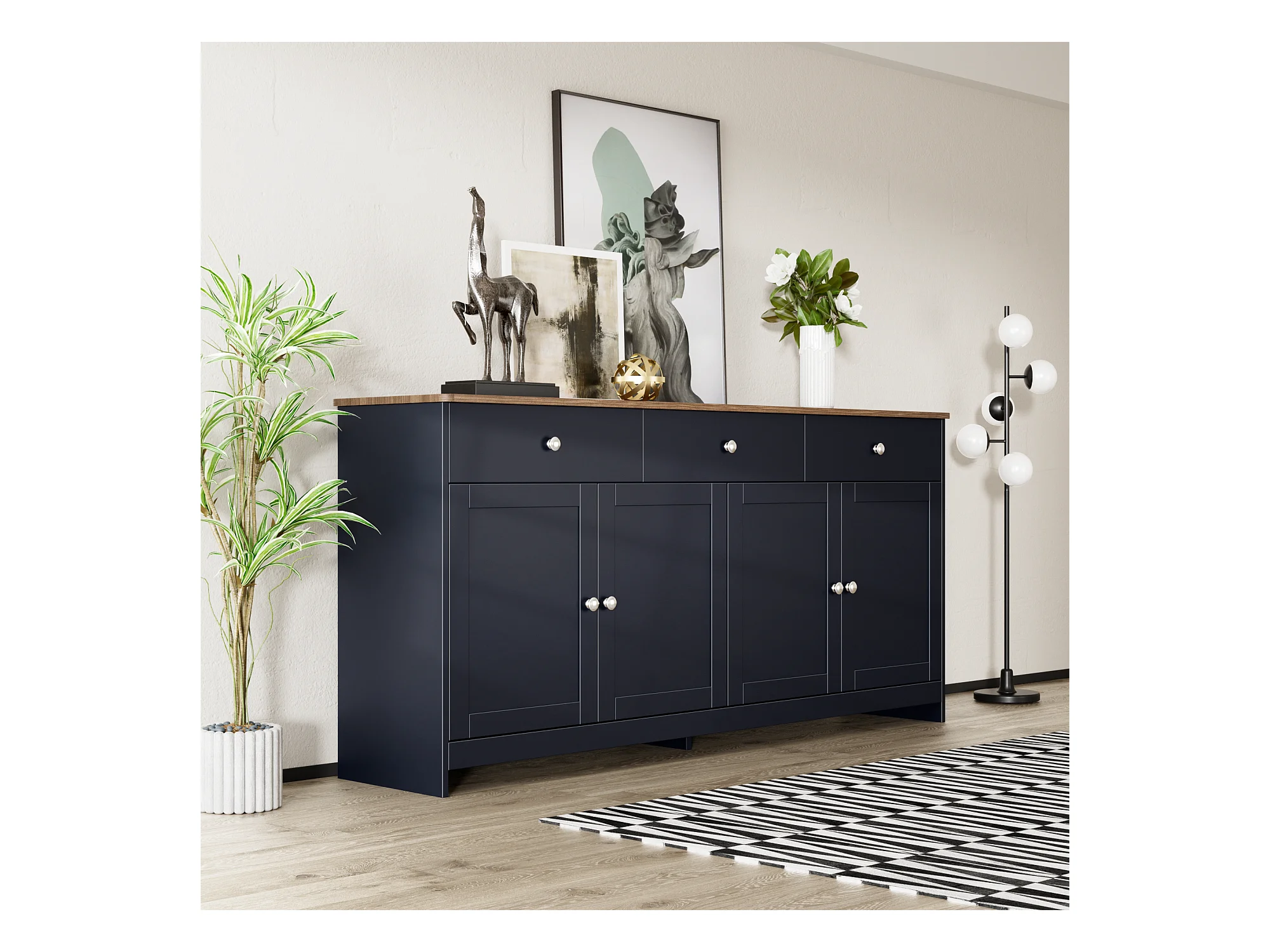 Buffet bas avec 4 portes et 3 tiroirs pour salon - 160 L x 37 l x 75H cm - bois MDF - bois et gris noir
