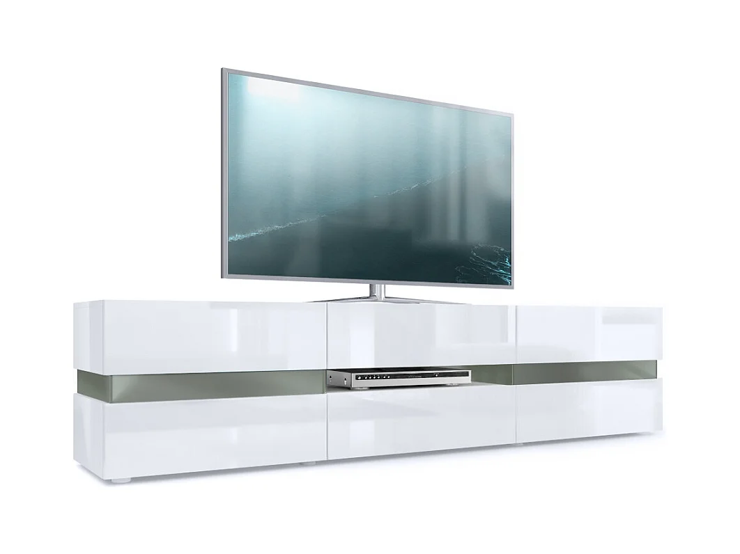 Buffet bas Flow, Meuble TV avec vitre d’ambiance rétroéclairée, 2 portes, 1 tiroir et 1 clapet, Blanc brillant/Blanc brillant (177 x 45 x 39 cm)