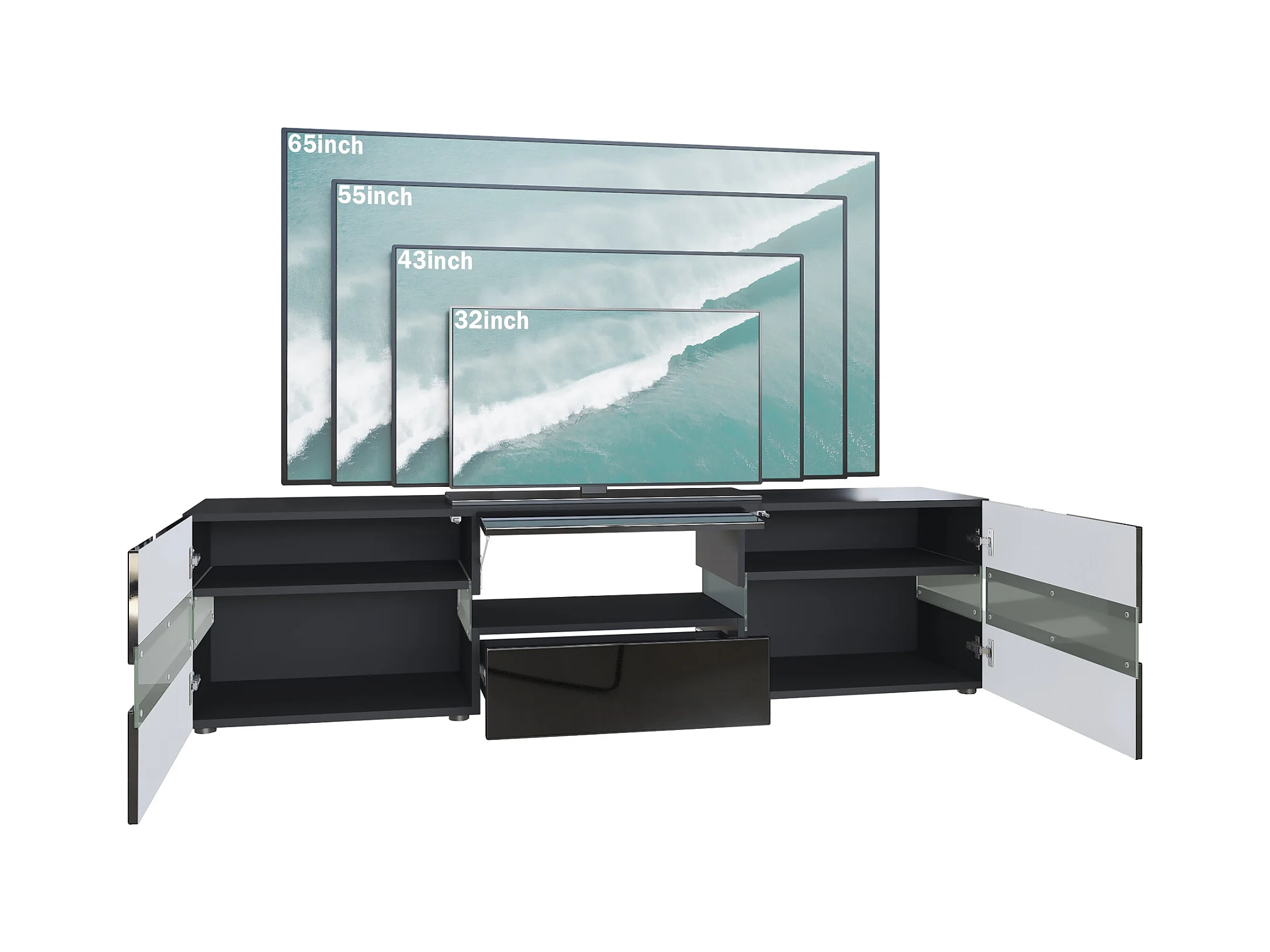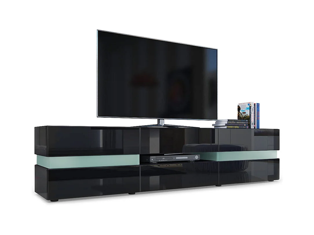 Buffet bas Flow, Meuble TV avec vitre d’ambiance rétroéclairée, 2 portes, 1 tiroir et 1 clapet, Noir haute brillance/Noir haute brillance (177 x 45 x 39 cm)