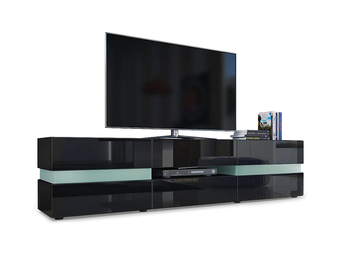 Buffet bas Flow, Meuble TV avec vitre d’ambiance rétroéclairée, 2 portes, 1 tiroir et 1 clapet, Noir mat/Noir haute brillance (177 x 45 x 39 cm)
