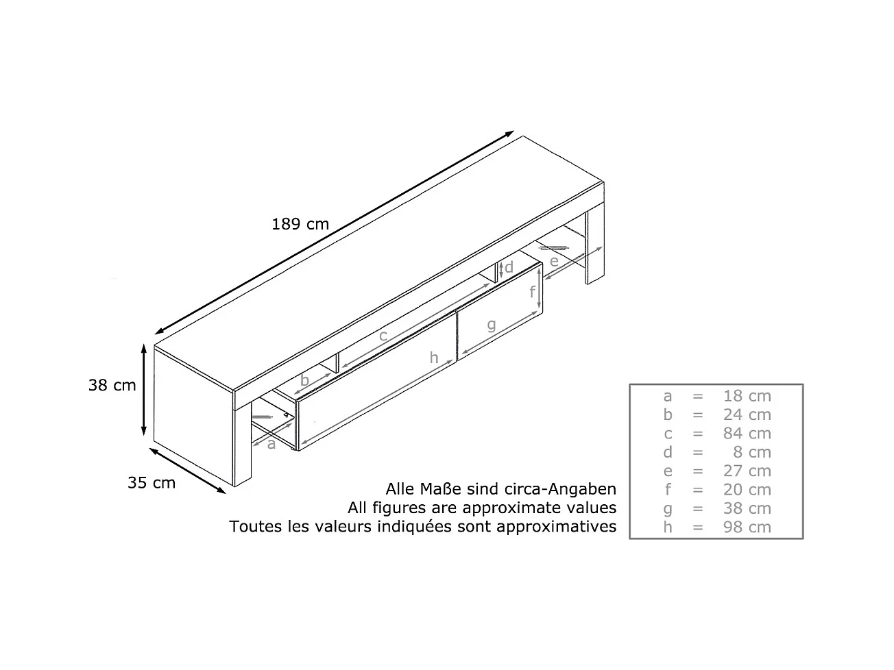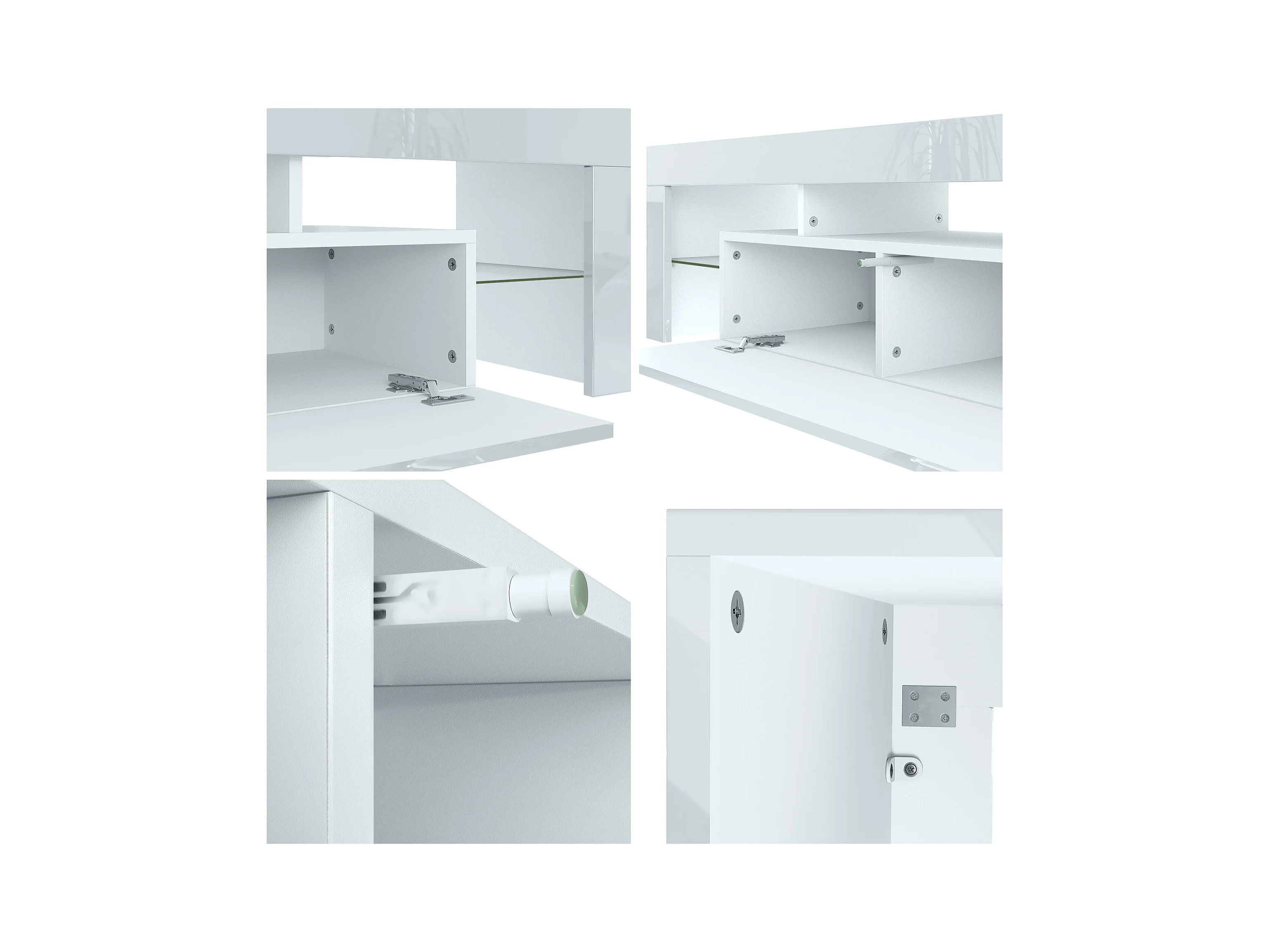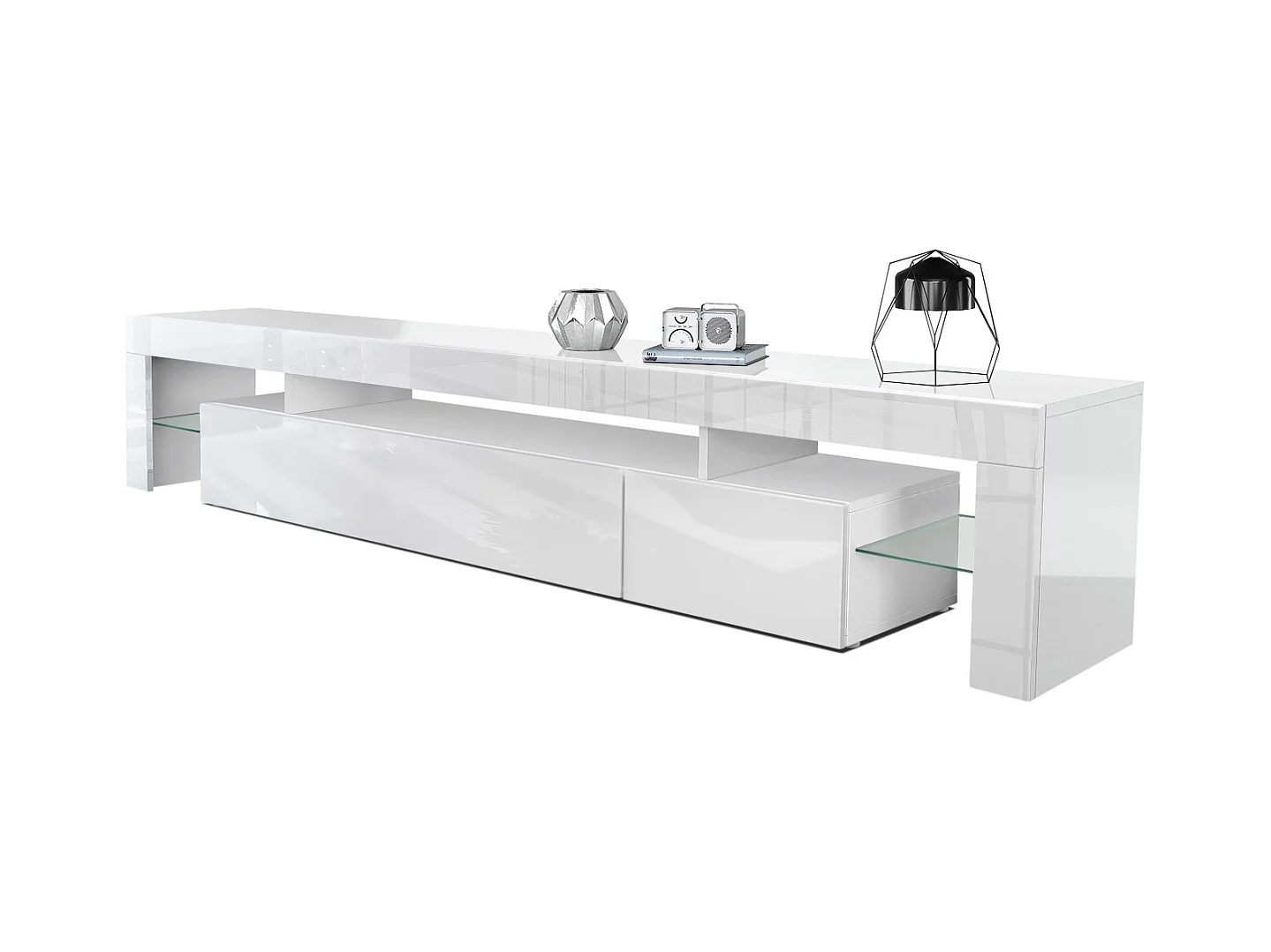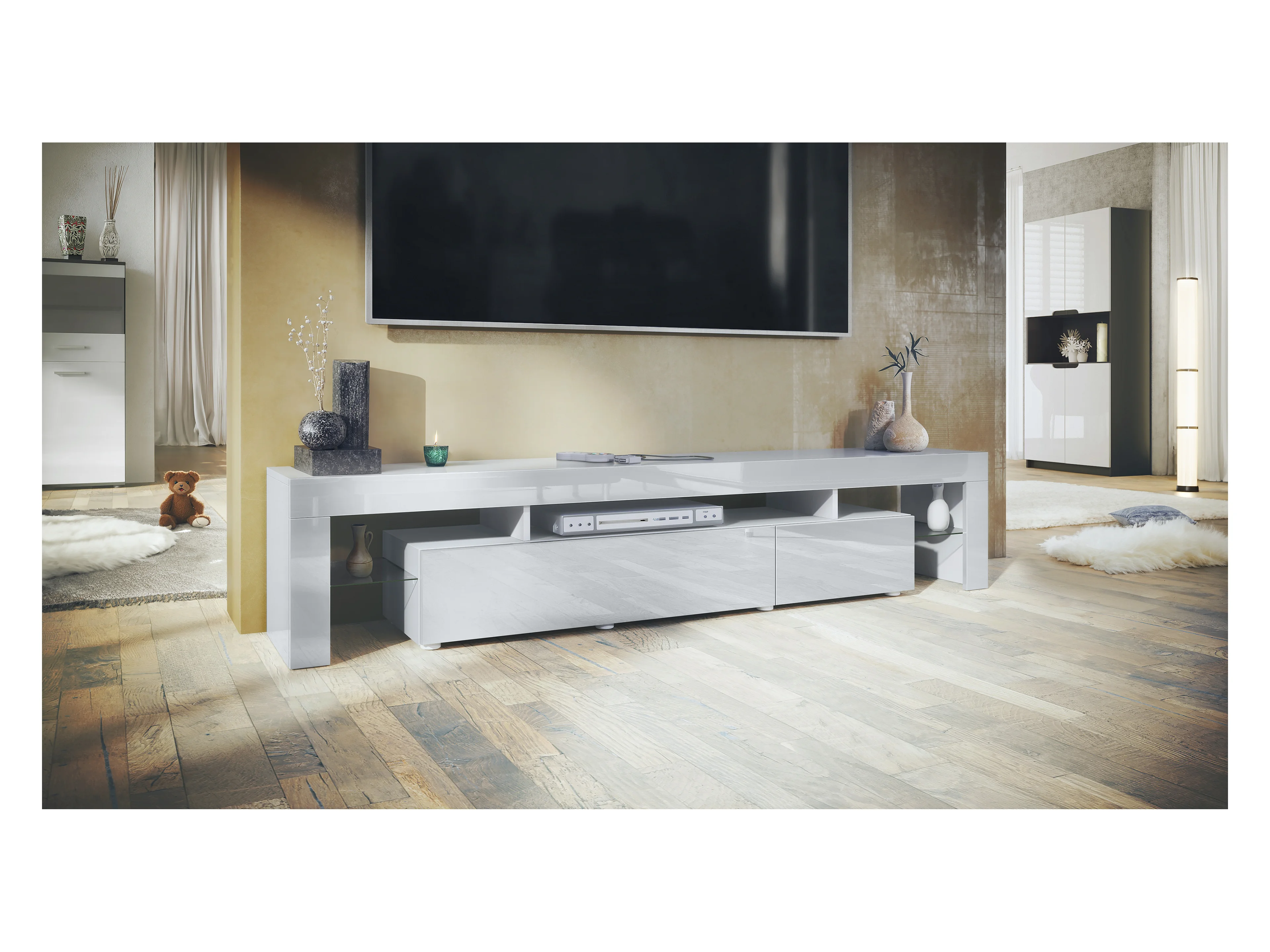 Buffet bas Lima V2, Meuble TV avec 2 clapets, 1 compartiment ouvert et 2 étagères en verre, Blanc haute brillance/Blanc haute brillance (189 x 38 x 35 cm)