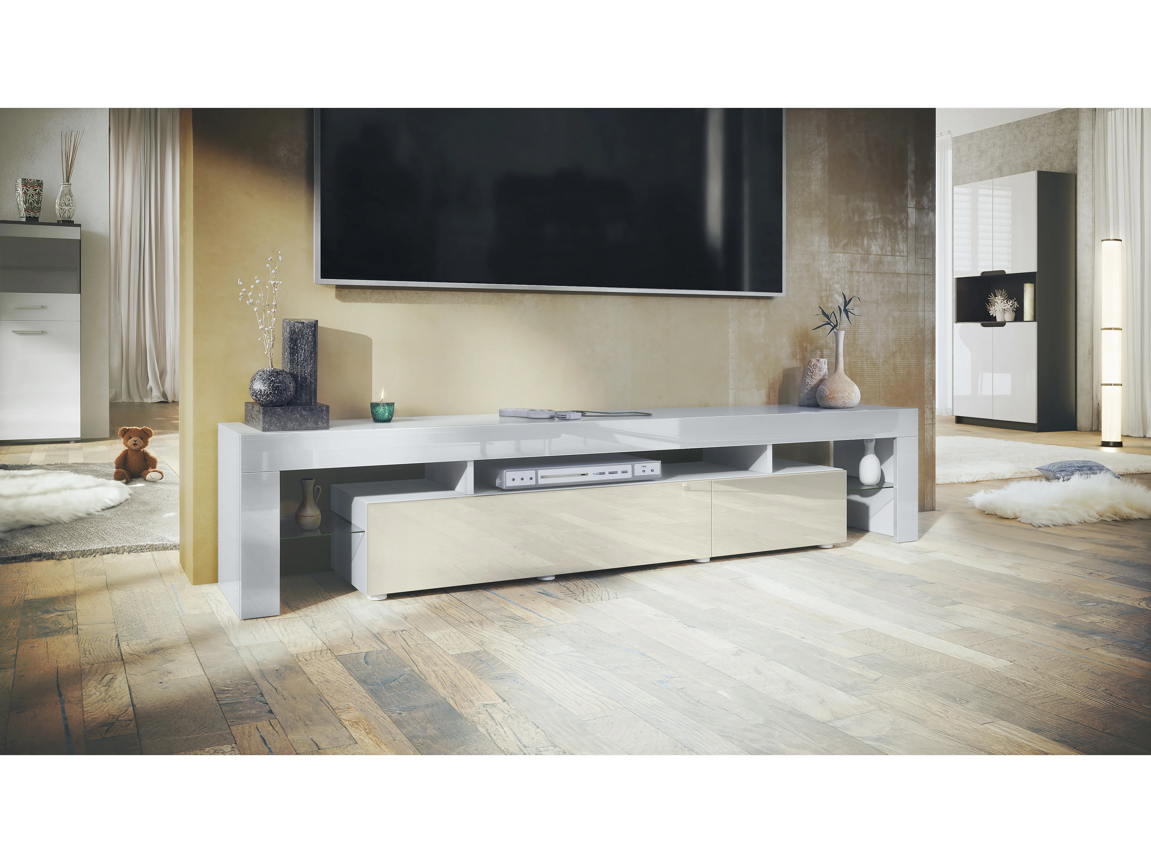 Buffet bas Lima V2, Meuble TV avec 2 clapets, 1 compartiment ouvert et 2 étagères en verre, Blanc haute brillance/Crème haute brillance (189 x 38 x 35 cm)