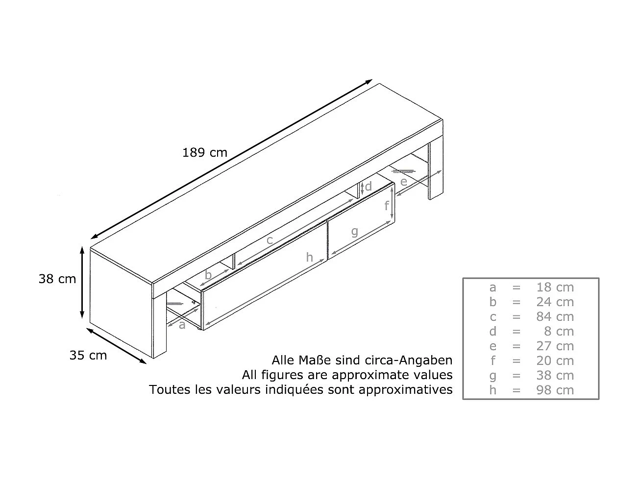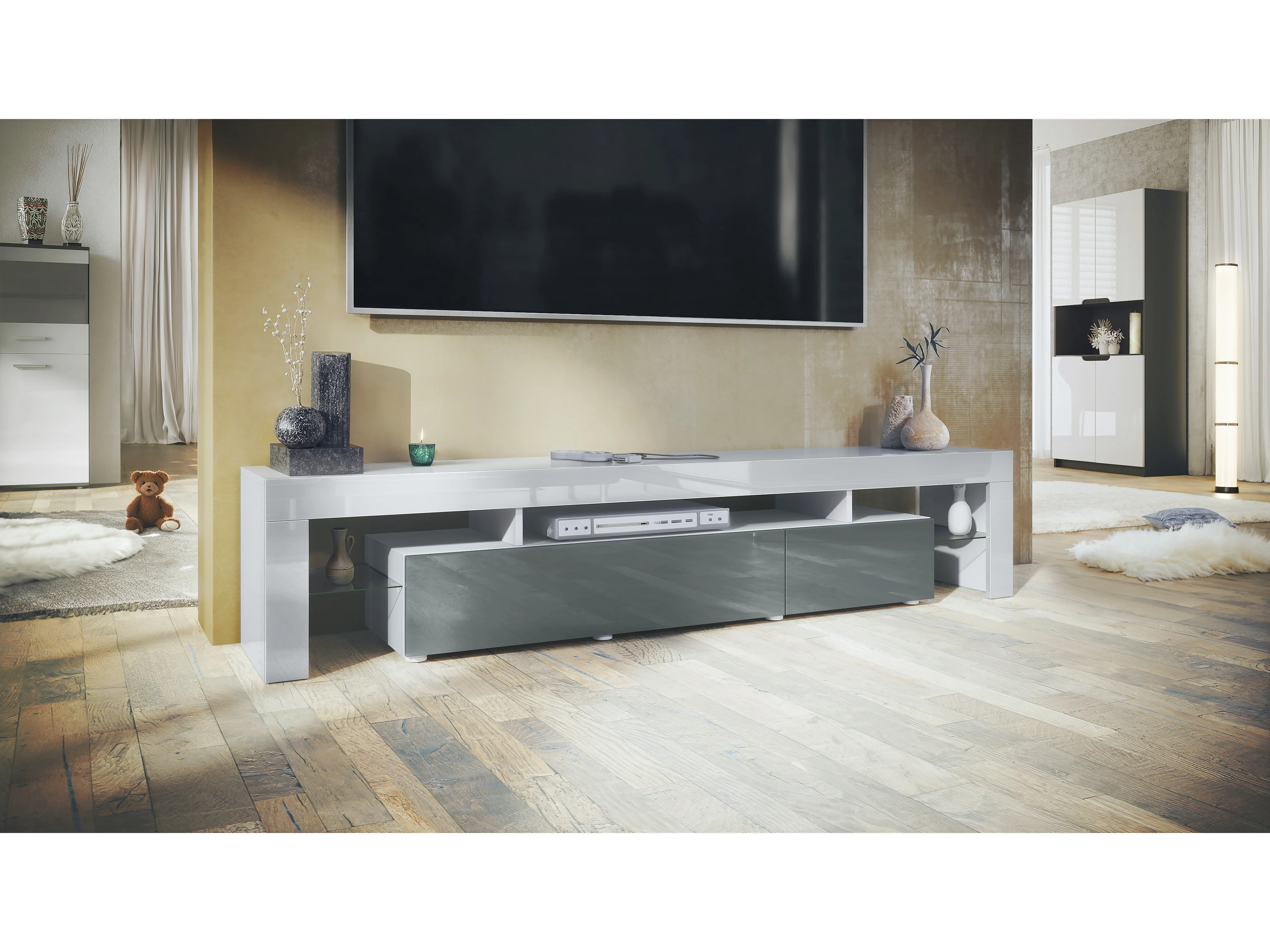 Buffet bas Lima V2, Meuble TV avec 2 clapets, 1 compartiment ouvert et 2 étagères en verre, Blanc haute brillance/Gris haute brillance (189 x 38 x 35 cm)