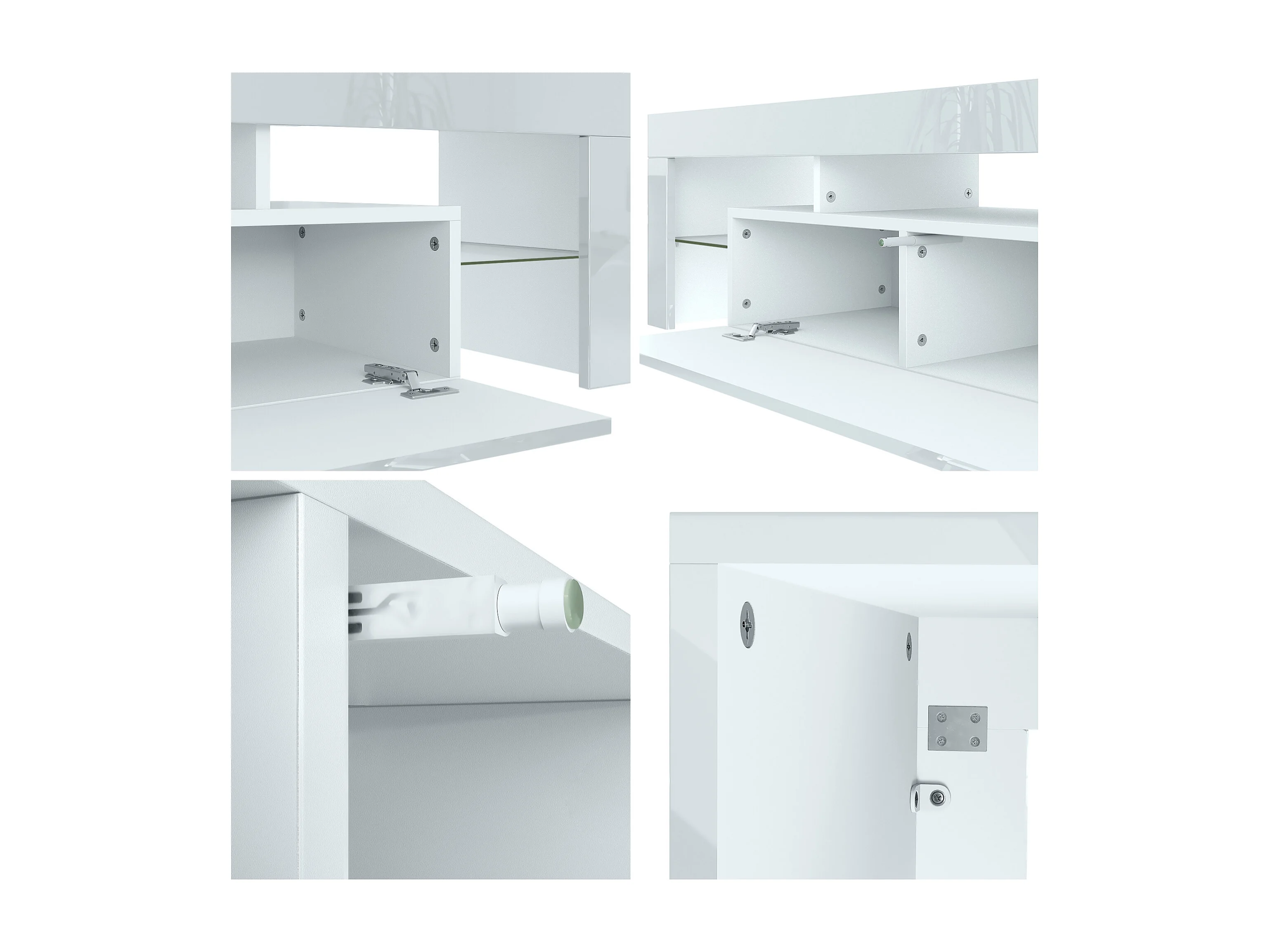 Buffet bas Lima V2, Meuble TV avec 2 clapets, 1 compartiment ouvert et 2 étagères en verre, Blanc haute brillance/Noir haute brillance (189 x 38 x 35 cm)