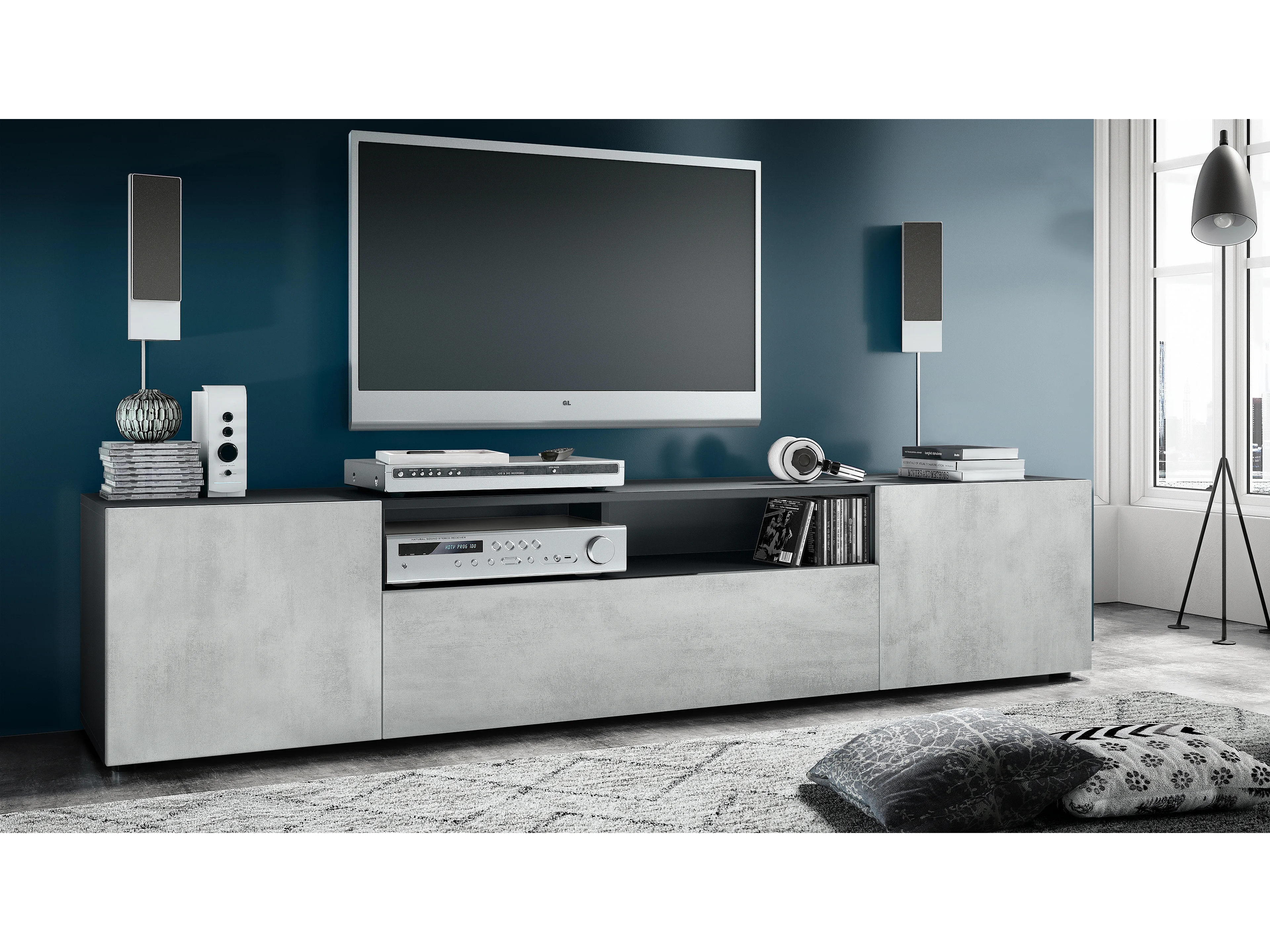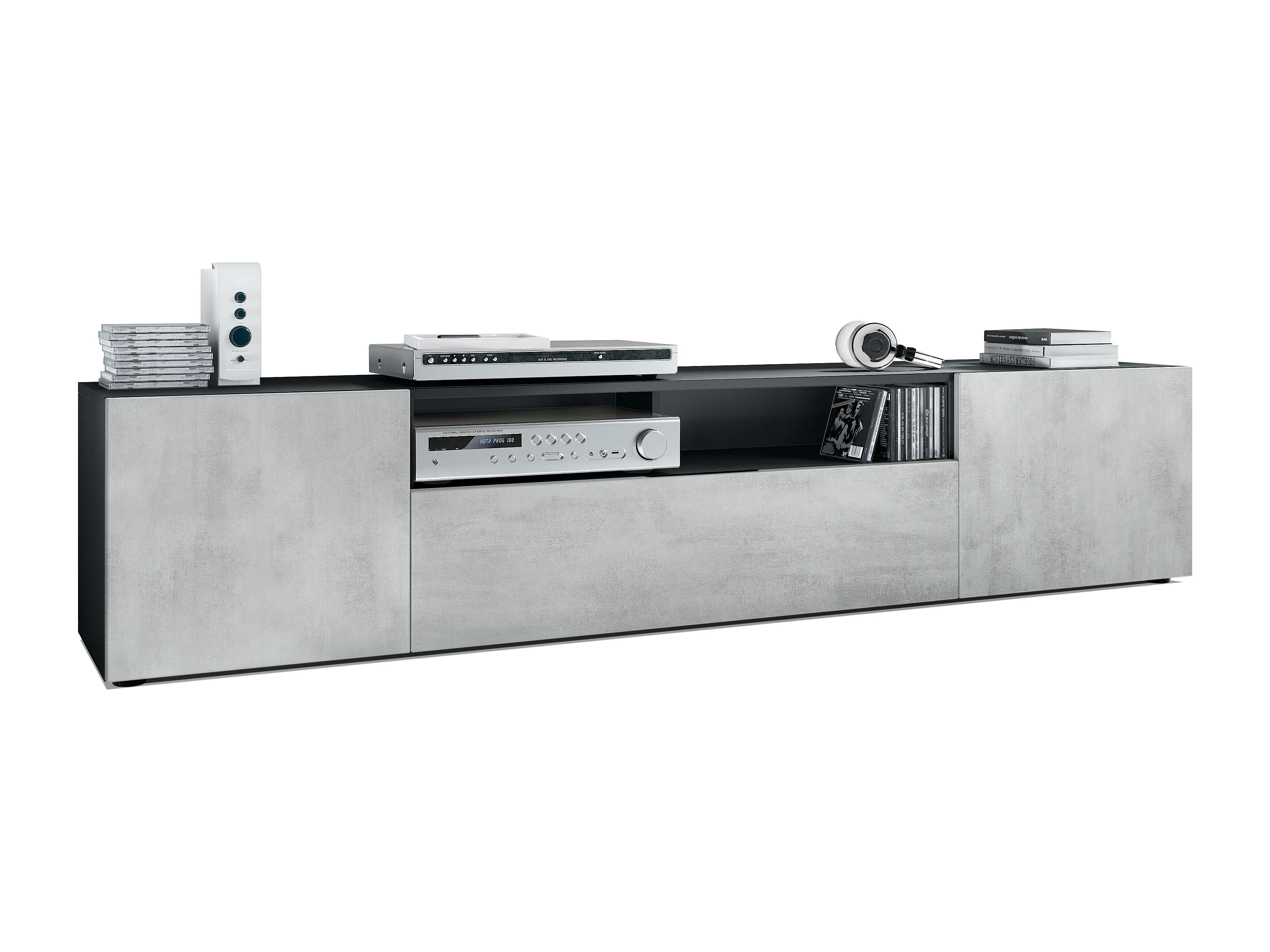 Buffet bas Mogan, Meuble TV avec 2 portes, 1 clapet et 1 compartiment ouvert, Noir mat/Aspect Béton Oxyde (181 x 39 x 35 cm)