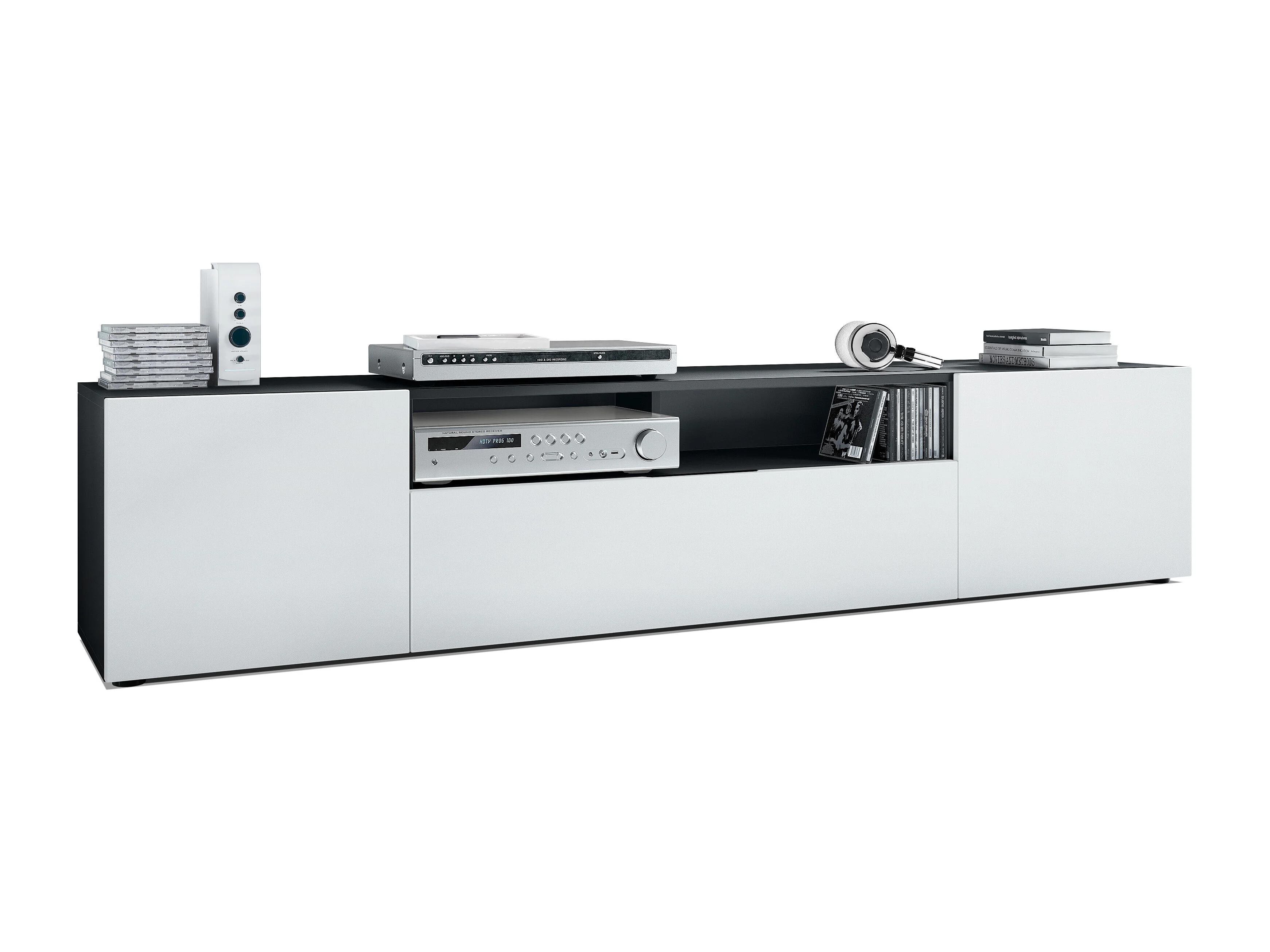 Buffet bas Mogan, Meuble TV avec 2 portes, 1 clapet et 1 compartiment ouvert, Noir mat/Blanc mat (181 x 39 x 35 cm)