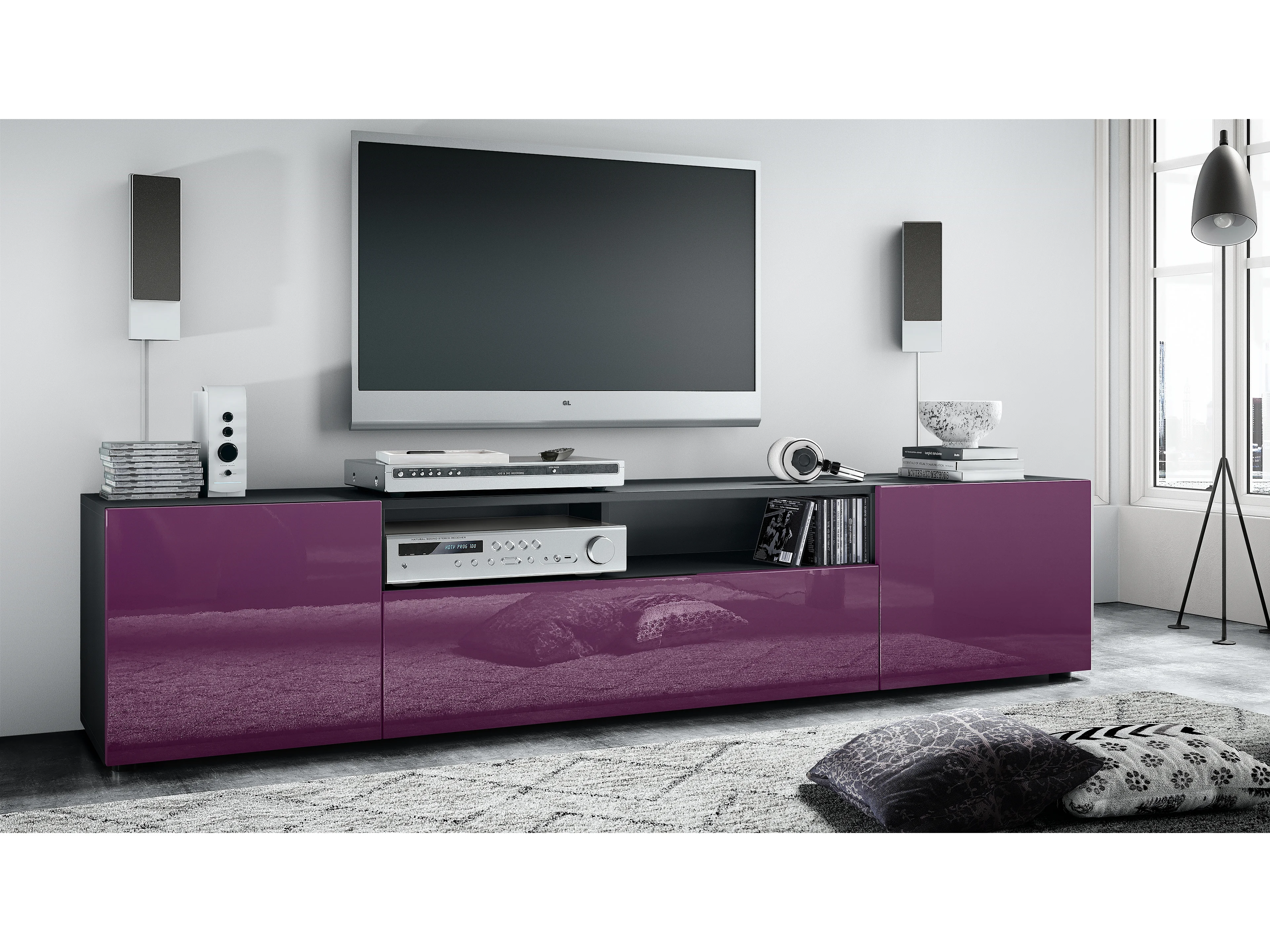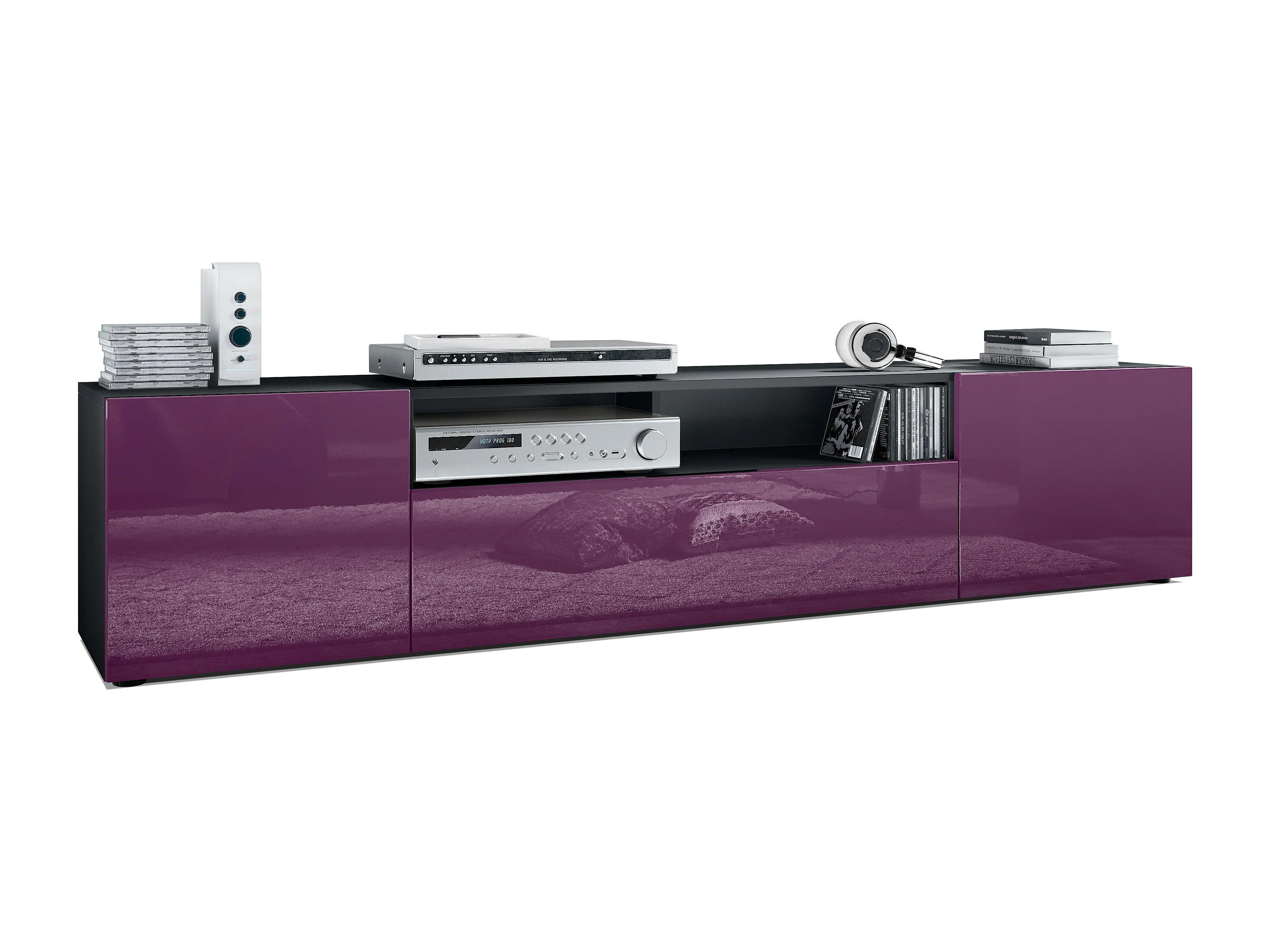 Buffet bas Mogan, Meuble TV avec 2 portes, 1 clapet et 1 compartiment ouvert, Noir mat/Mûre haute brillance (181 x 39 x 35 cm)