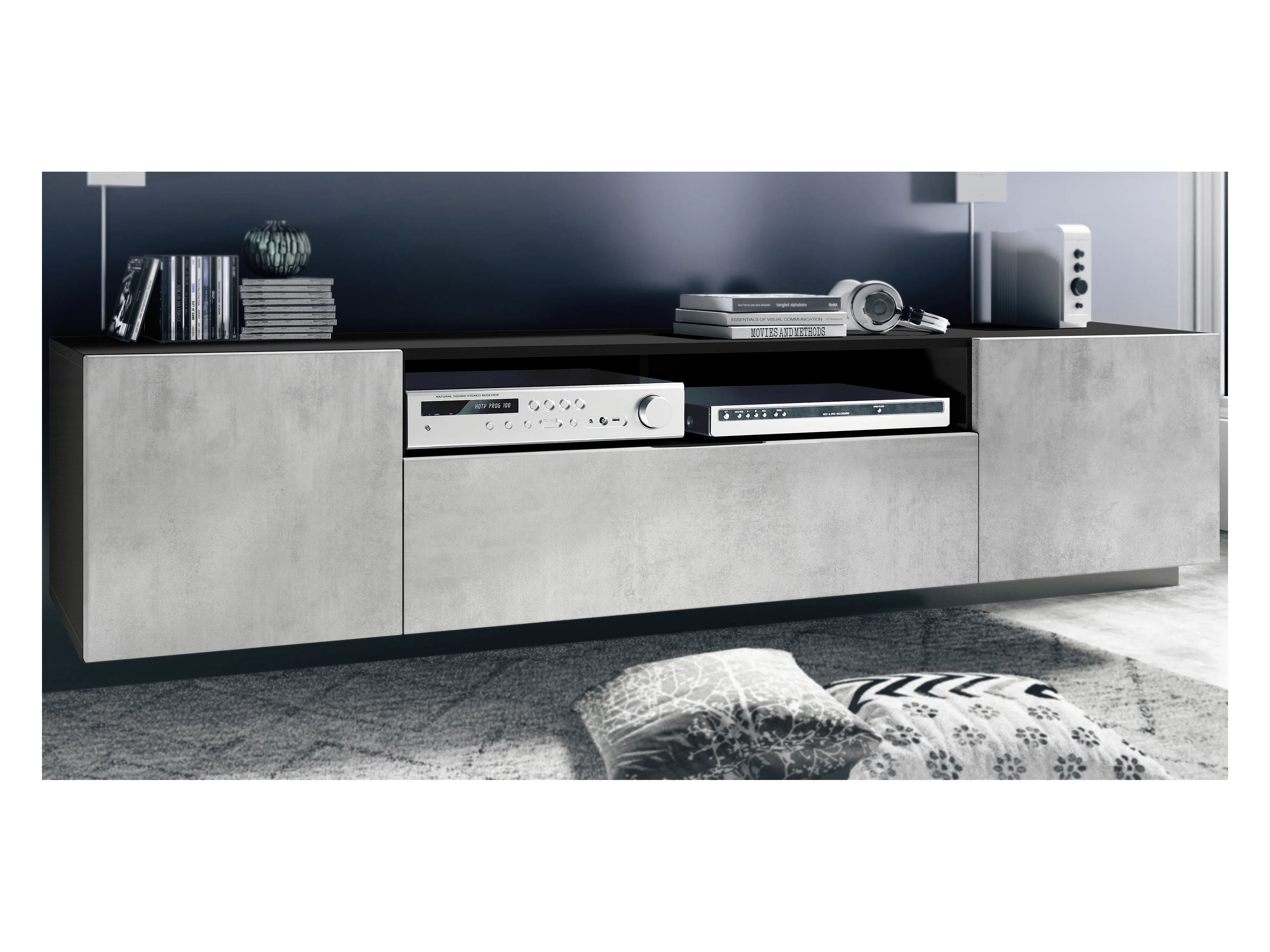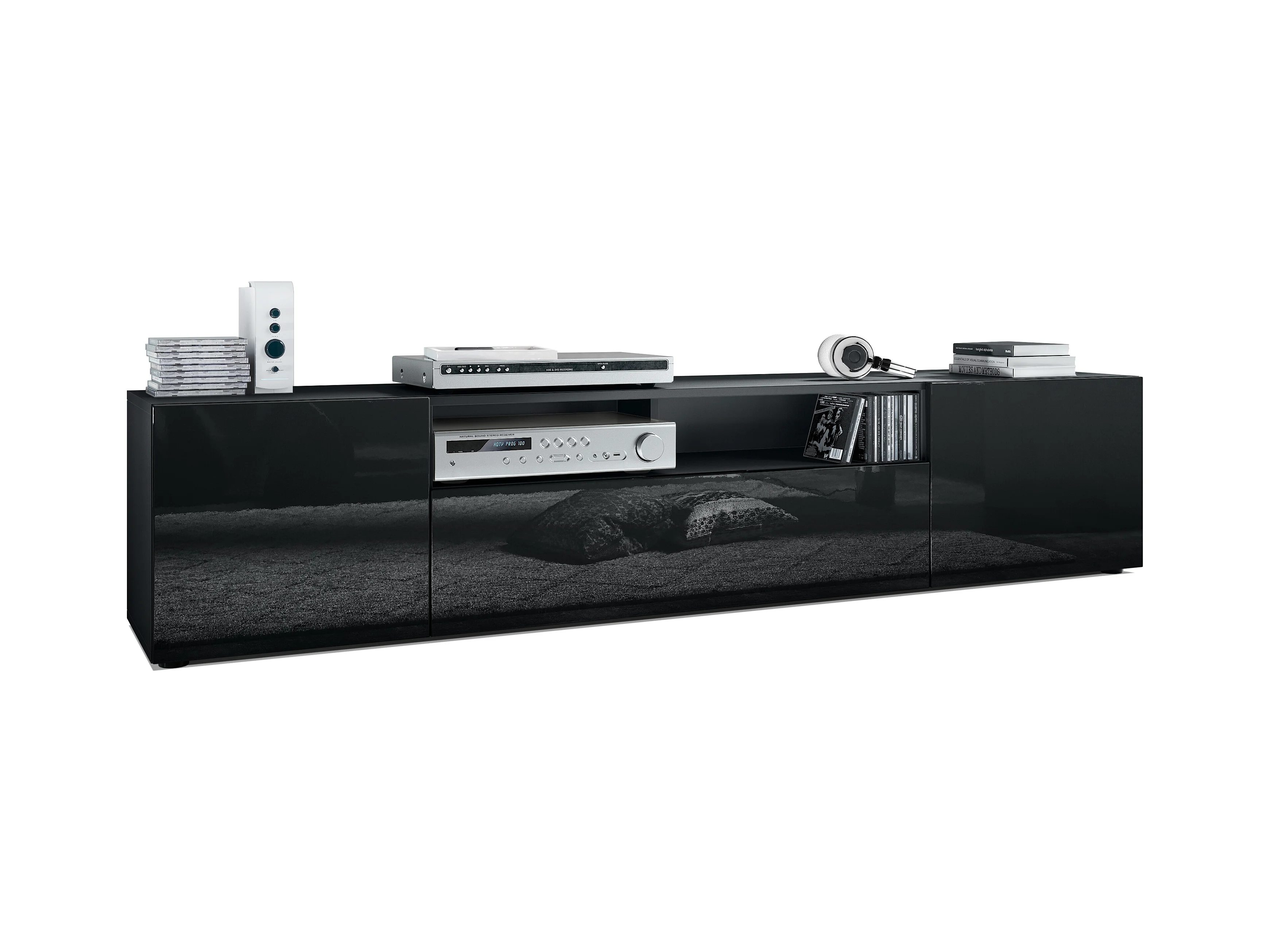 Buffet bas Mogan, Meuble TV avec 2 portes, 1 clapet et 1 compartiment ouvert, Noir mat/Noir haute brillance (181 x 39 x 35 cm)