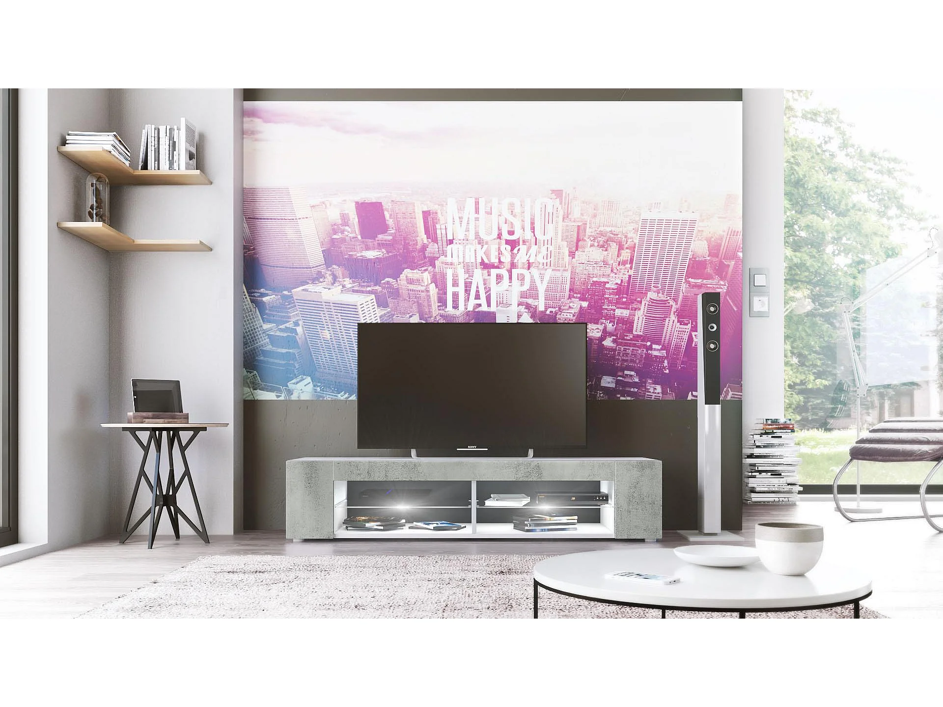Buffet bas Movie, Meuble TV avec 4 compartiments ouverts et placages décoratifs, Blanc mat/Aspect Béton Oxyde, éclairage LED blanc inclus (134 x 29 x 39 cm)