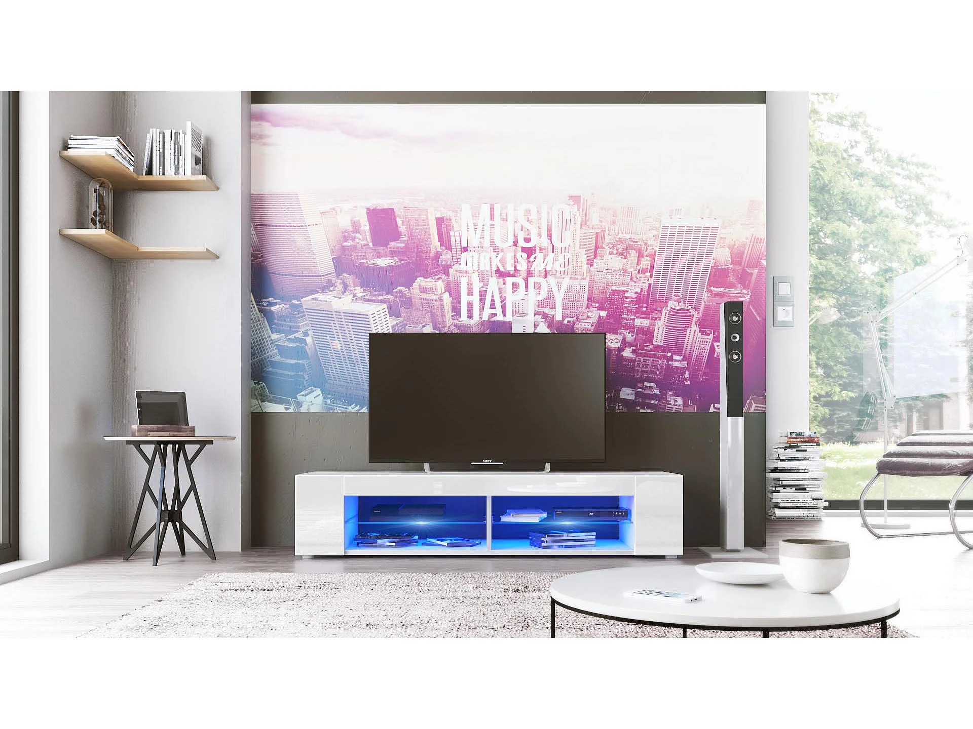 Buffet bas Movie, Meuble TV avec 4 compartiments ouverts et placages décoratifs, Blanc mat/Blanc brillant, éclairage LED bleu inclus (134 x 29 x 39 cm)