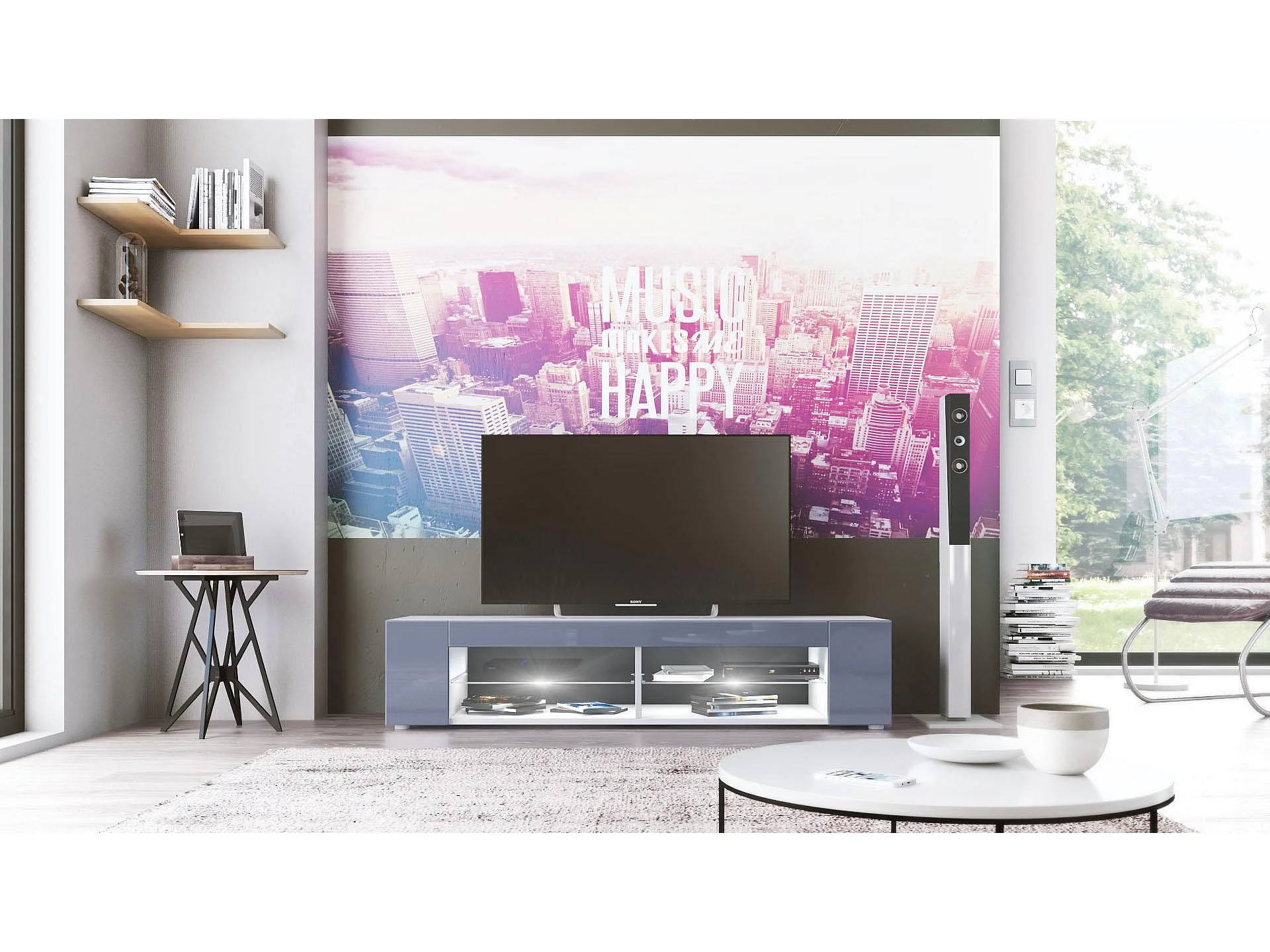 Buffet bas Movie, Meuble TV avec 4 compartiments ouverts et placages décoratifs, Blanc mat/Gris brillant, éclairage LED blanc inclus (134 x 29 x 39 cm)