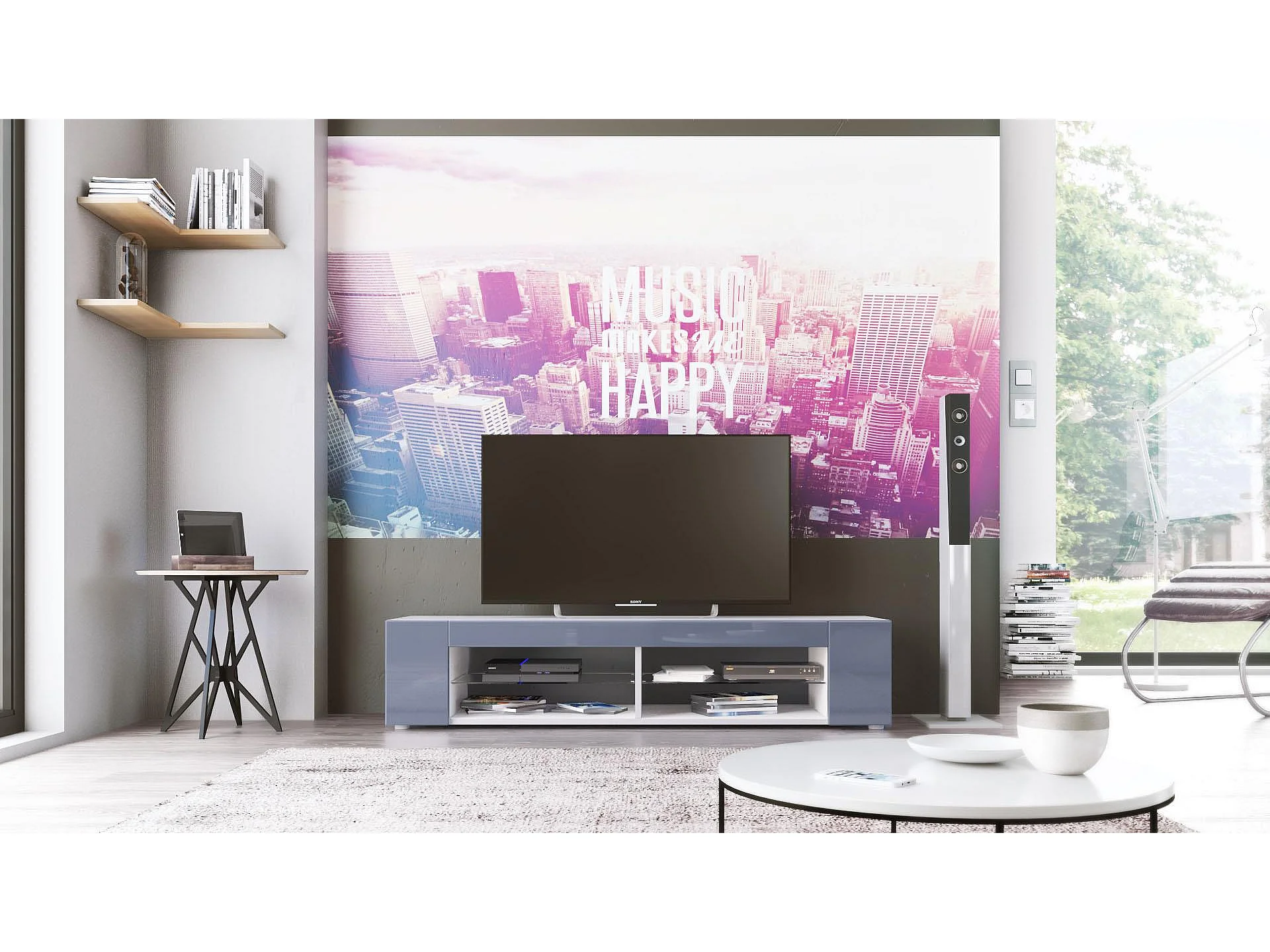 Buffet bas Movie, Meuble TV avec 4 compartiments ouverts et placages décoratifs, Blanc mat/Gris haute brillance (134 x 29 x 39 cm)