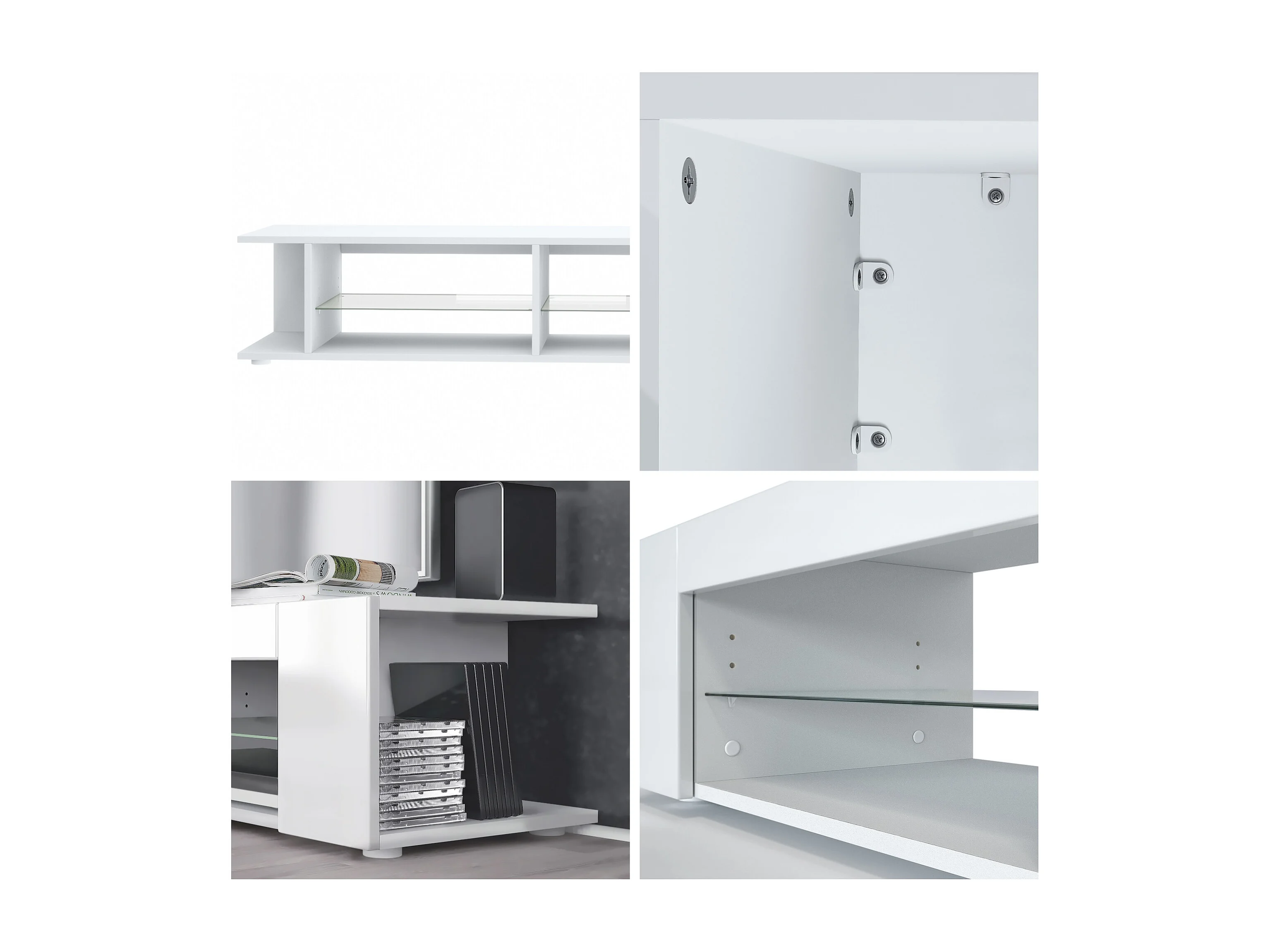 Buffet bas Movie, Meuble TV avec 4 compartiments ouverts et placages décoratifs, Blanc mat/Noir brillant, éclairage LED blanc inclus (134 x 29 x 39 cm)