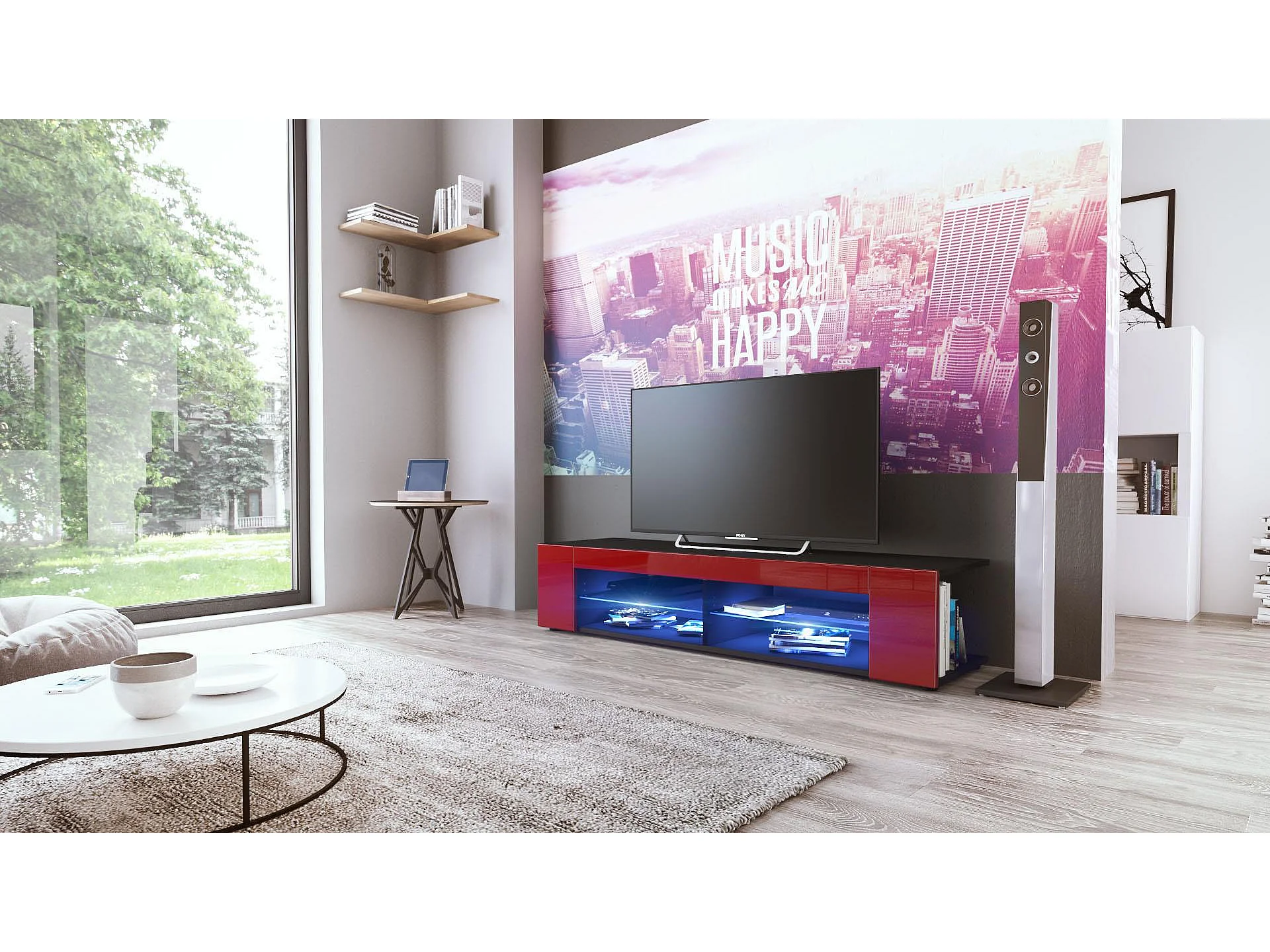 Buffet bas Movie, Meuble TV avec 4 compartiments ouverts et placages décoratifs, Noir mat/Bordeaux brillant, éclairage LED bleu inclus (134 x 29 x 39 cm)