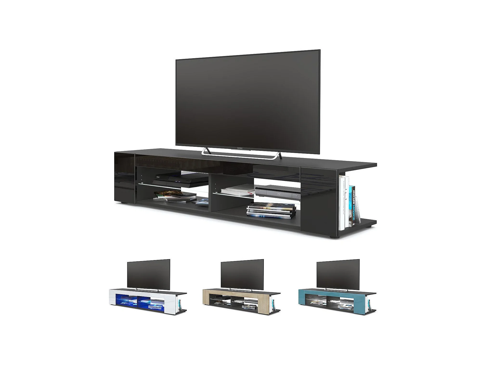 Buffet bas Movie, Meuble TV avec 4 compartiments ouverts et placages décoratifs, Noir mat/Gris haute brillance (134 x 29 x 39 cm)