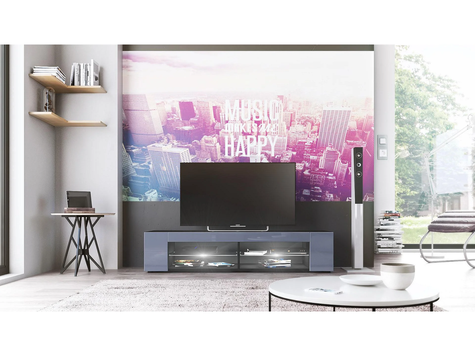 Buffet bas Movie, Meuble TV avec 4 compartiments ouverts et placages décoratifs, Noir mat/Gris haute brillance, éclairage LED blanc inclus (134 x 29 x 39 cm)