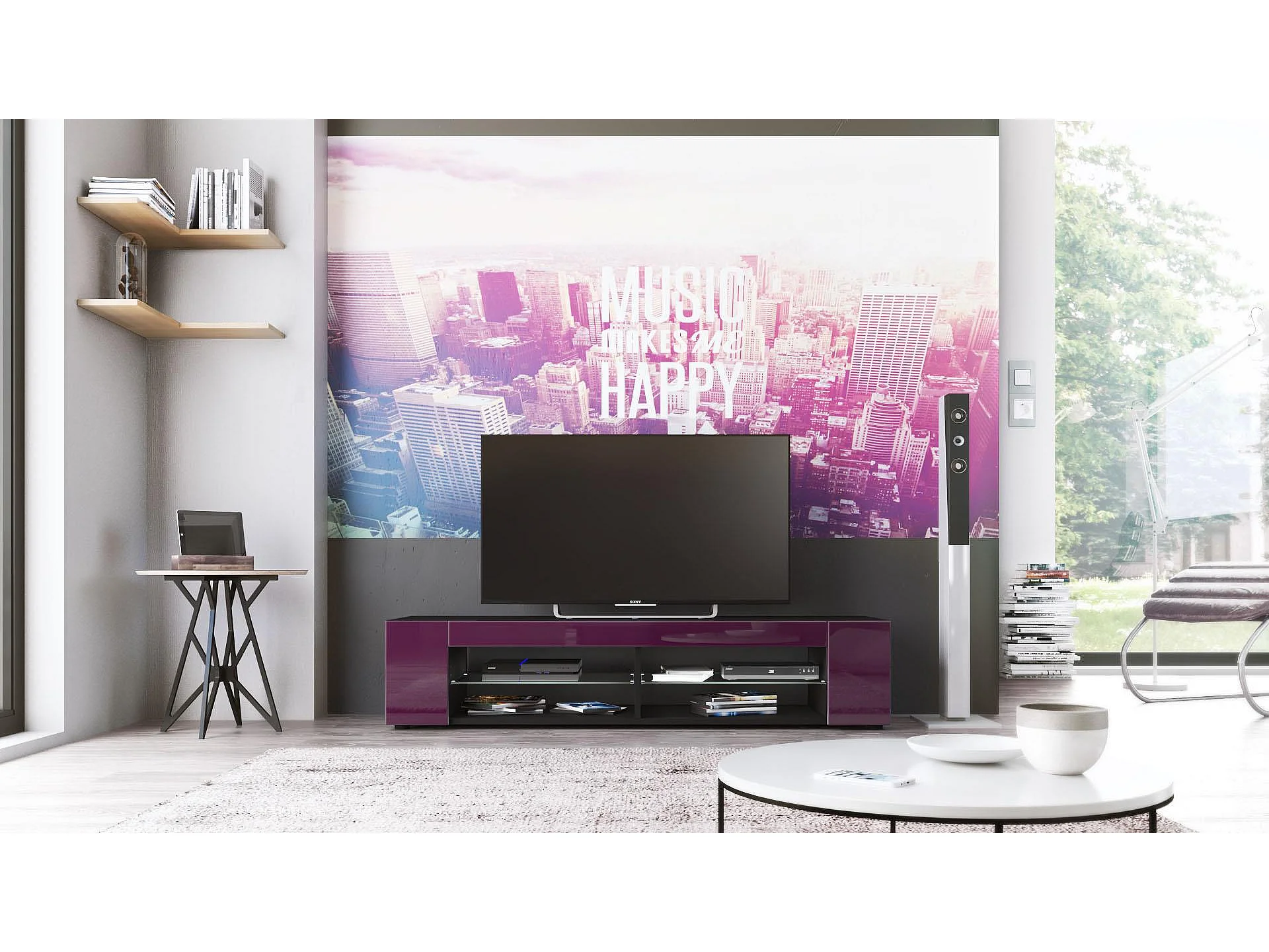 Buffet bas Movie, Meuble TV avec 4 compartiments ouverts et placages décoratifs, Noir mat/Mûre haute brillance (134 x 29 x 39 cm)