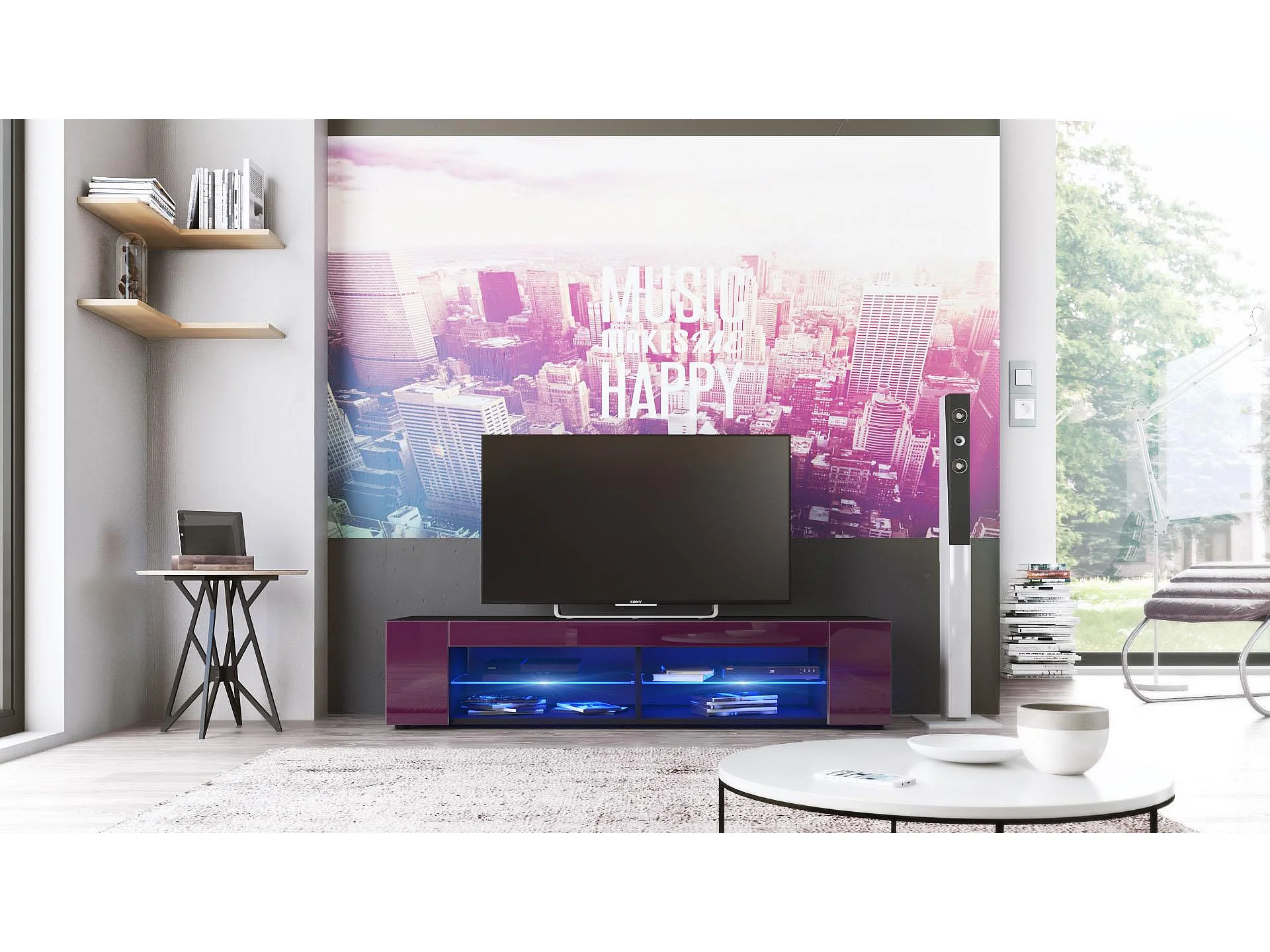 Buffet bas Movie, Meuble TV avec 4 compartiments ouverts et placages décoratifs, Noir mat/Mûre haute brillance, éclairage LED bleu inclus (134 x 29 x 39 cm)