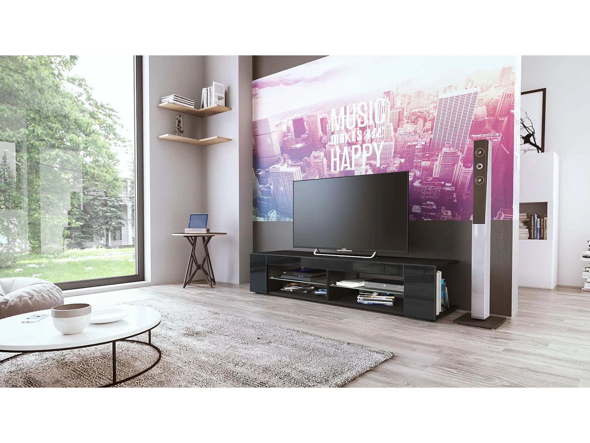 Buffet bas Movie, Meuble TV avec 4 compartiments ouverts et placages décoratifs, Noir mat/Noir haute brillance (134 x 29 x 39 cm)